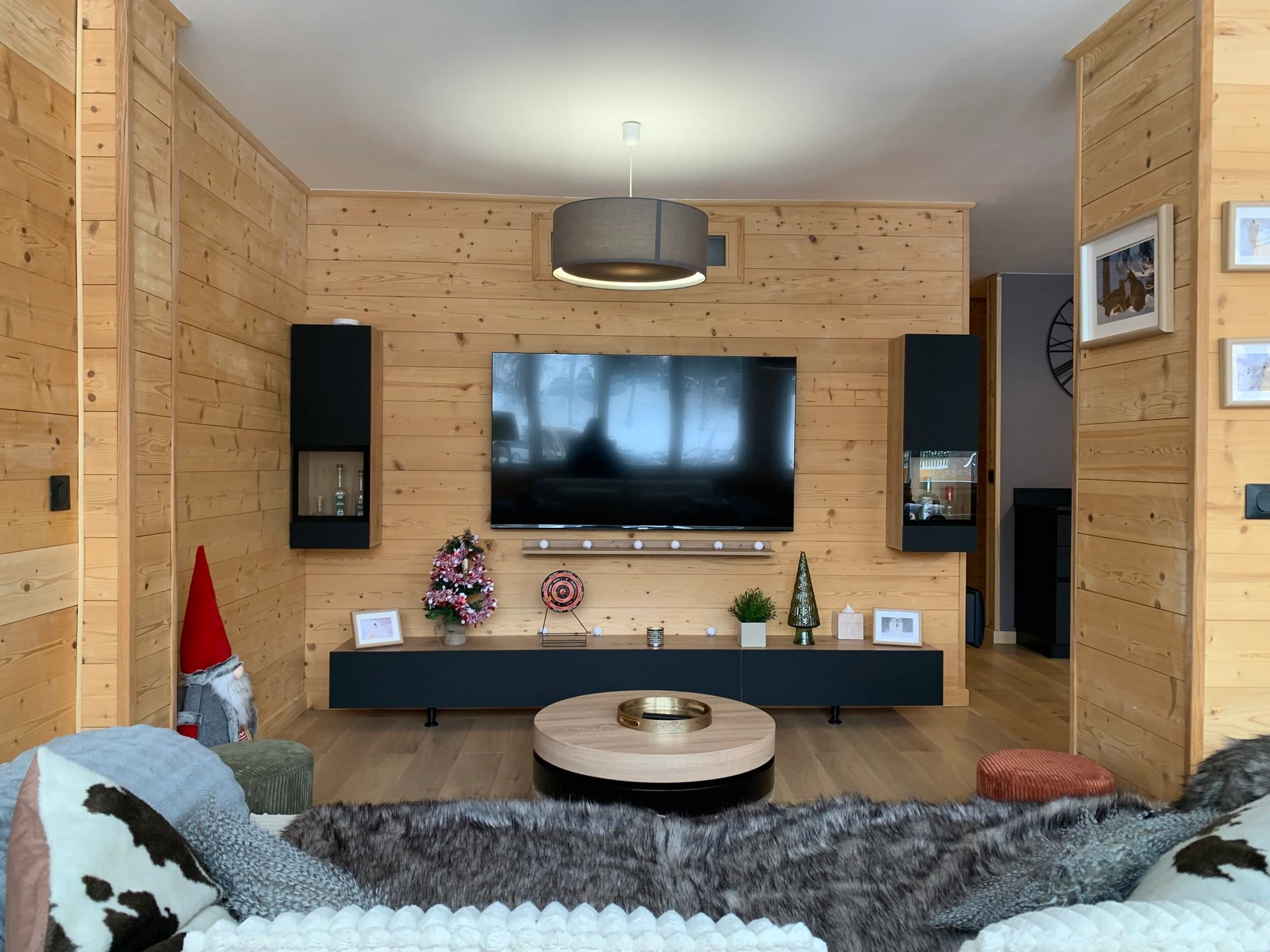 * Séjour : un joli canapé avec une assise profonde non convertible, téléviseur écran plat, beaux meubles en bois, coin repas,