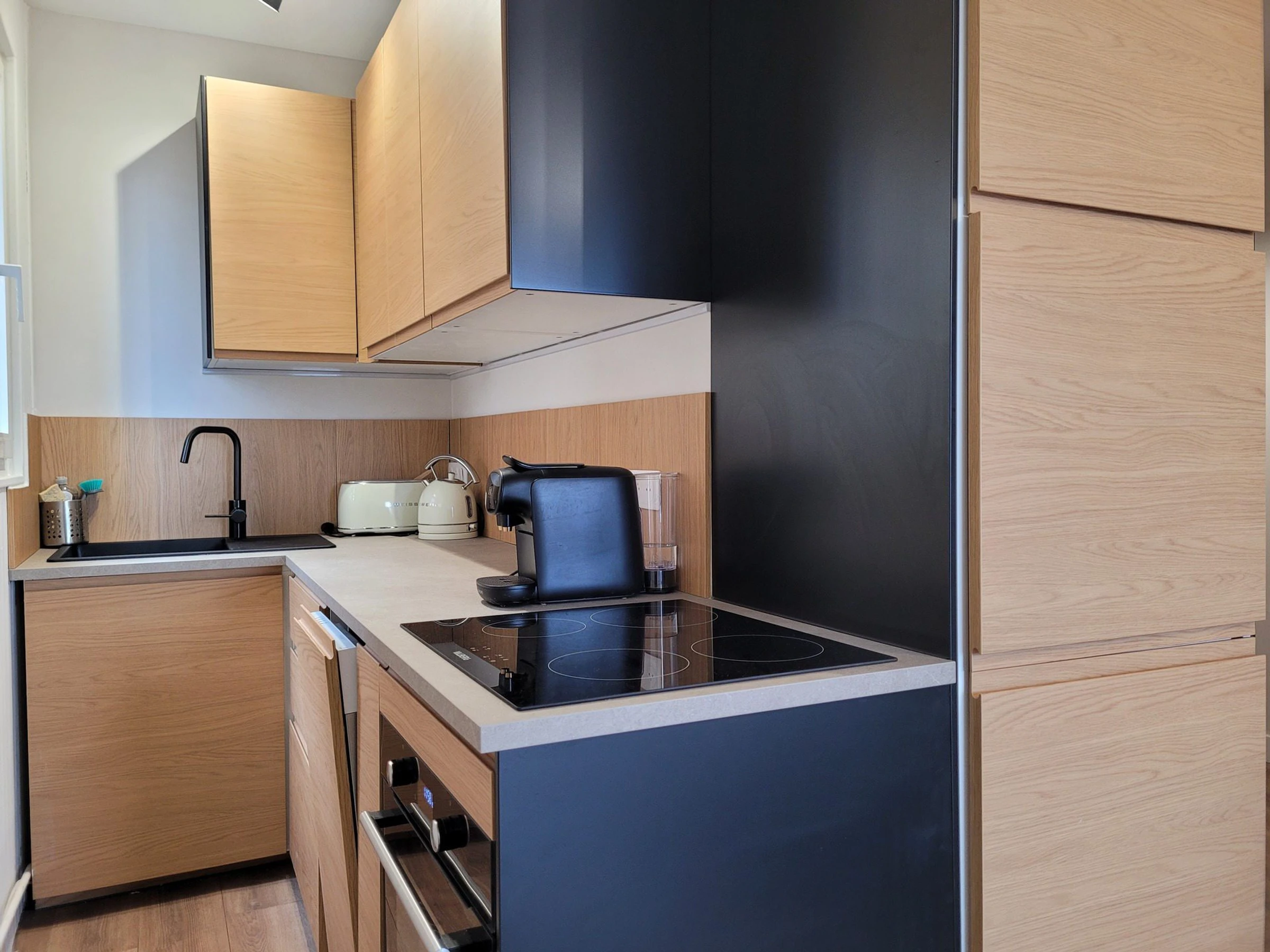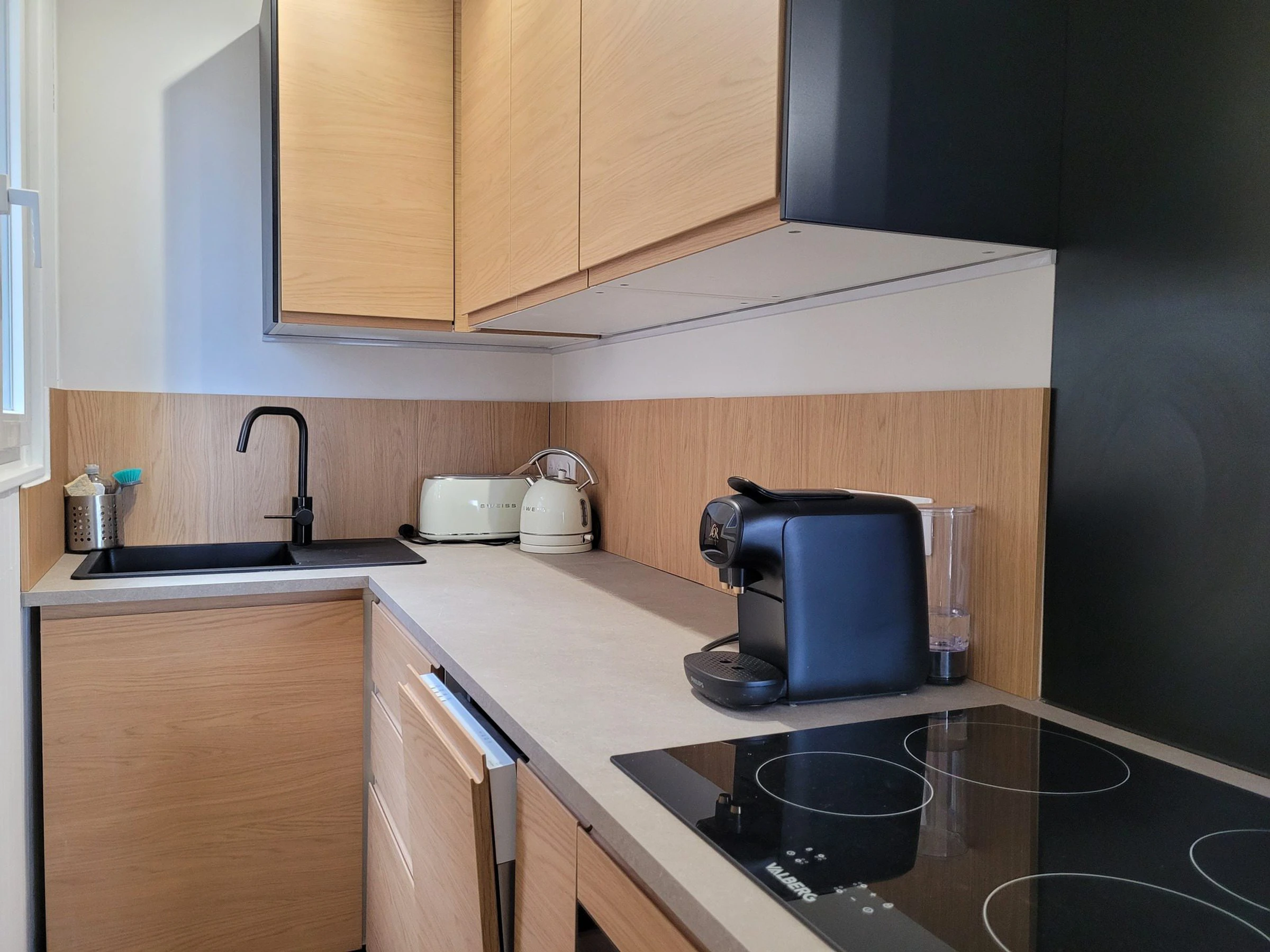 * Coin cuisine : 4 plaques induction, Four, lave vaisselle, réfrigérateur, micro-ondes, cafetière nespresso, grille pain, bouilloire, appareil à raclette/crêpes ;