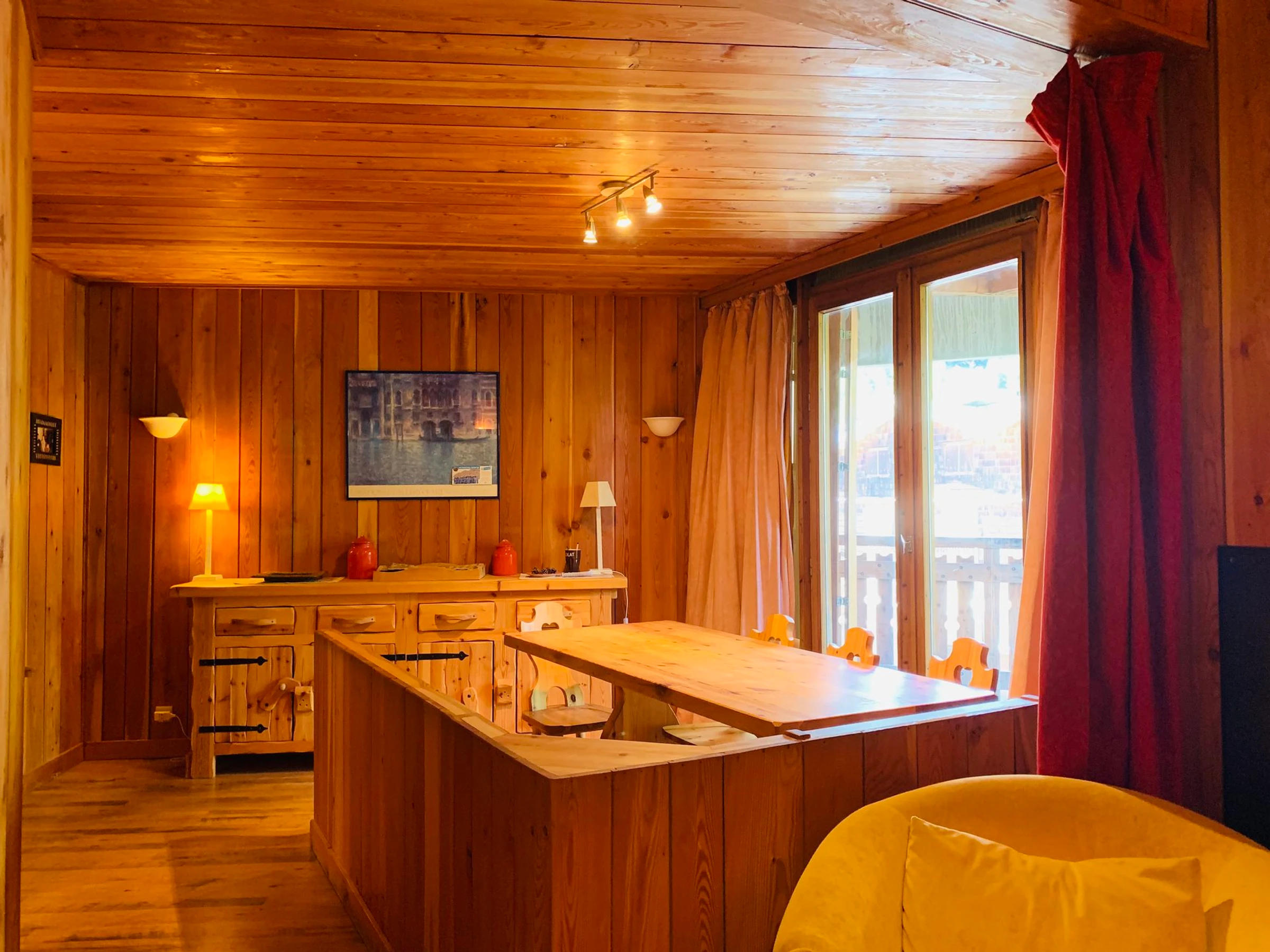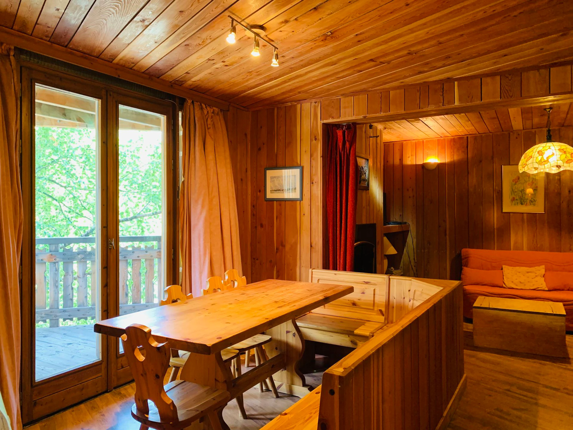 * Séjour : salle à manger, grande table avec banquette d'angle en bois, commode en bois, accès balcon ;