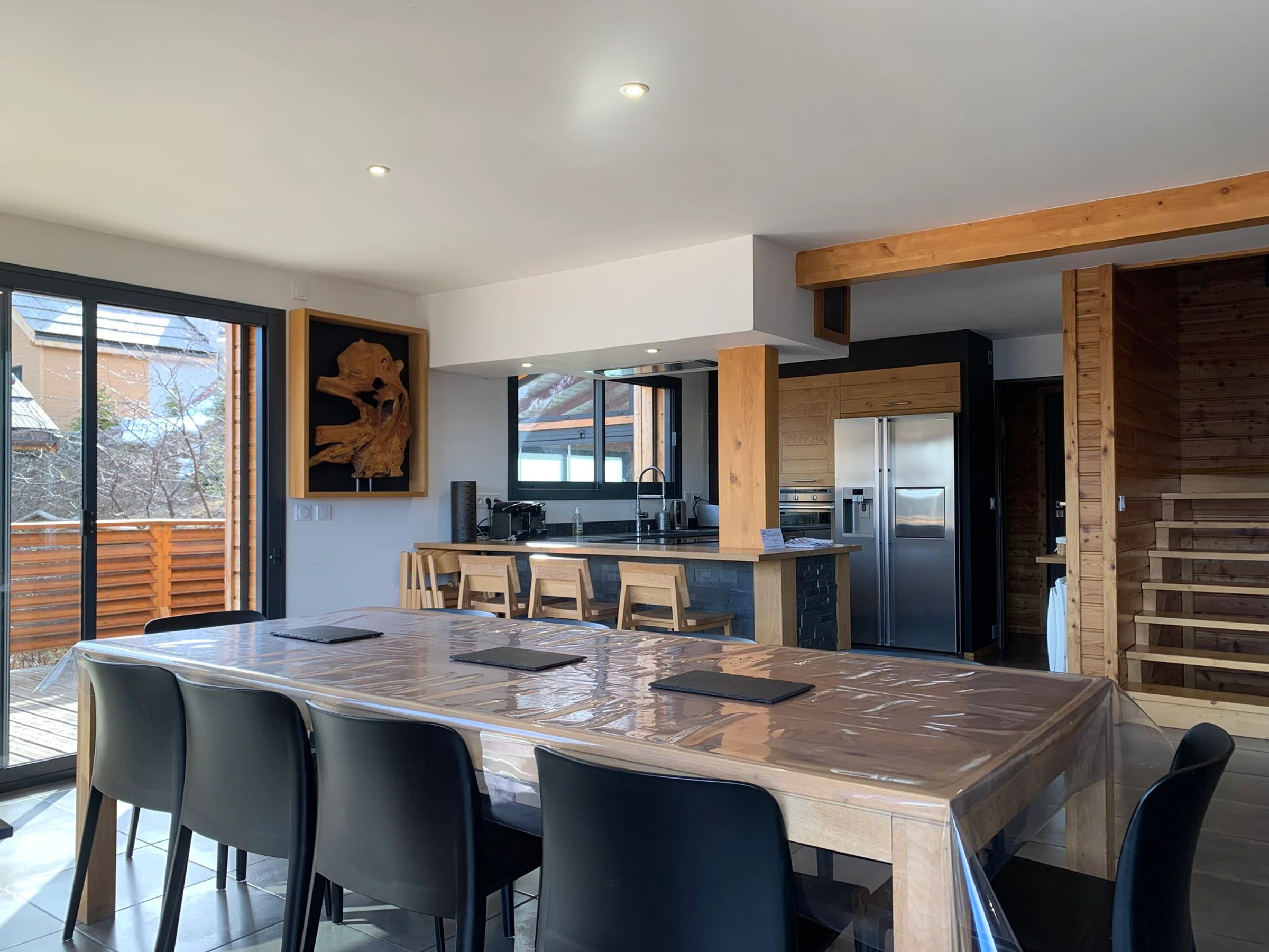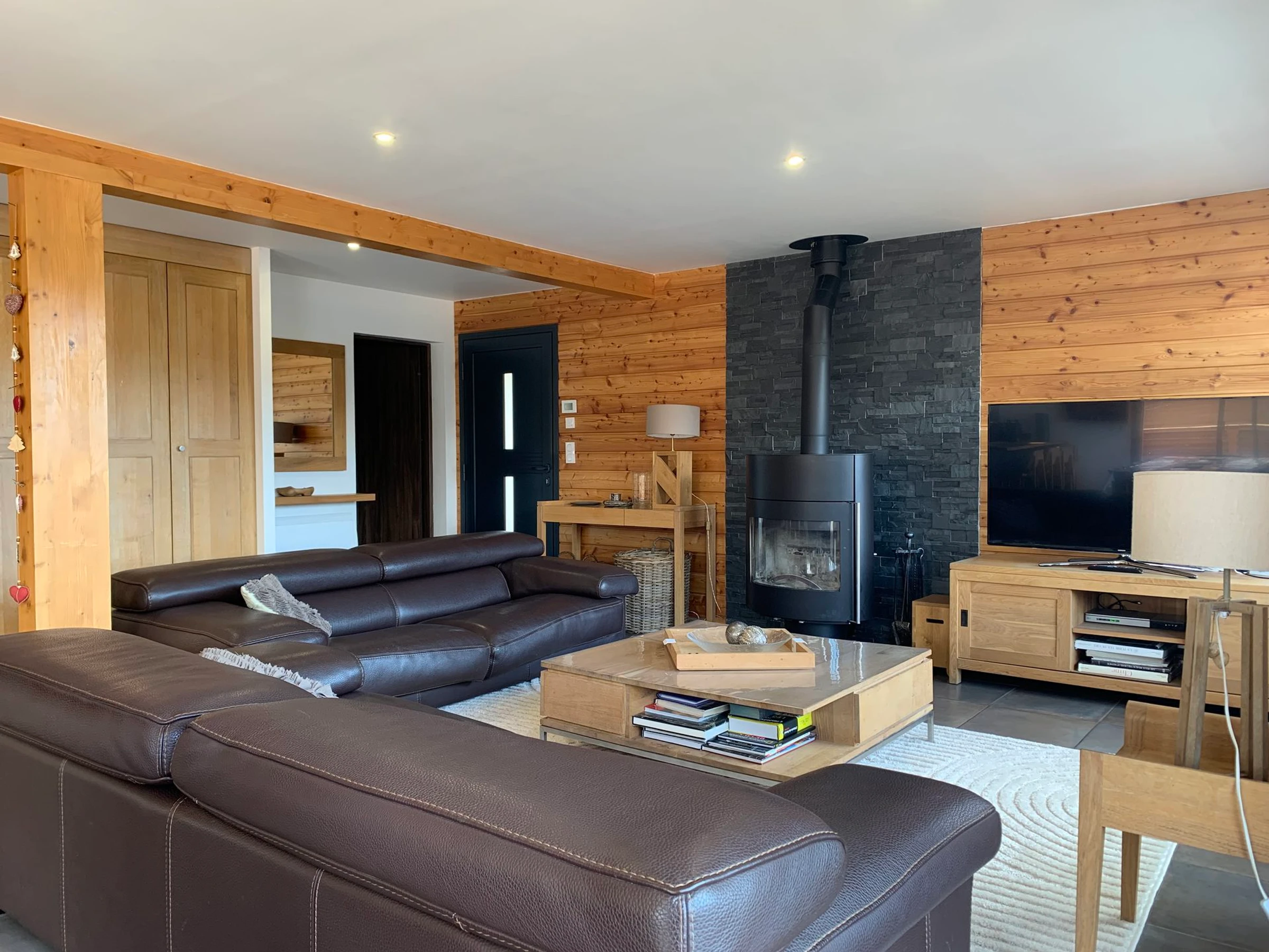 * Séjour / Salon spacieux : TV en HD, poêle à bois, canapés cuir, table basse, accès terrasse - solarium ;