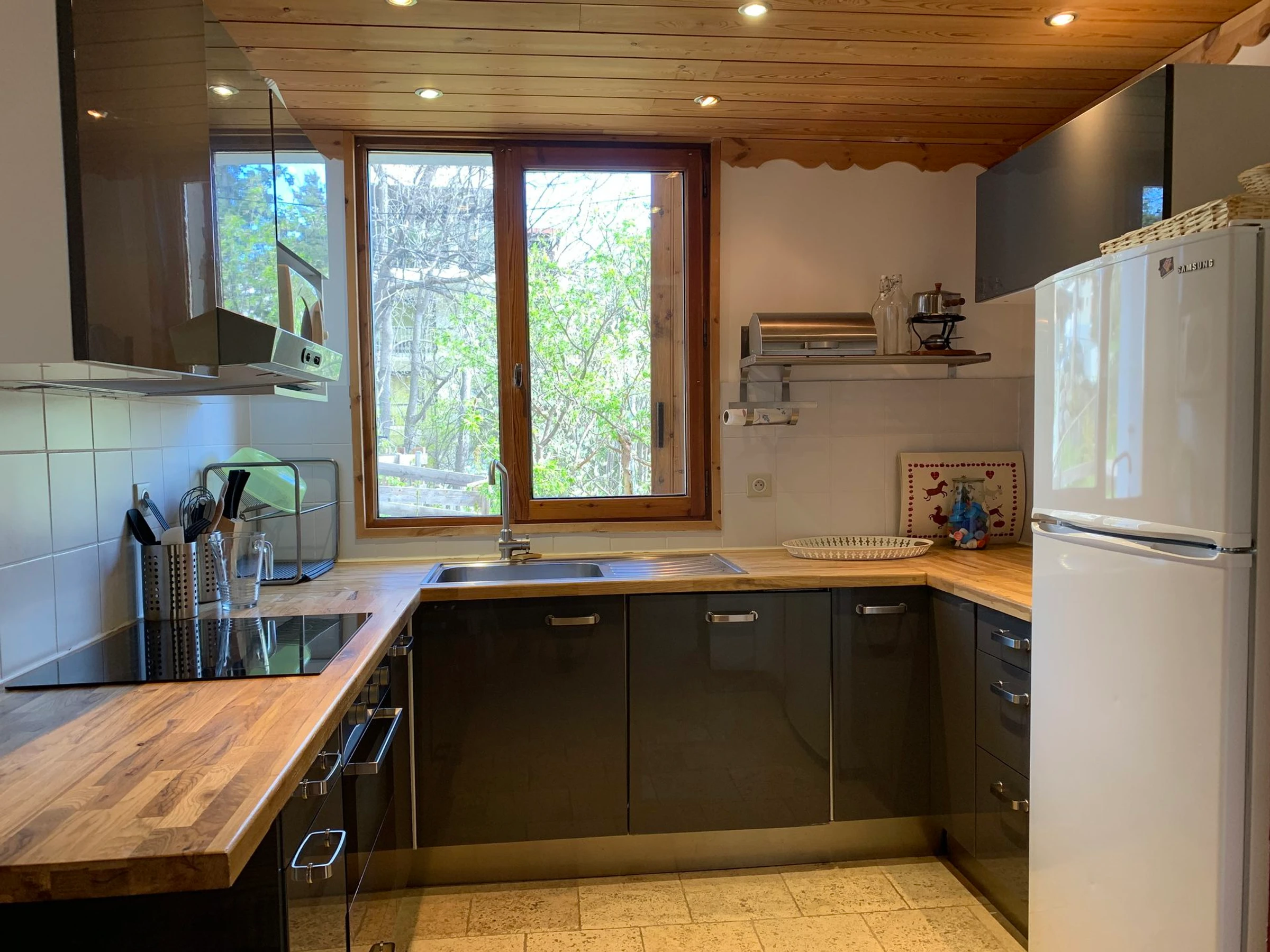 * Cuisine semi-indépendante : four pyrolise, 4 plaques vitro, frigo/congélateur, lave-vaisselle, micro-ondes, cafetière filtre, grille pain, appareil à raclette ;