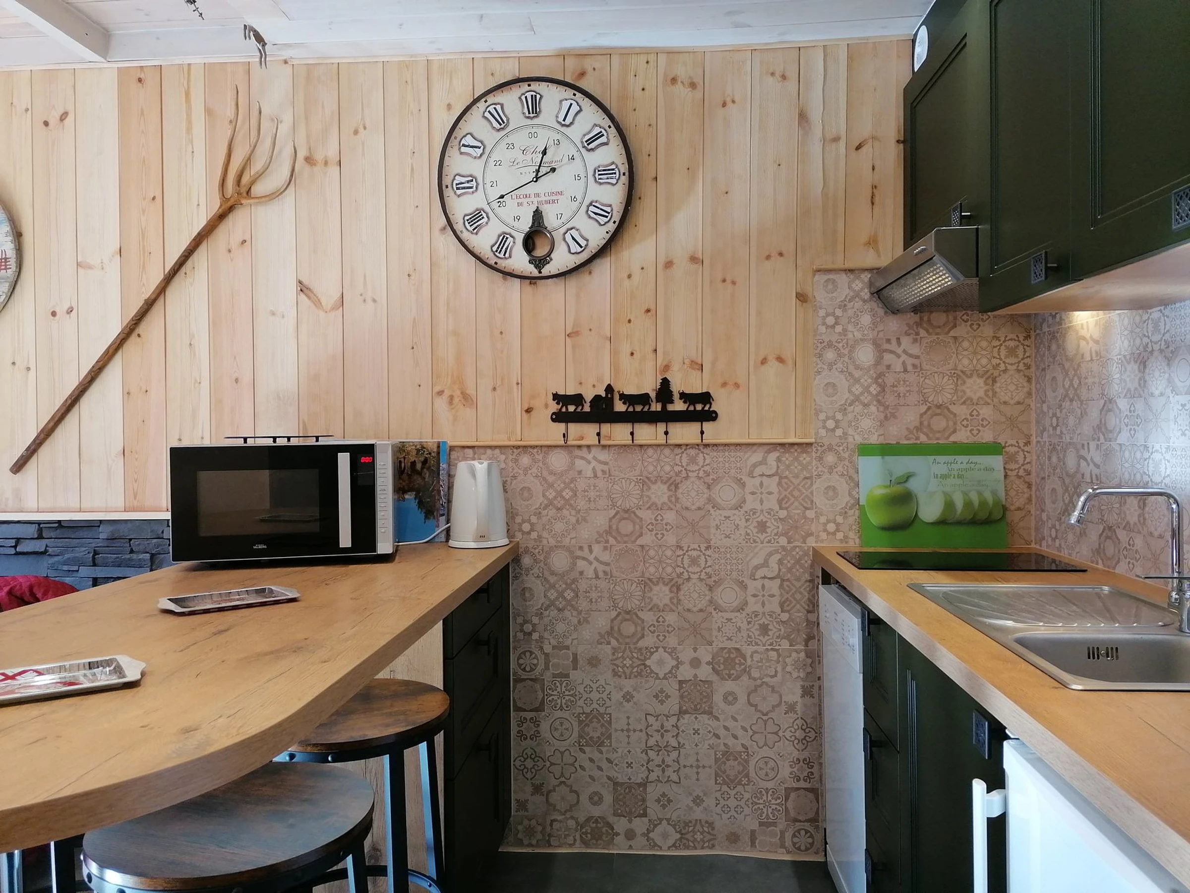 * Coin cuisine : réfrigérateur, 2 plaques électriques, combi four- micro-ondes, hotte, bouilloire ; lave vaisselle, cafetière Senseo ;