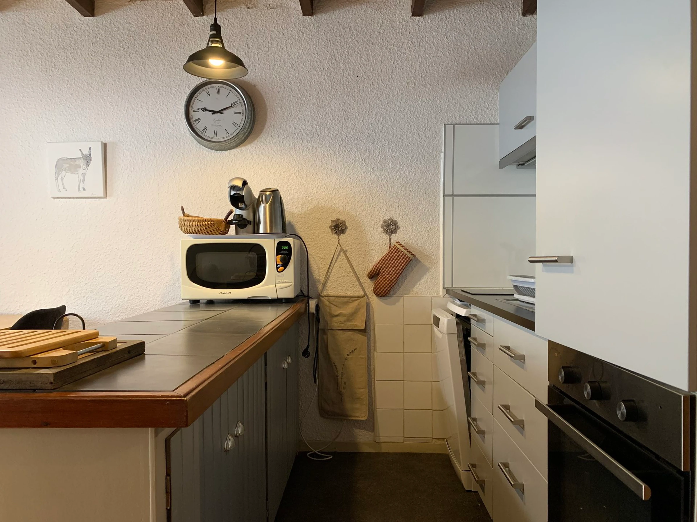 * Coin cuisine : four, réfrigérateur, 2 plaques vitro, lave-vaisselle, micro-ondes, cafetière filtre, cafetière Dolce Gusto, appareil à raclette et à fondue ;