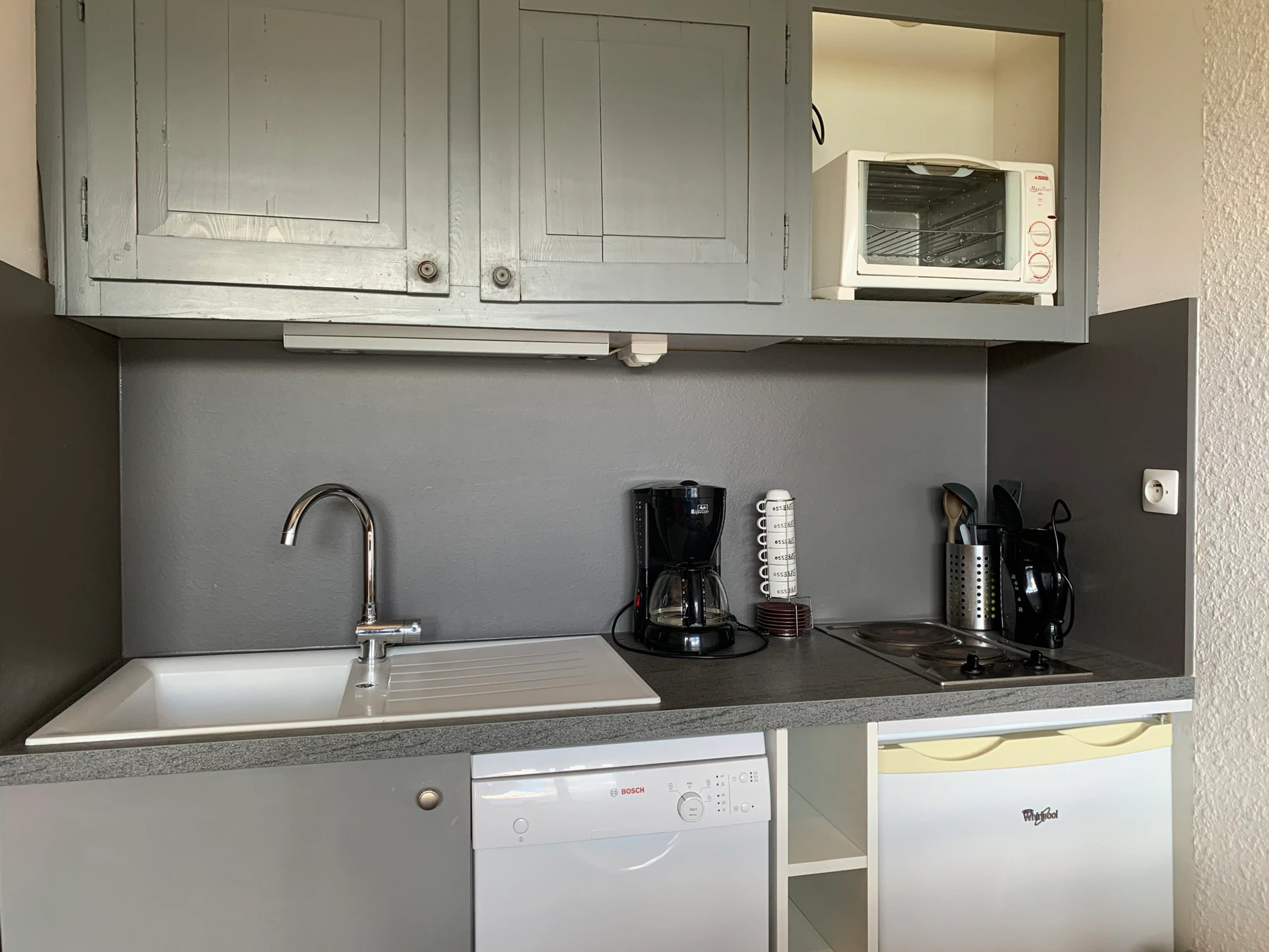 * Coin cuisine : mini-four, réfrigérateur, lave-vaisselle, plaques électriques, micro-ondes, cafetière classique et Senseo;