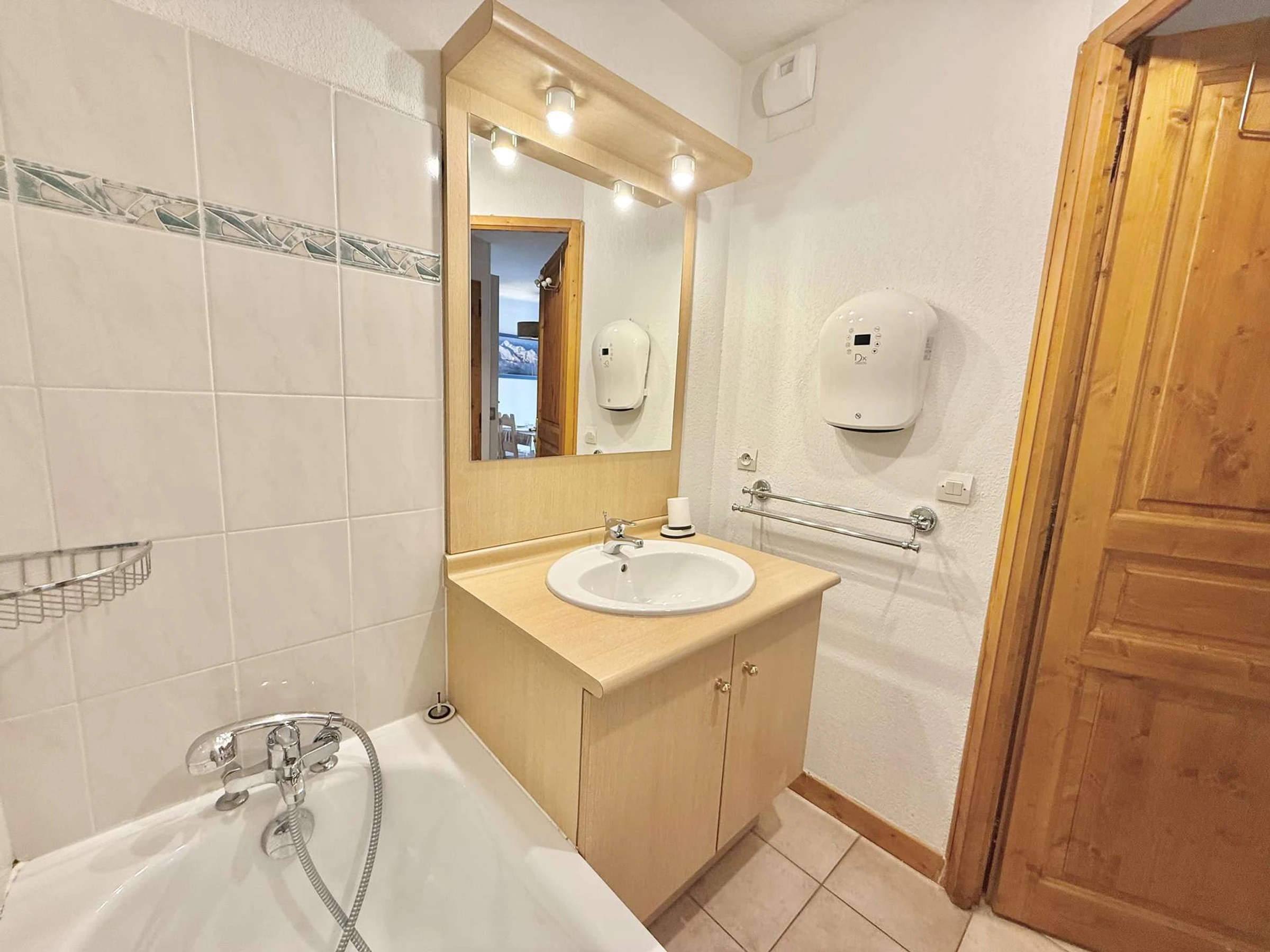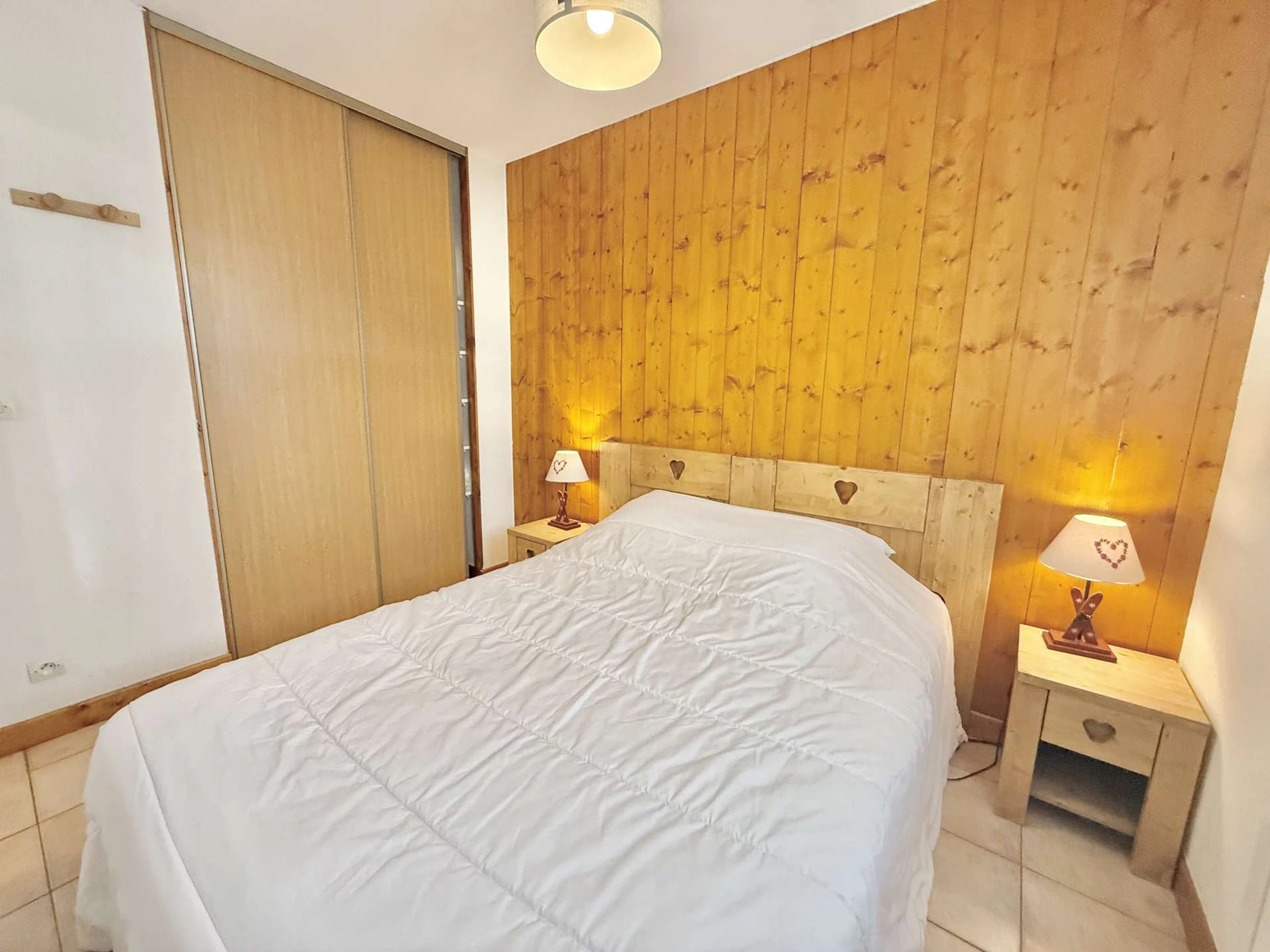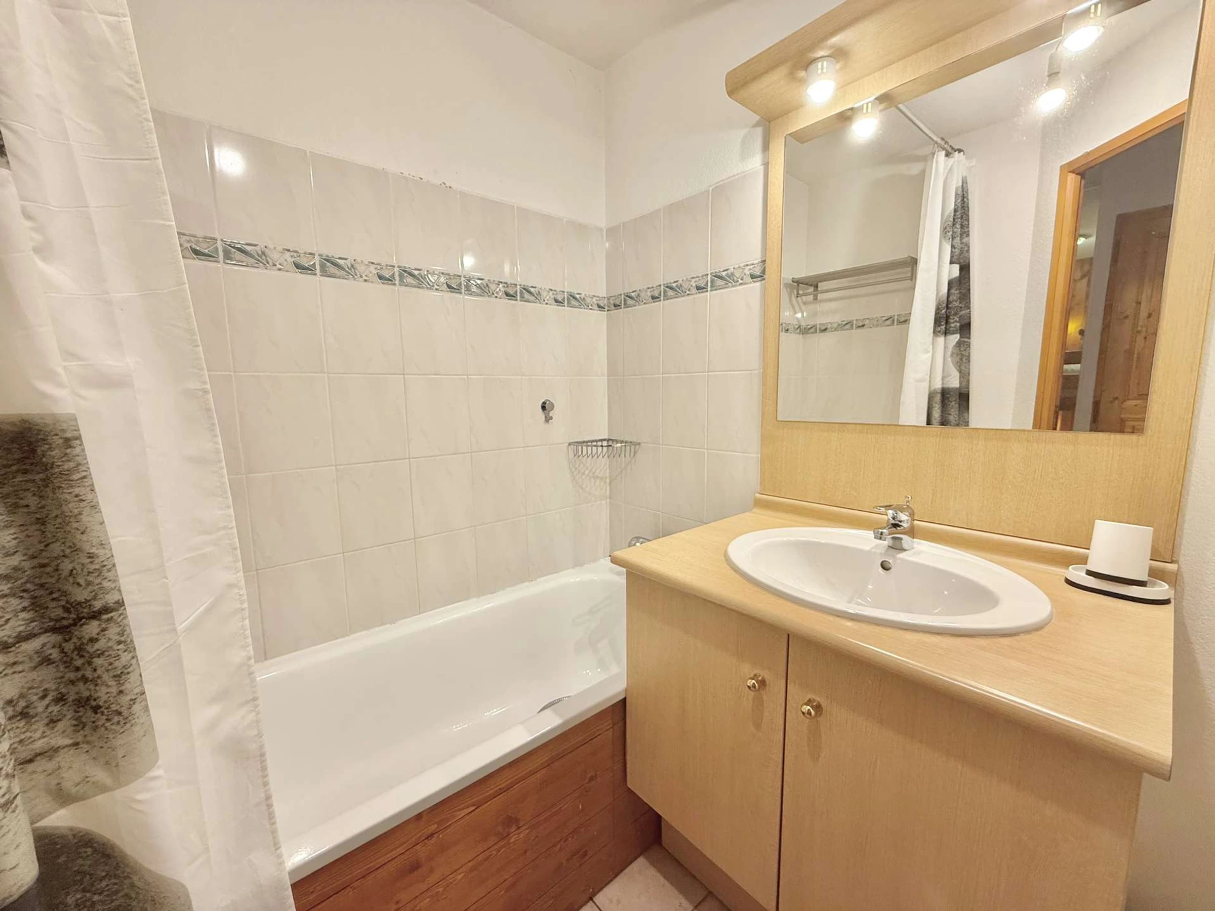Cet appartement de vacances, situé au premier étage de la résidence, comprend un séjour avec un canapé convertible pour 2 personnes, cuisine équipée et ouverte, un coin montagne avec 2 lits superposés, une chambre avec un lit double, une salle de bains avec baignoire et WC séparé.