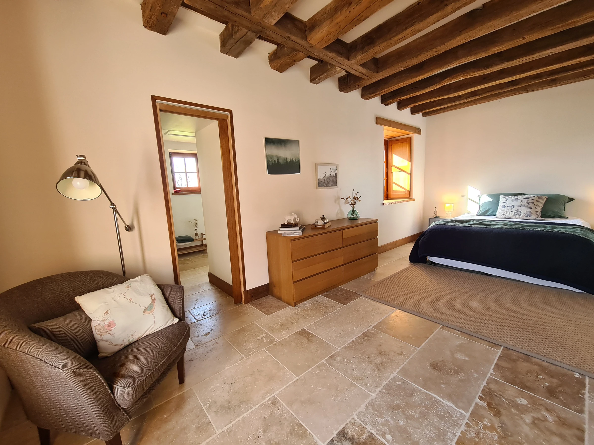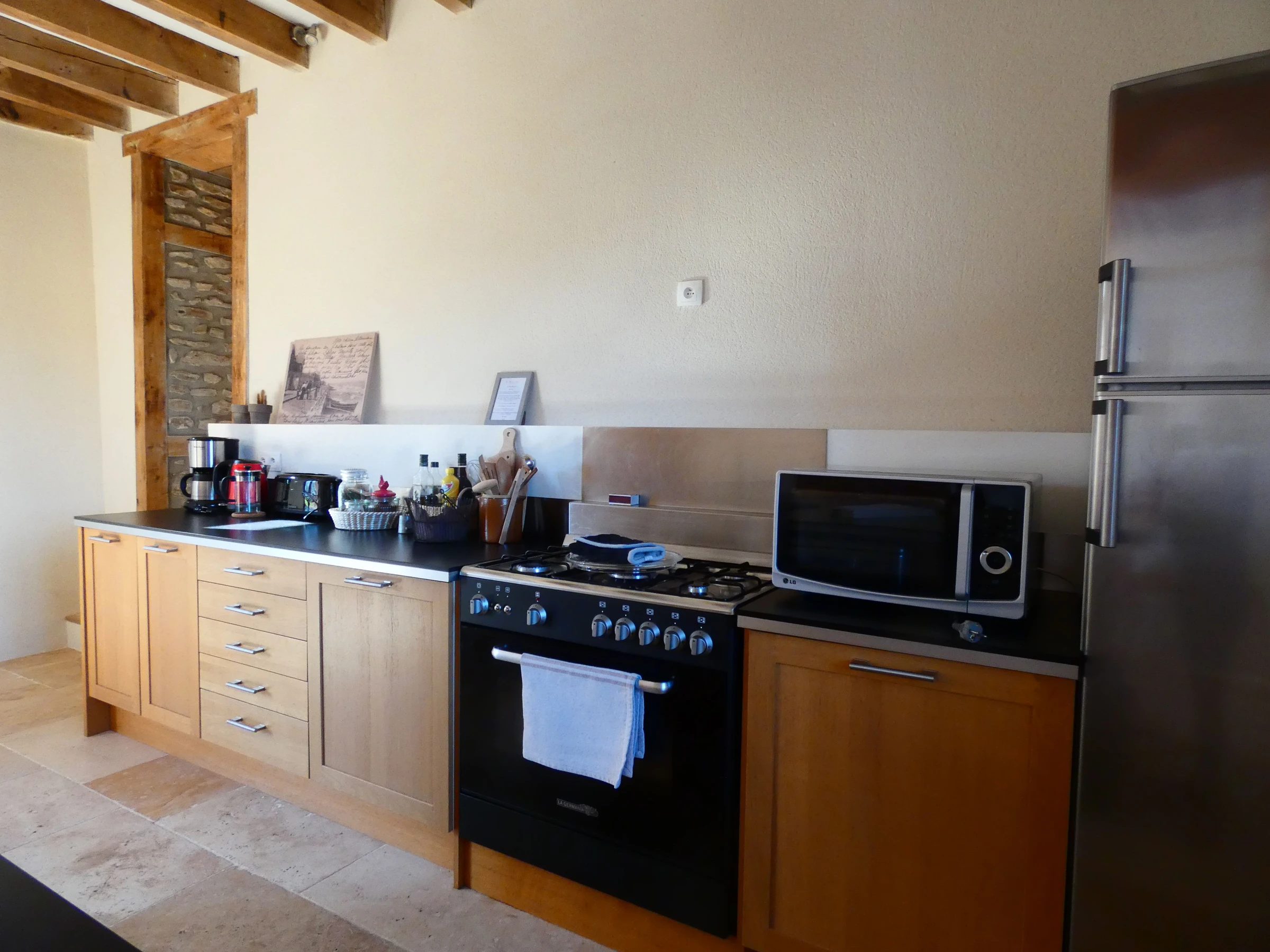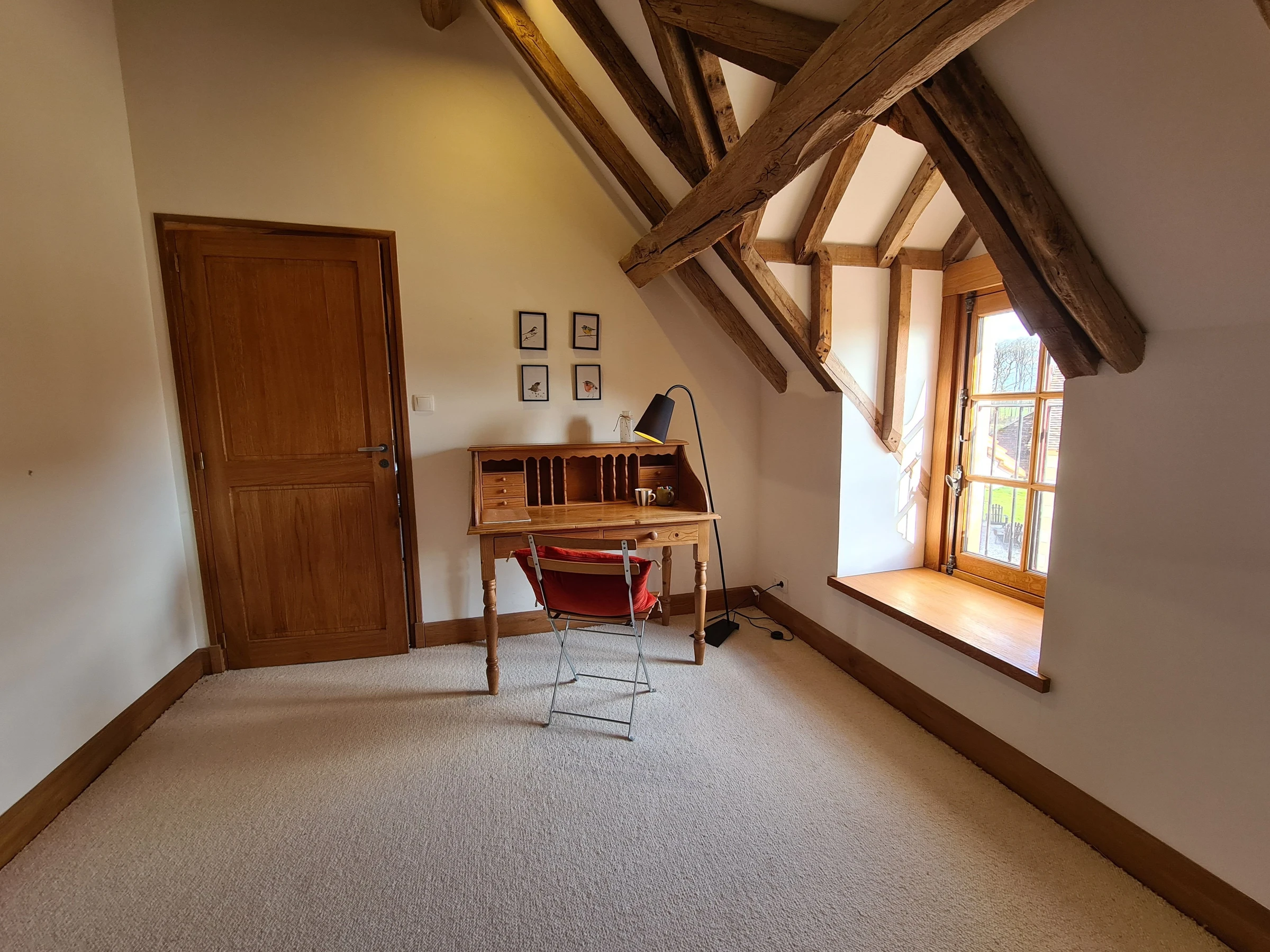 Au 1er étage : une chambre pour 2 personnes (lit 160cm), une salle d'eau, wc, une chambre pour 4 personnes (2 lits de 140cm), une salle d'eau, wc, un palier avec un bureau, une grande chambre (lit de 160 cm) avec accès via la chambre 2 et le palier ou directement par un escalier extérieur.