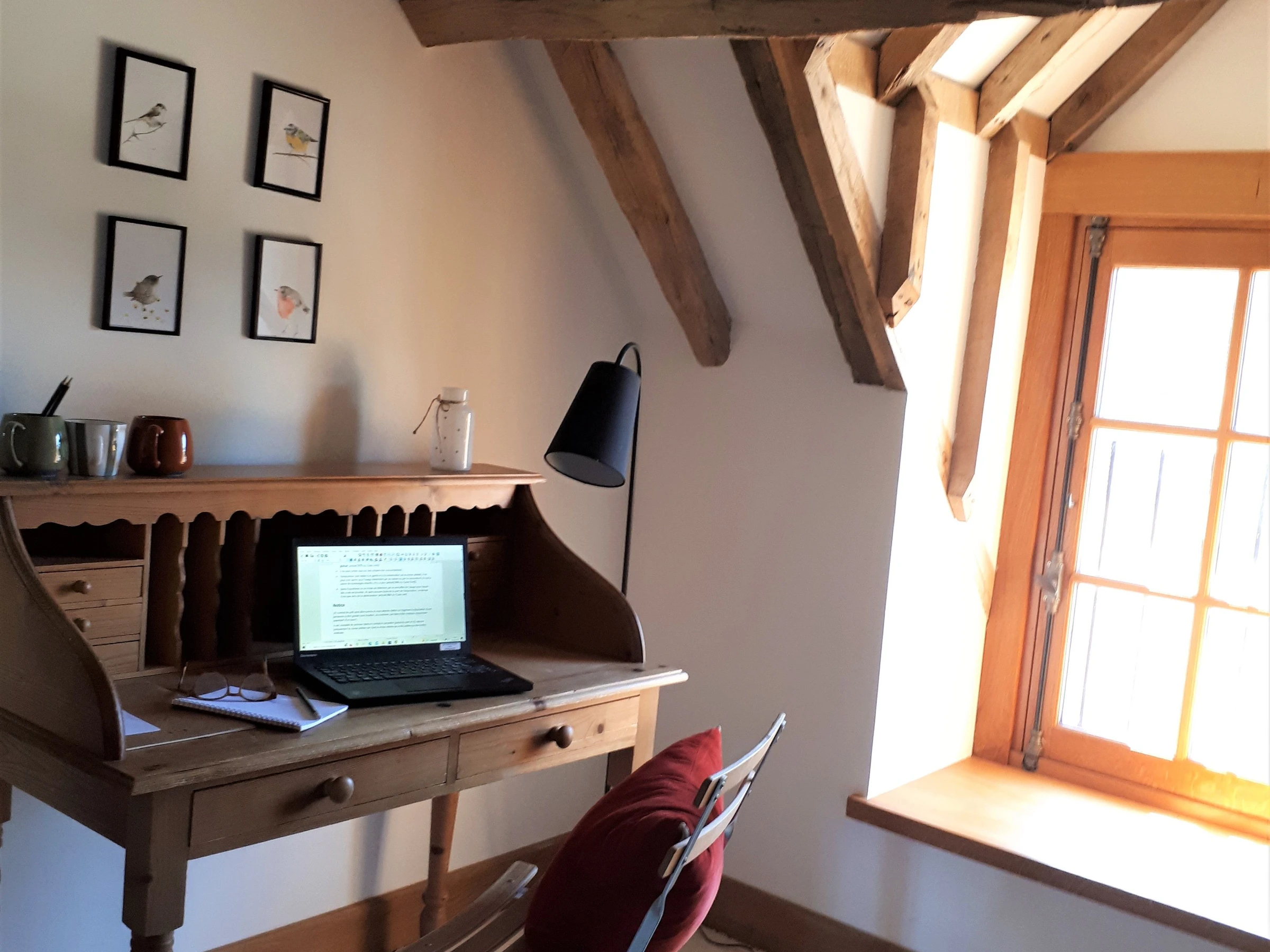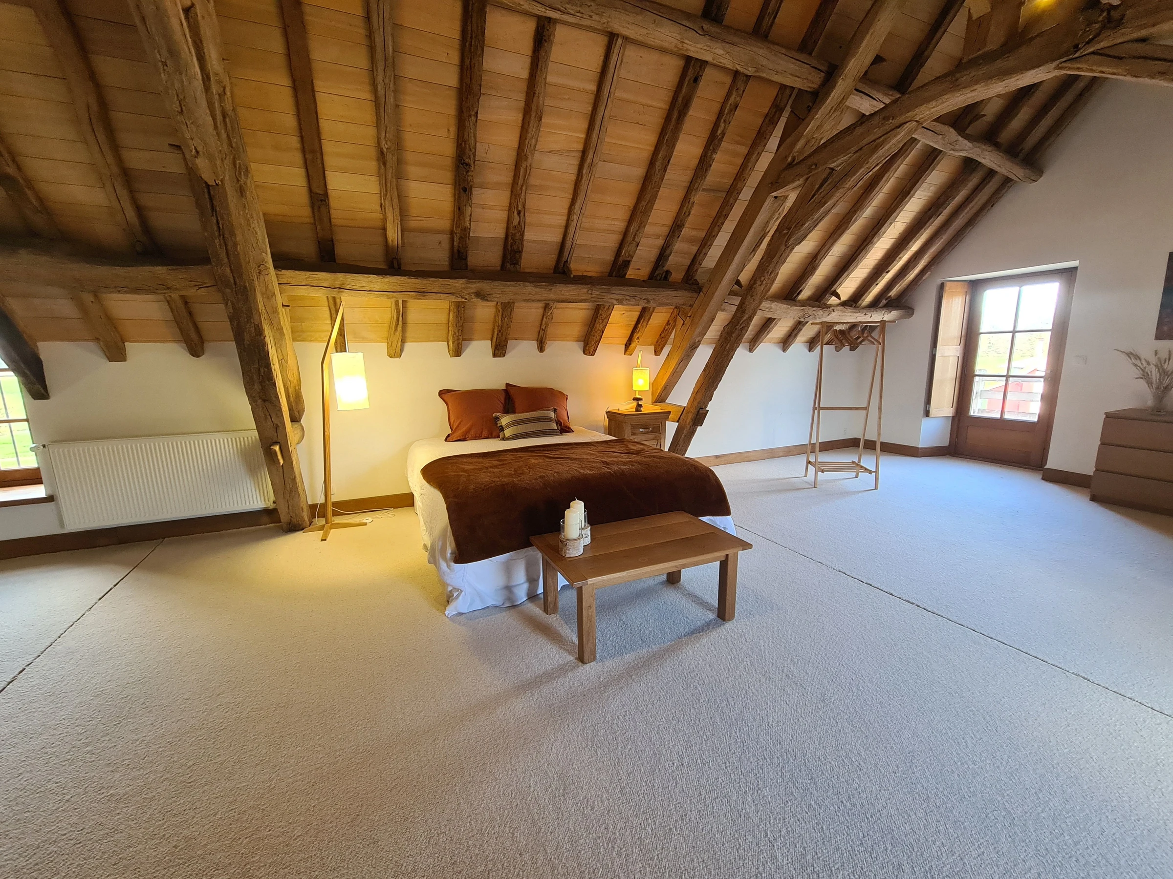 A l'extérieur : un jardin avec un salon de jardin pour vous détendre, une buanderie partagée avec les propriétaires, un domaine de 50 hectares avec des prairies, des bois, une mare.