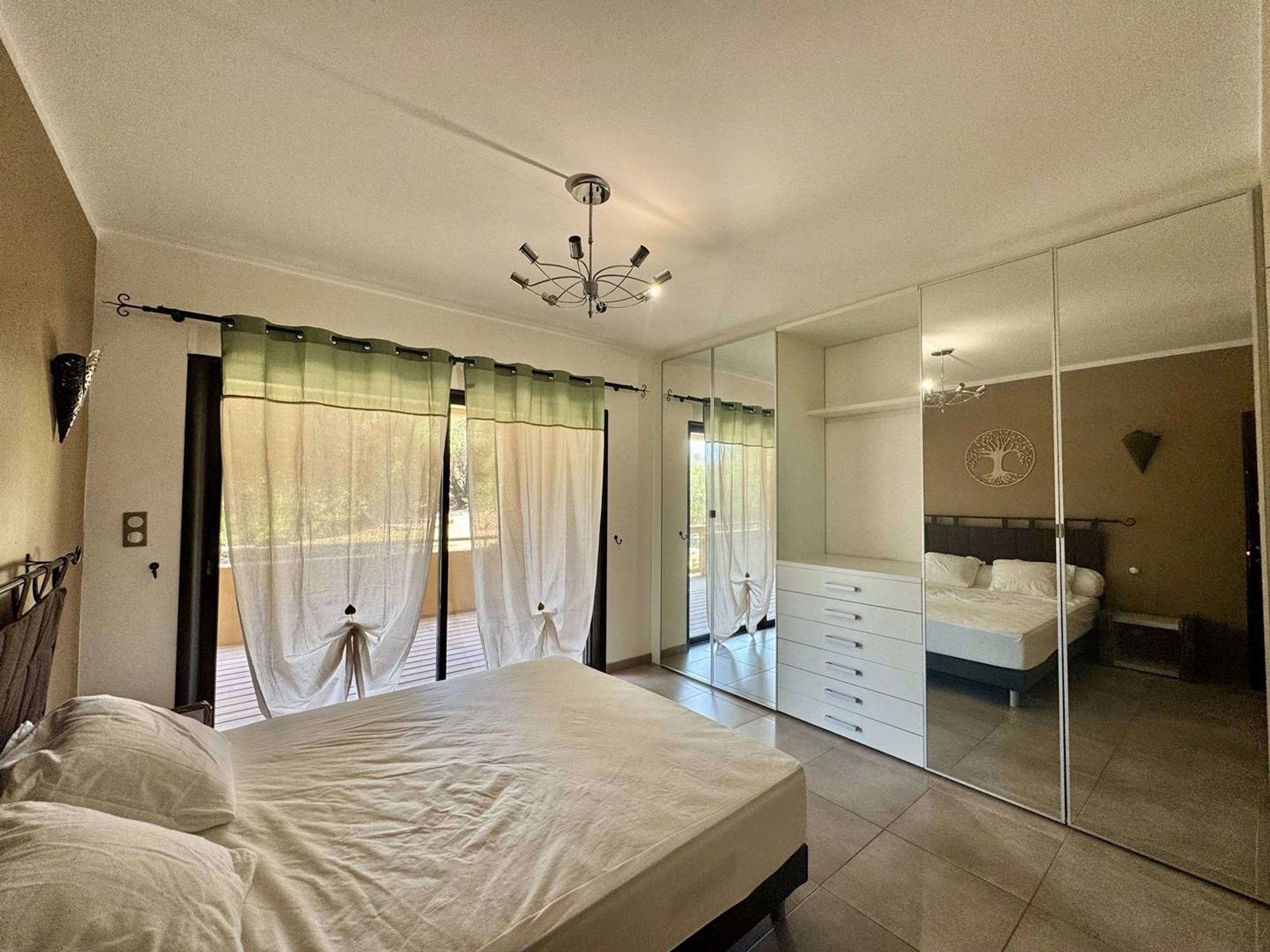 Côté nuit, vous profiterez d’une grande chambre avec un lit confortable en 160 cm et un grand dressing. Cette chambre s’ouvre elle aussi sur la terrasse et le jardin, créant une belle continuité entre l’intérieur et l’extérieur.