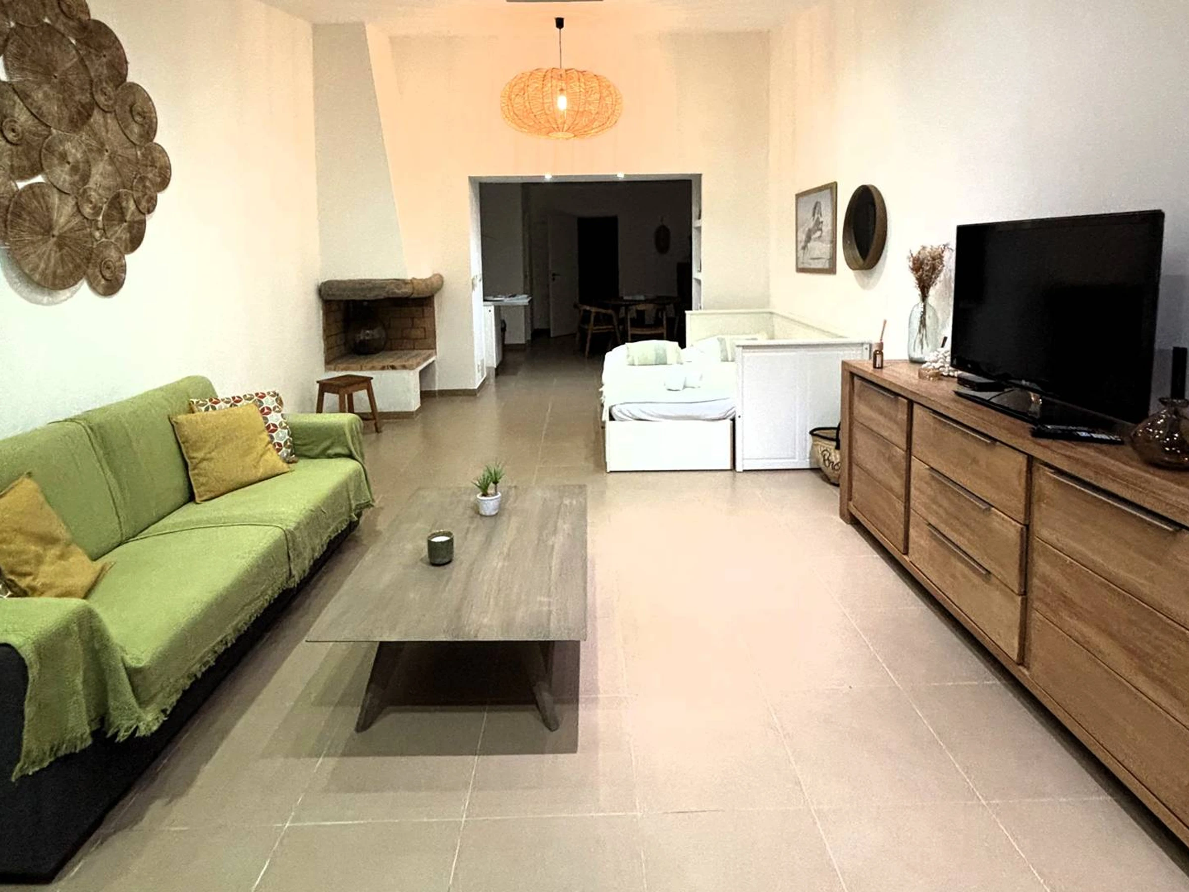 Un salon avec canapé convertible offrant un couchage de qualité.