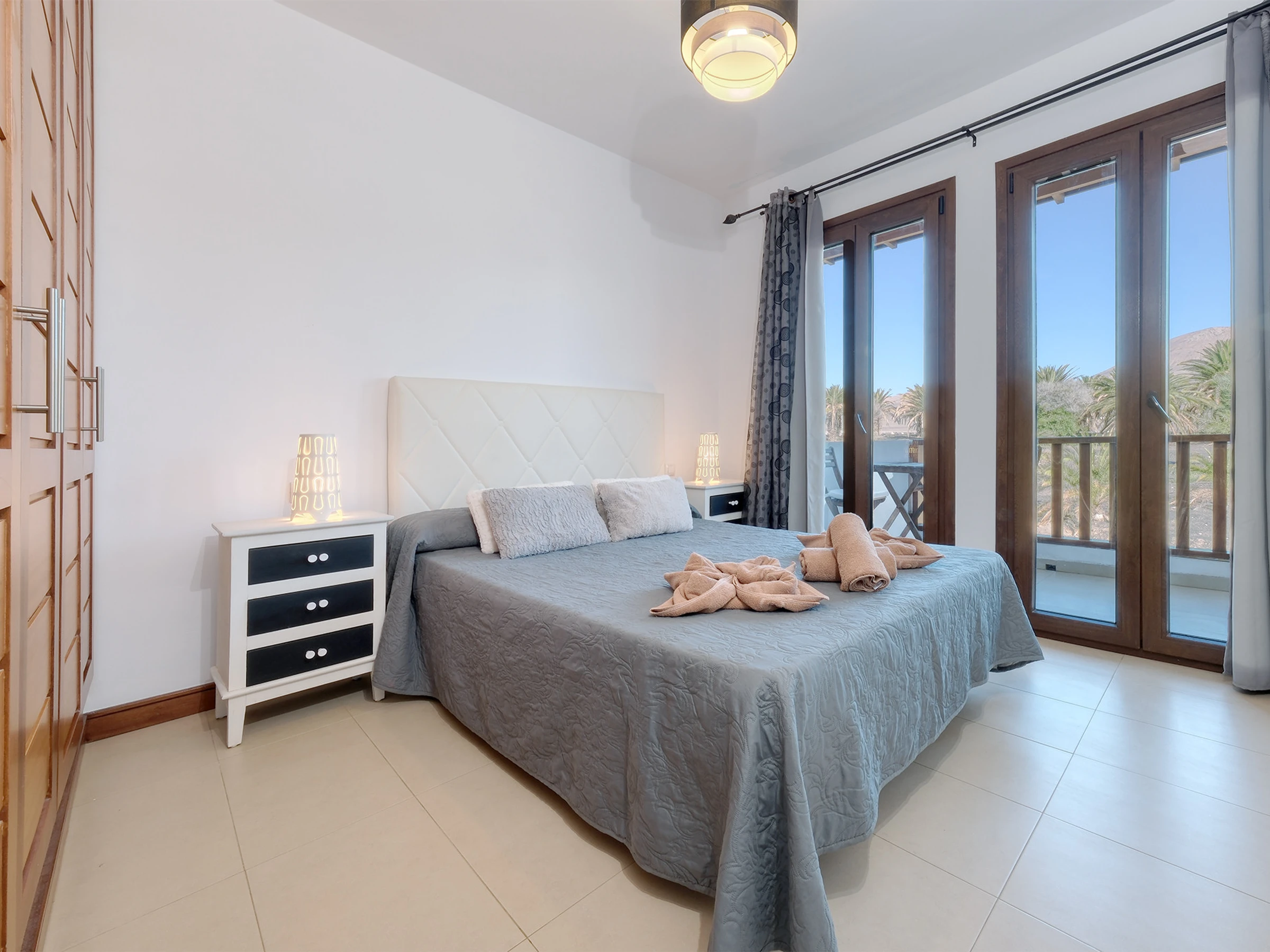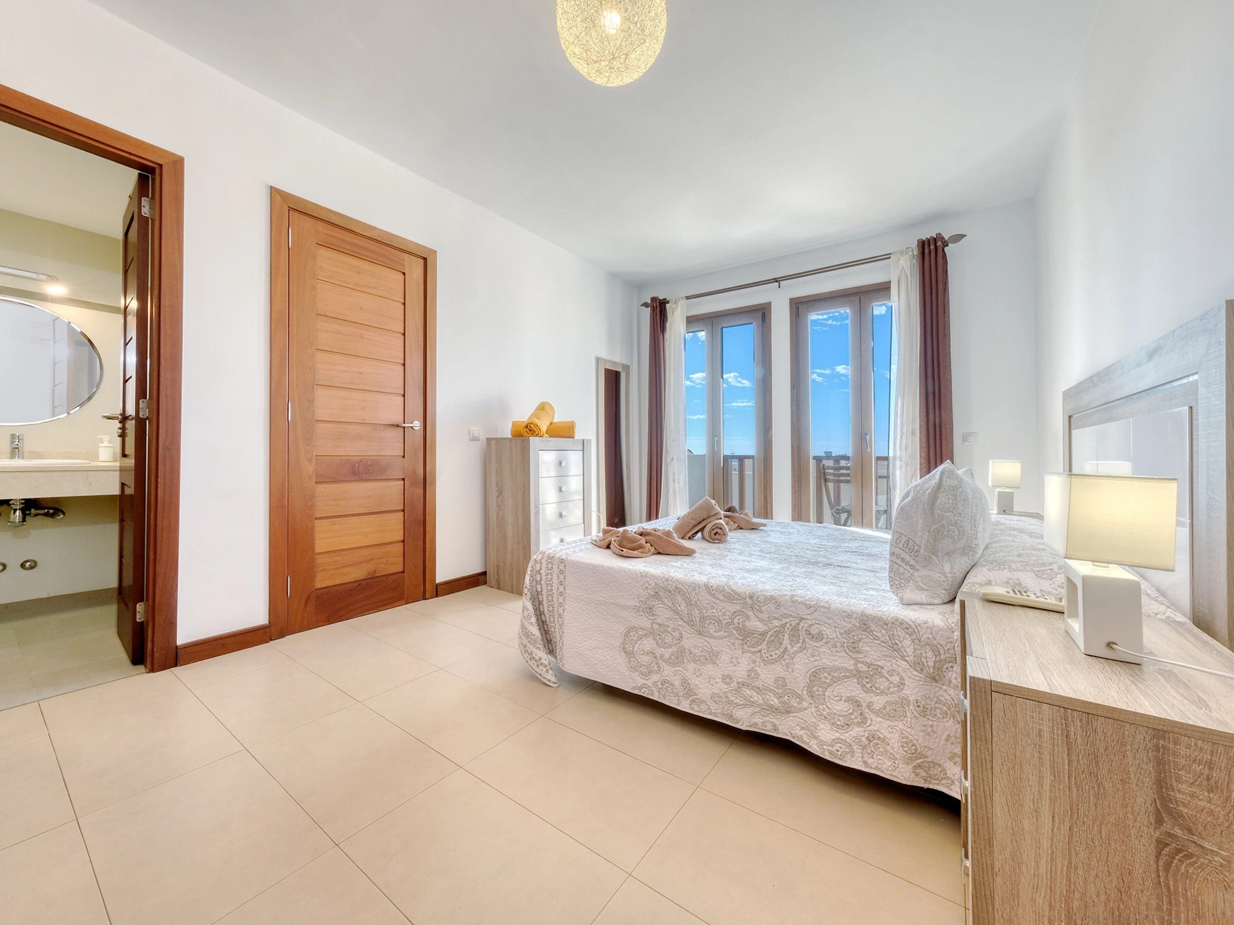 Au premier étage se trouvent deux chambres spacieuses. La chambre principale dispose d'un lit king-size, de placards spacieux et d'un balcon privé offrant une vue imprenable sur les volcans. La deuxième chambre, avec deux lits individuels et un grand placard, est idéale pour les familles ou les groupes d'amis. Ils partagent tous deux une salle de bain complète avec baignoire.
