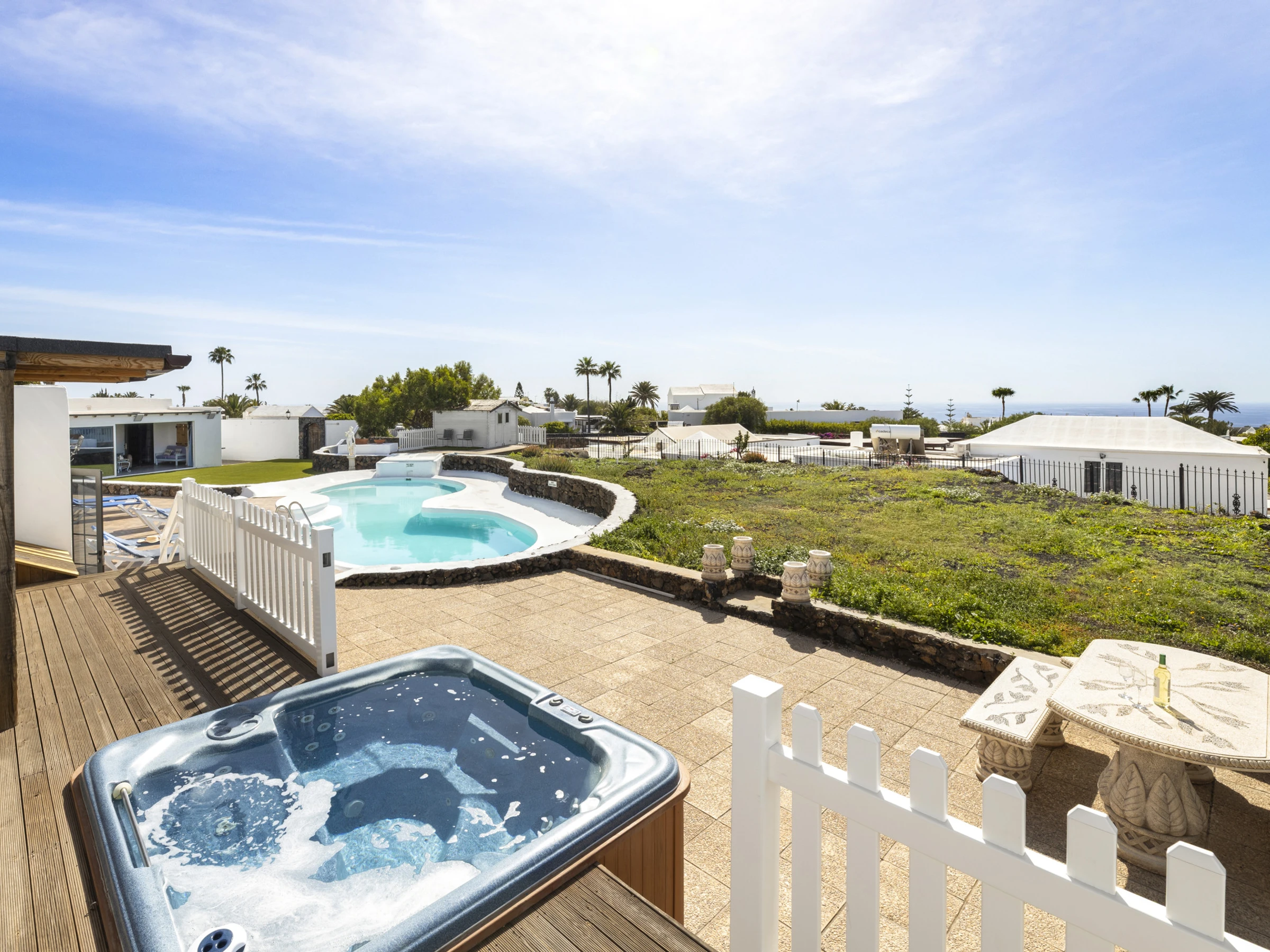 Grande piscine (14 mètres de long !). Terrasse avec transats, table et chaises, zone couverte et vue panoramique. Jardin avec vue encore plus large. Terrasse surélevée avec jacuzzi intégré, espace de vie avec vue panoramique. Autre terrasse avec abri de jardin offrant un espace de vie douillet et protégé avec vue panoramique.