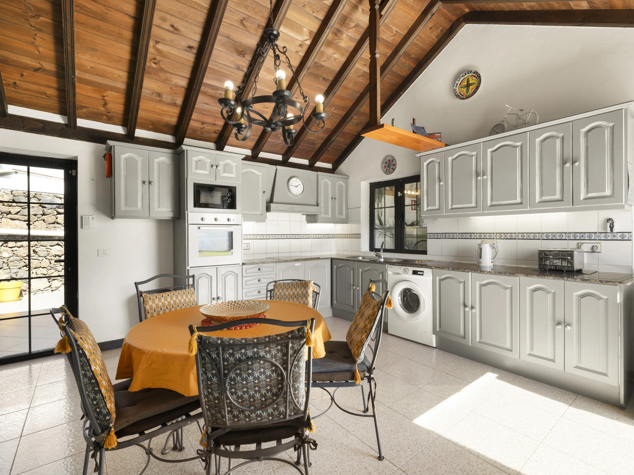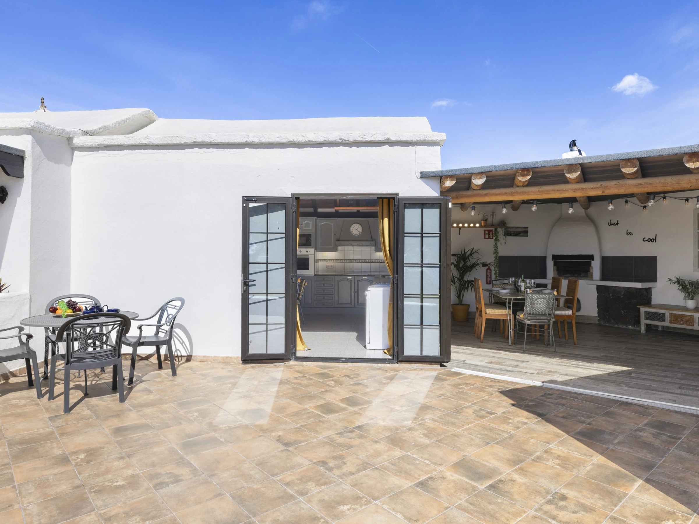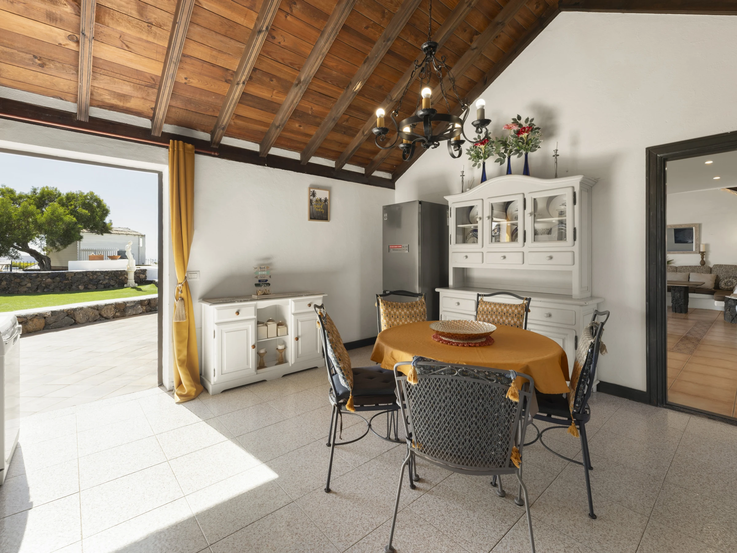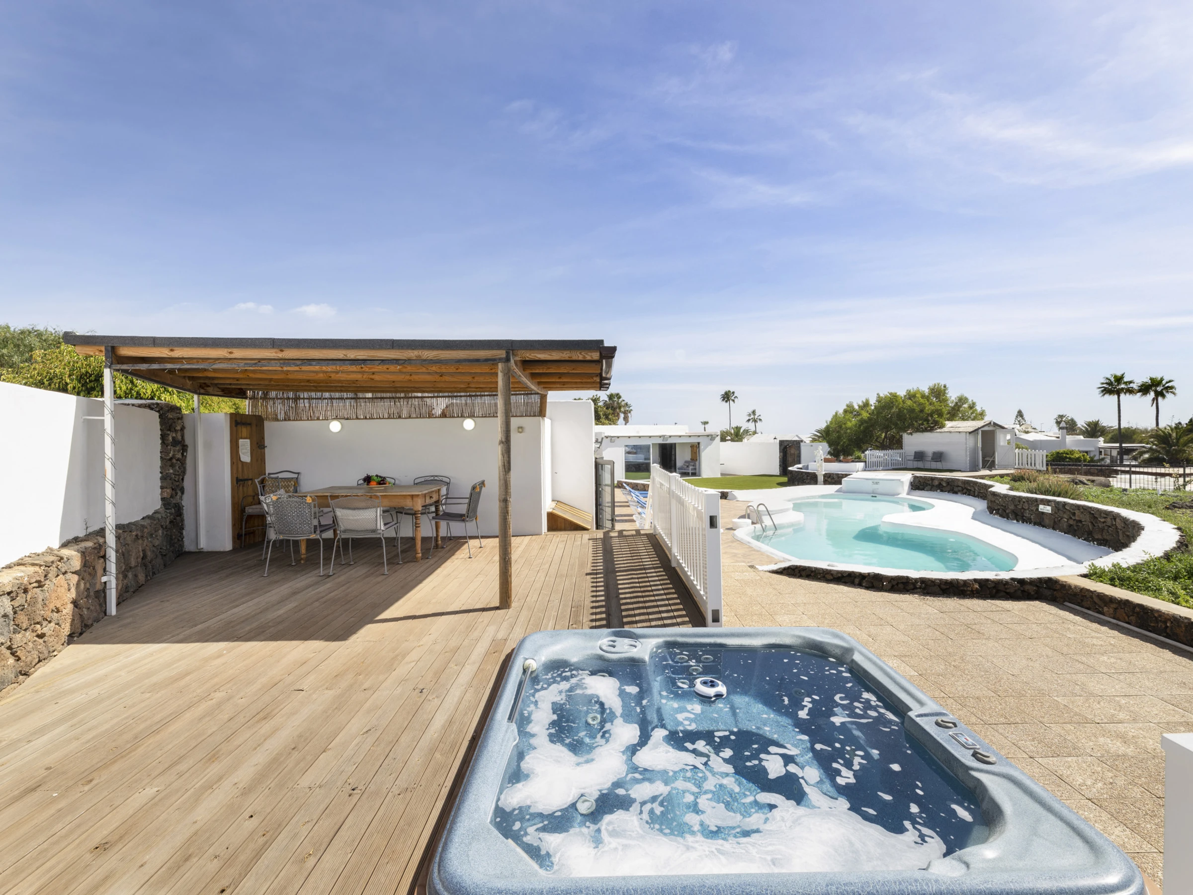 MAISON PRINCIPALE avec une cuisine spacieuse et accueillante entièrement équipée avec une grande table et des chaises (capacité de 6 personnes), fenêtre latérale et portes françaises donnant sur la terrasse, salon extérieur, piscine, terrasse en bois et jardin.