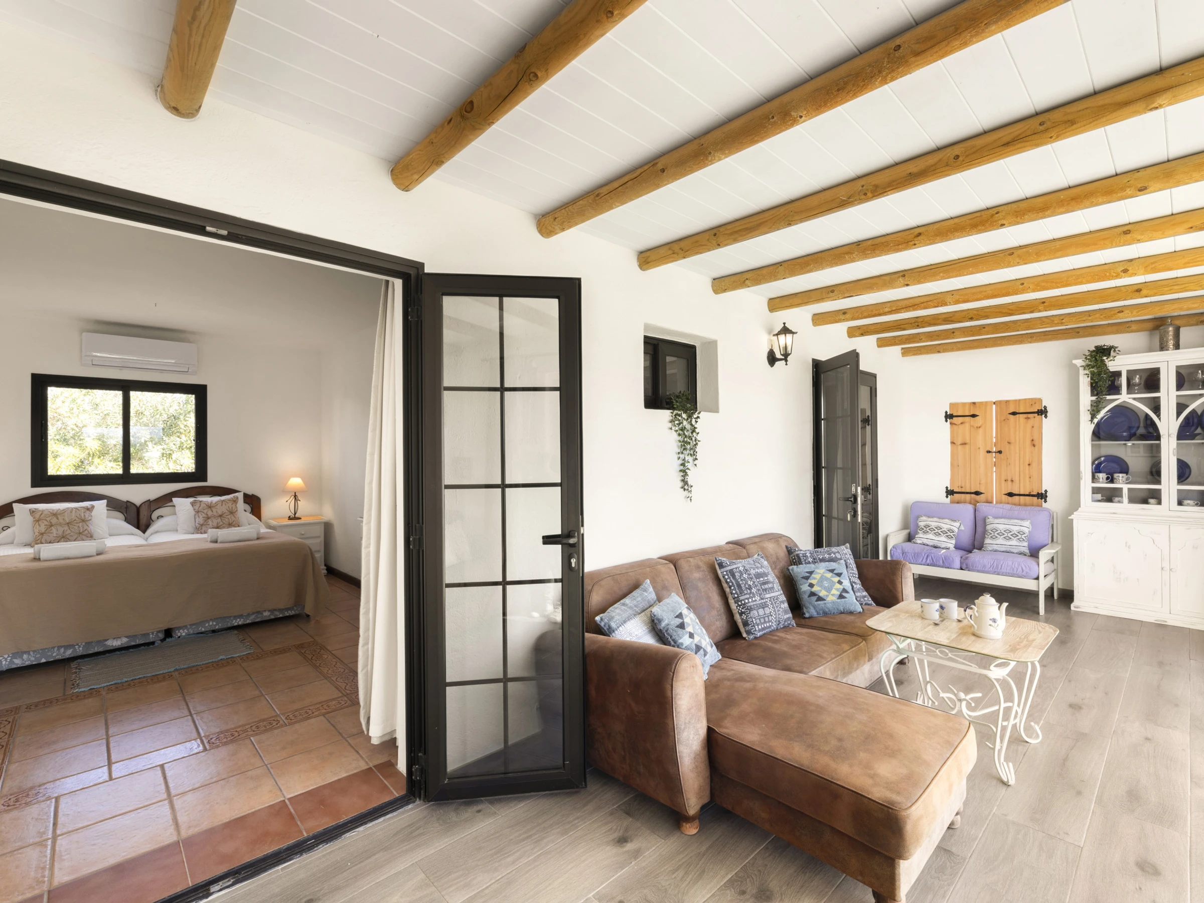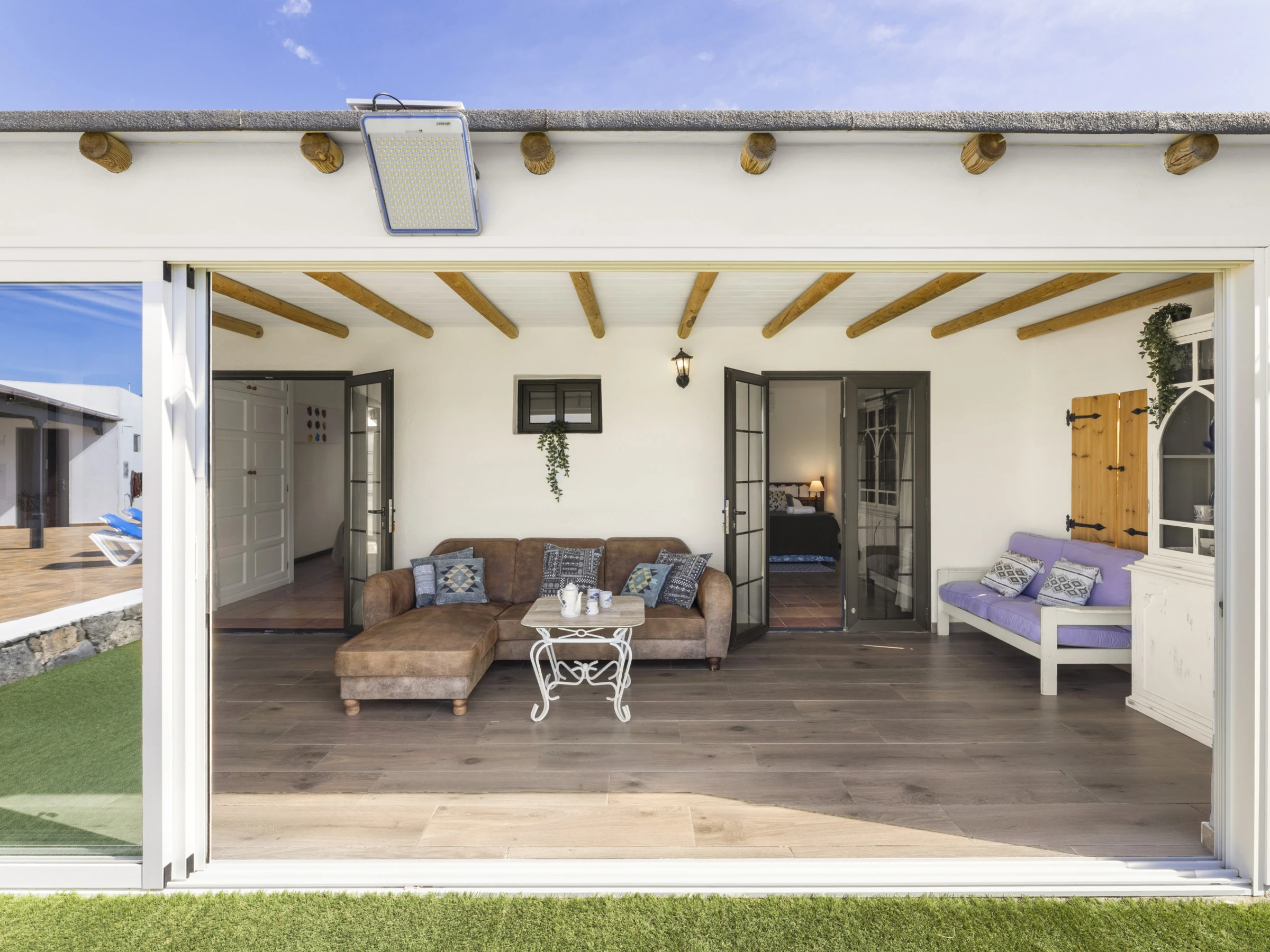 SALON à l'avant avec de grandes portes coulissantes à trois panneaux donnant sur l'extérieur, canapé, salle à manger et commode avec portes donnant sur les chambres.