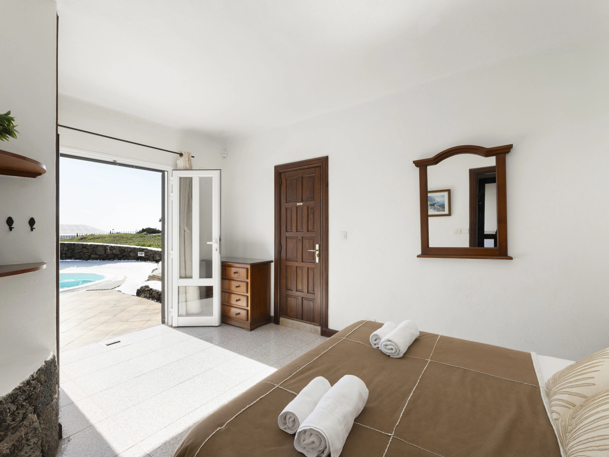 GRAND SALON avec capacité pour 6 personnes, cheminée, deux fenêtres et portes françaises donnant sur la terrasse, la piscine et le jardin. Salle de bain de bonne taille avec douche à l'italienne, bidet, lavabo et toilettes, à côté de la CHAMBRE PRINCIPALE avec un grand lit de couple, placards intégrés et portes françaises donnant sur la terrasse, la piscine et le jardin.