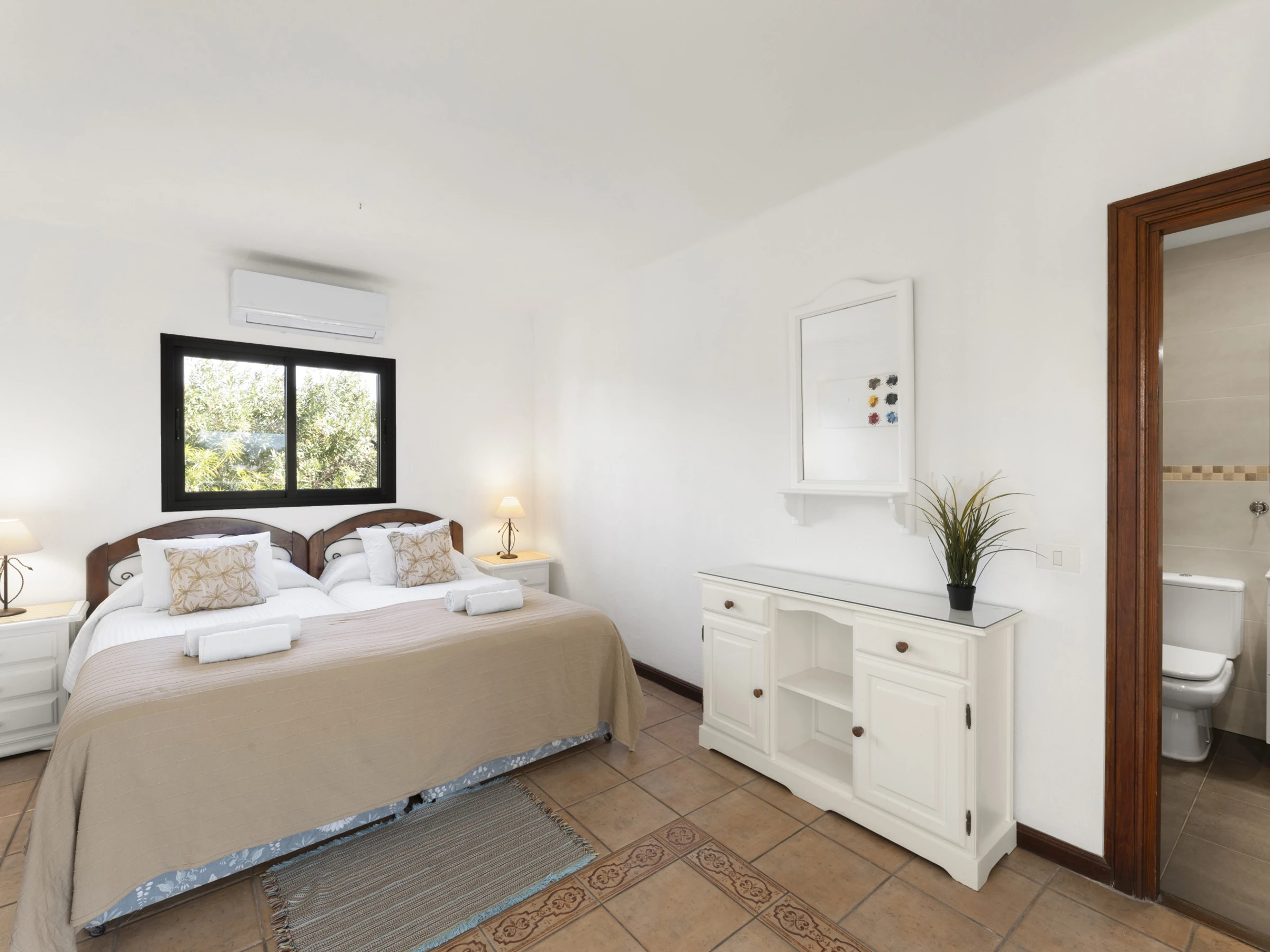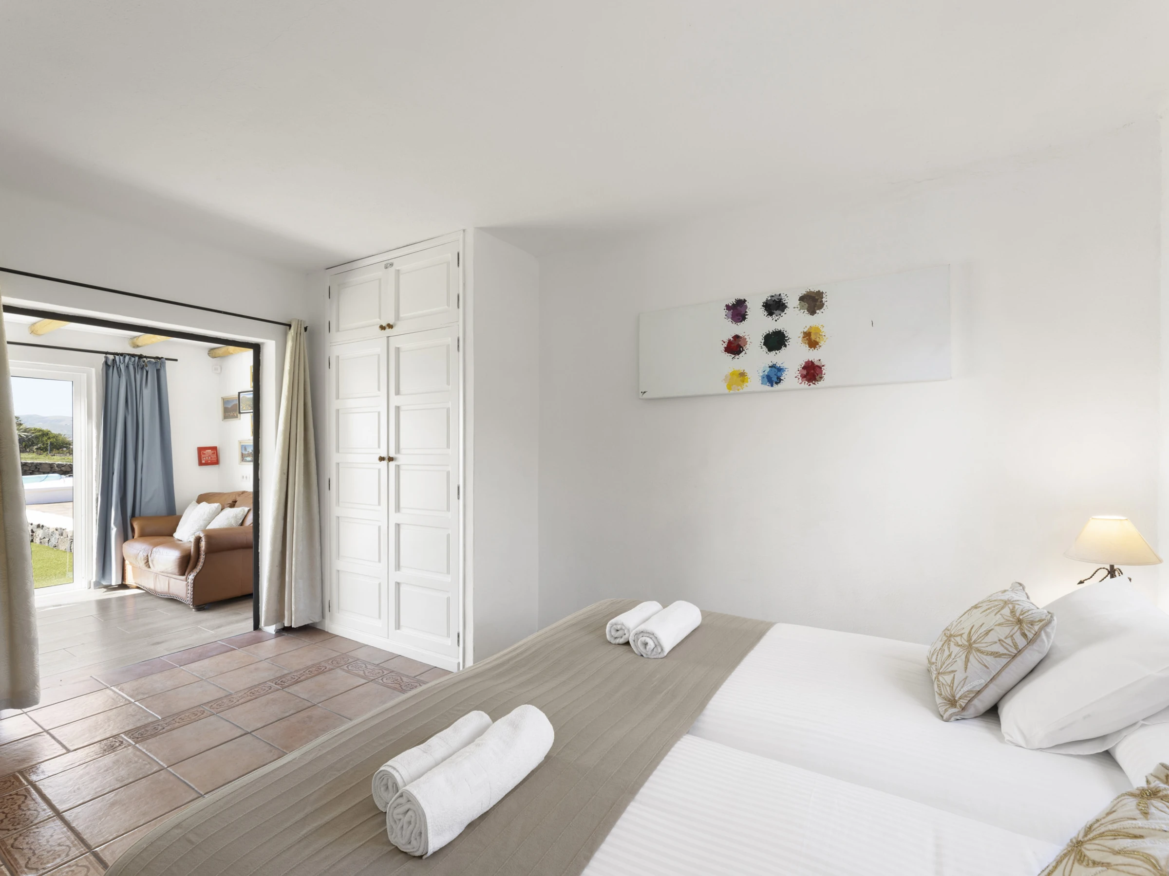 CHAMBRE DEUX avec deux lits individuels, placards intégrés, porte sur la salle de bain privée avec grande douche à l'italienne, lavabo et toilettes. Portes françaises sur le salon.