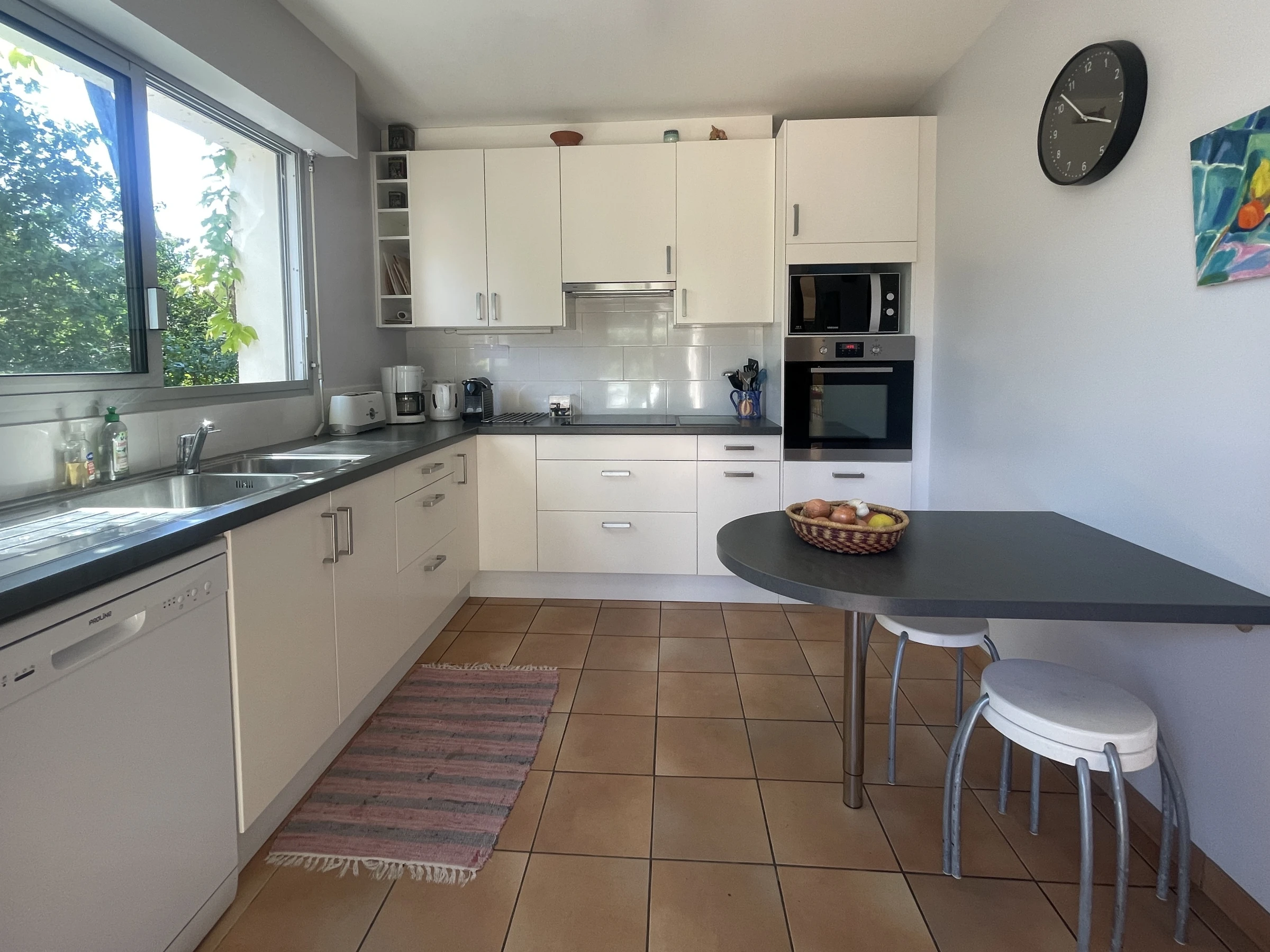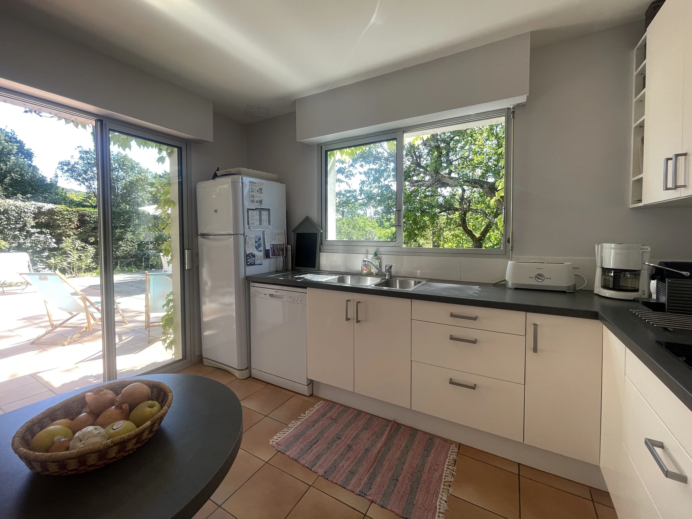 Au RDC : entrée, buanderie (lave-linge), cuisine indépendante équipée ouvrant sur terrasse (four électrique, plaque induction, réfrigérateur - congélateur, lave-vaisselle, cafetière à filtre et Nespresso, grille-pain, bouilloire...), grand séjour avec deux baies vitrées donnant sur la terrasse et le jardin (NB : pas de WC au RDC).