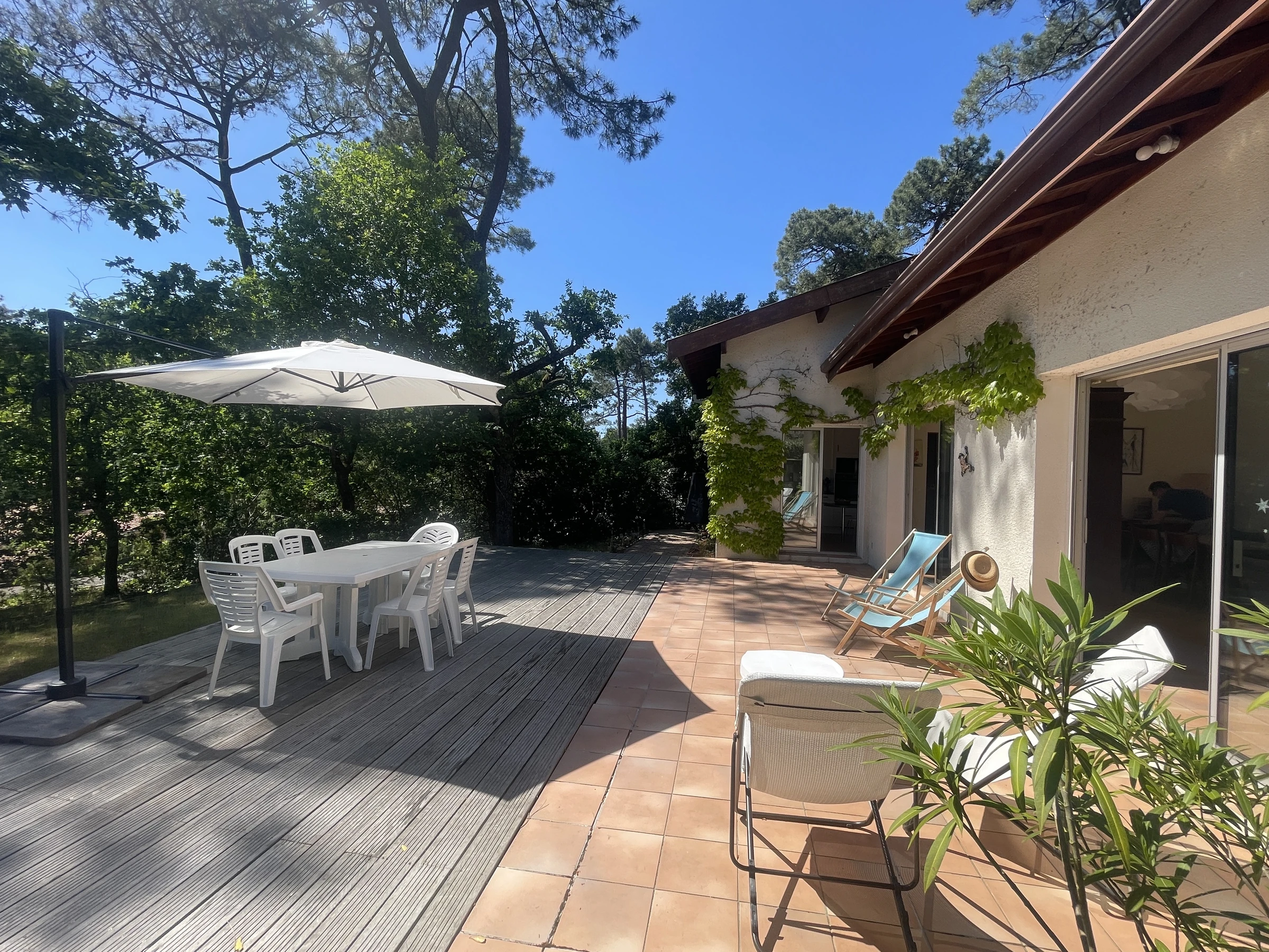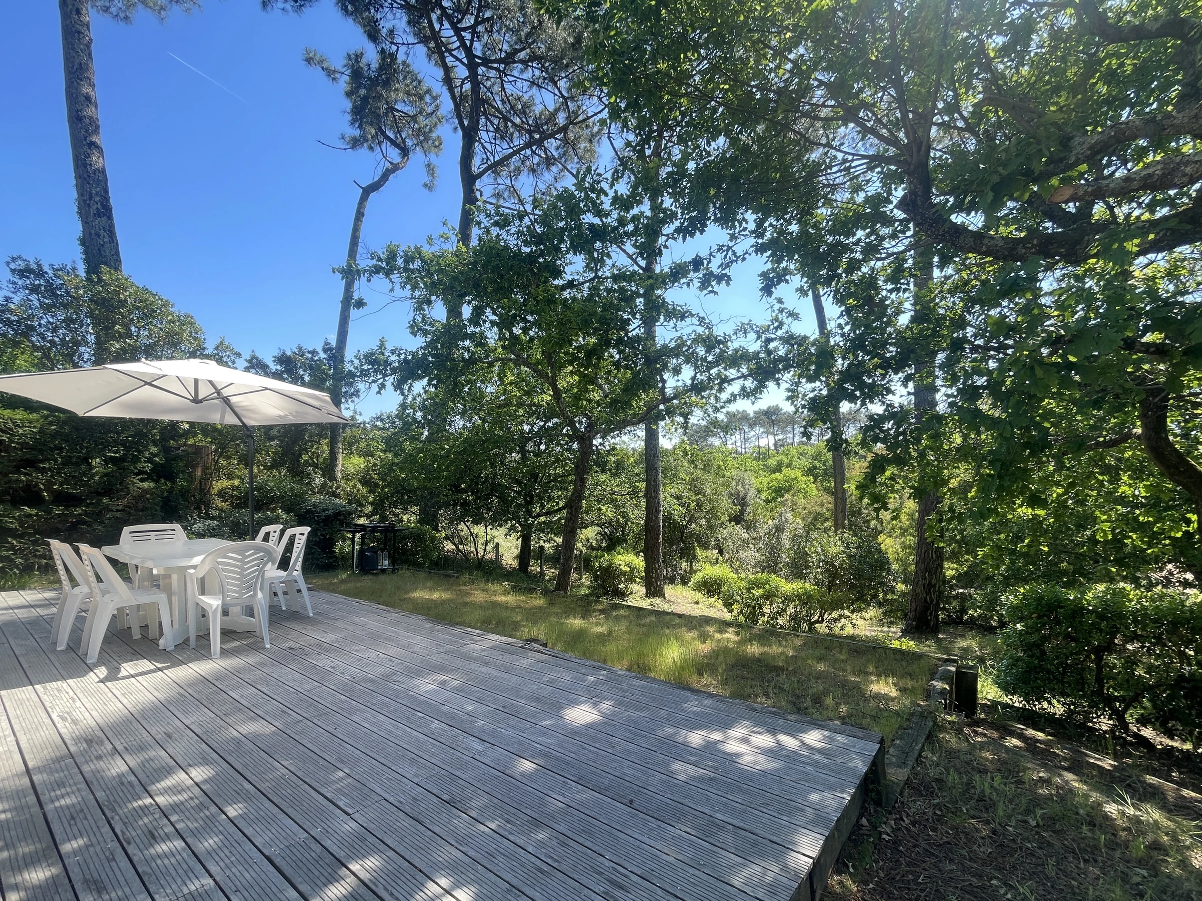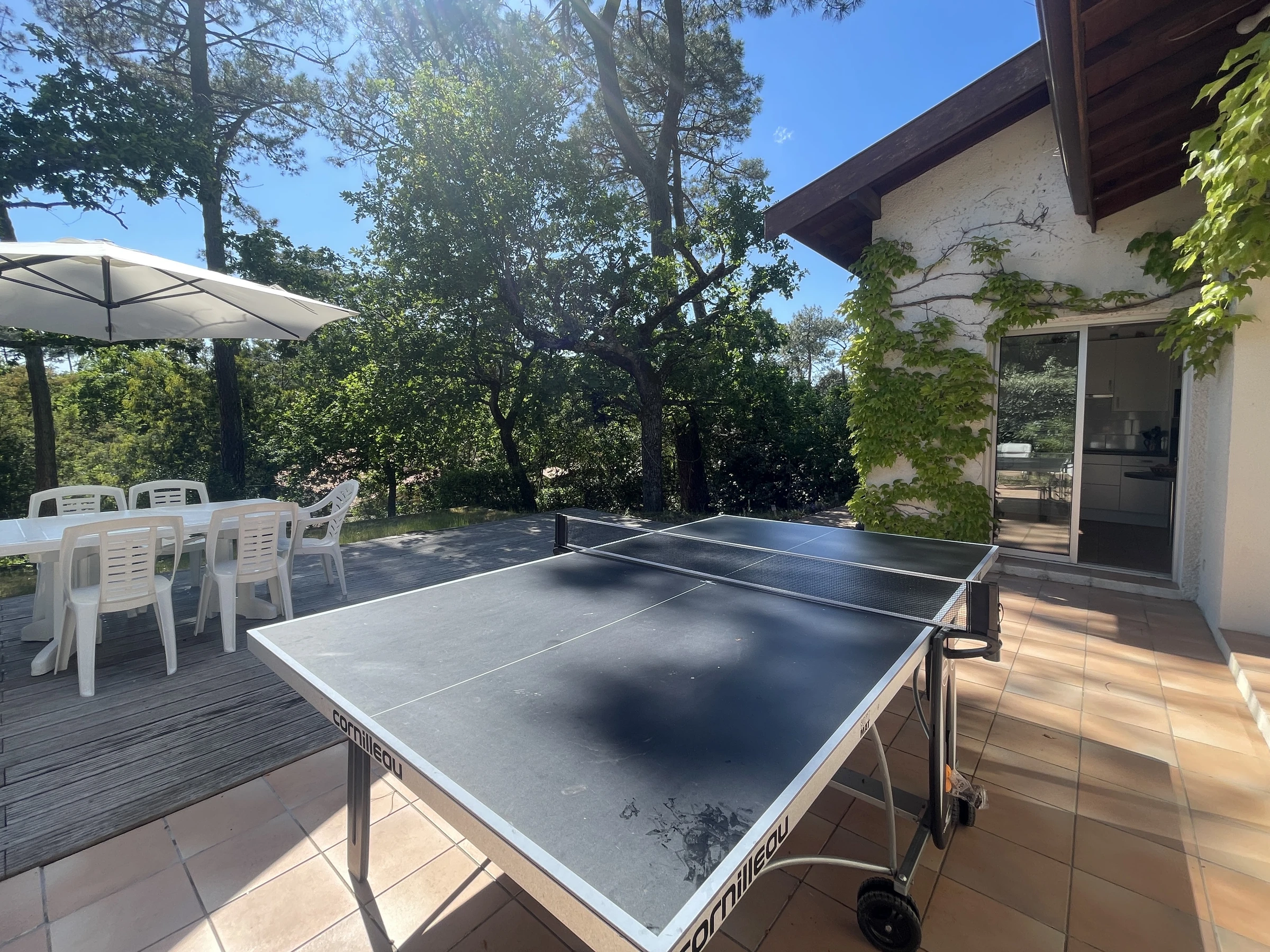 Grand jardin clos donnant sur la forêt, terrasse avec table de ping-pong, table repas, 4 chiliennes, plancha gaz, parasol...