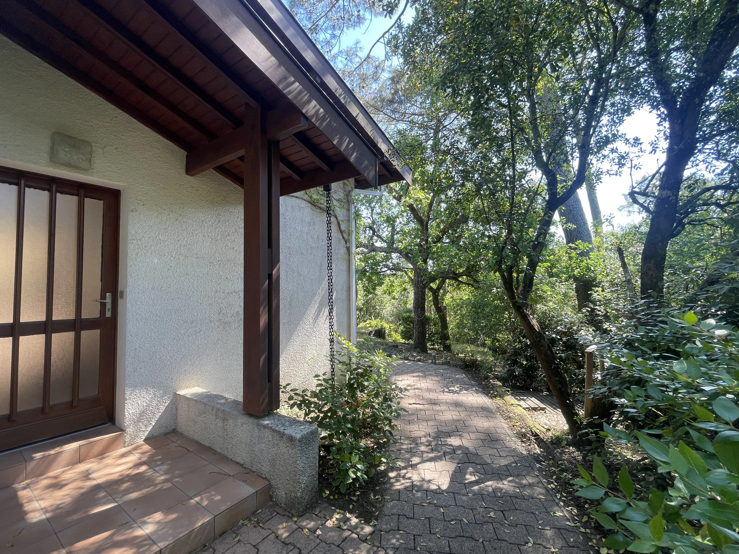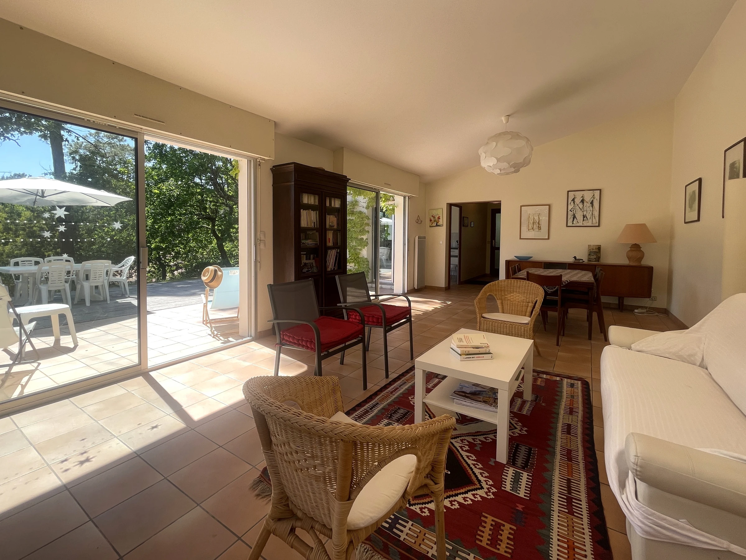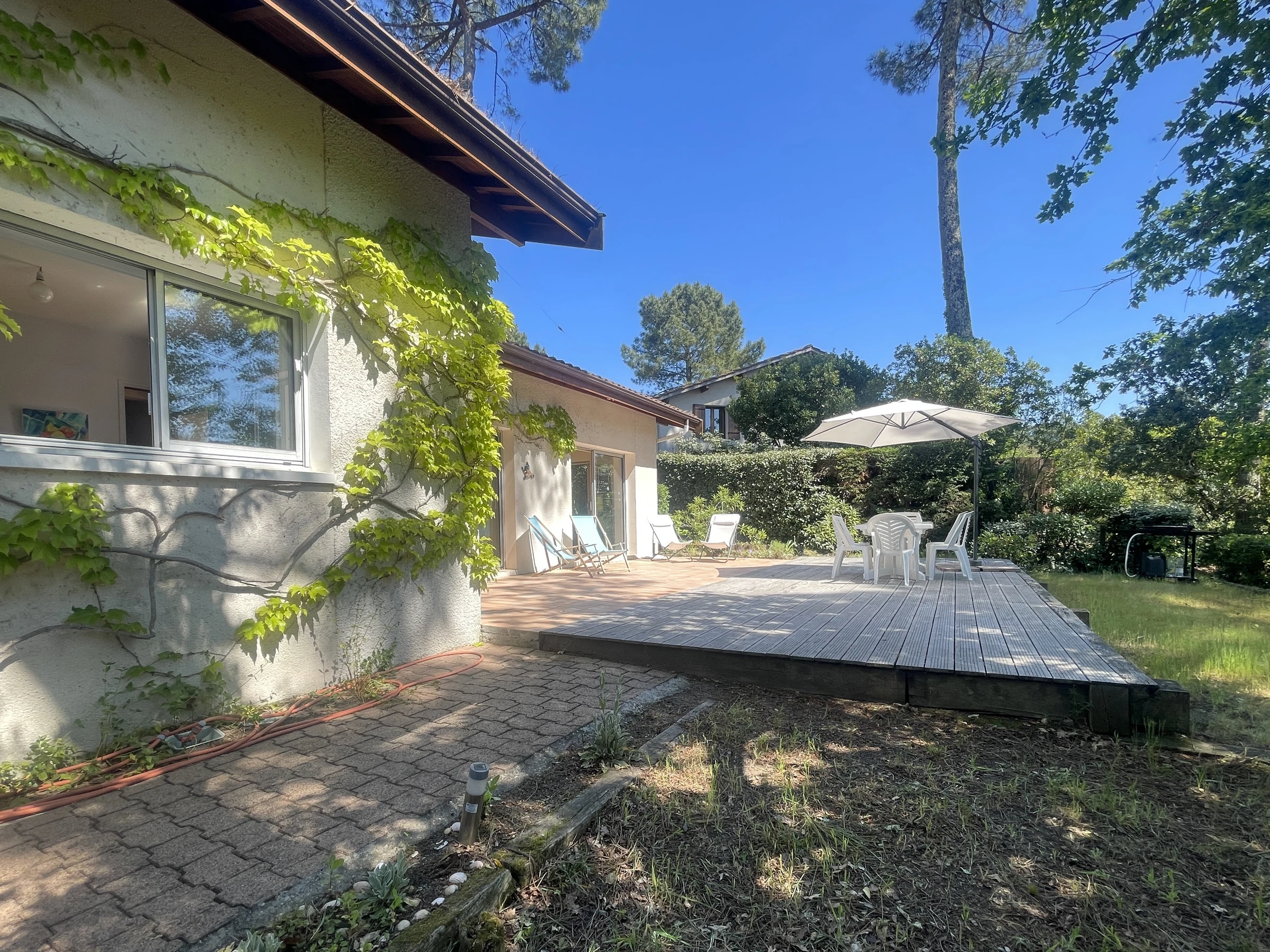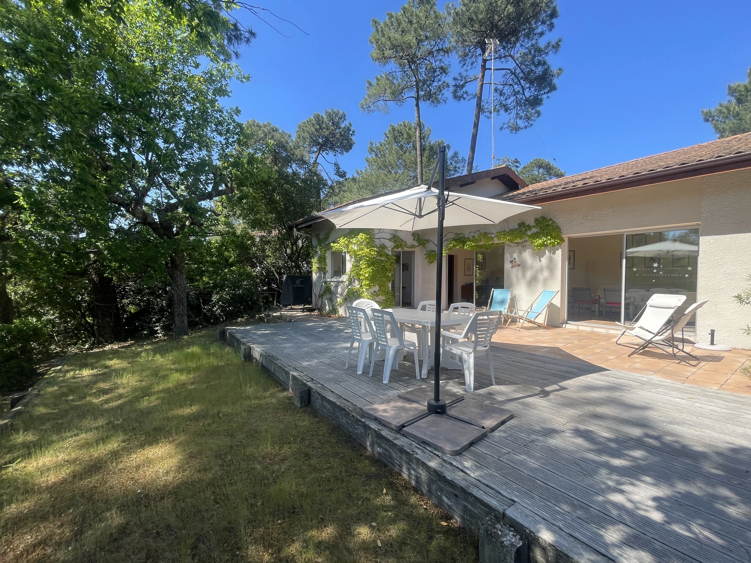 Grand jardin clos donnant sur la forêt, terrasse avec table de ping-pong, table repas, 4 chiliennes, plancha gaz, parasol...