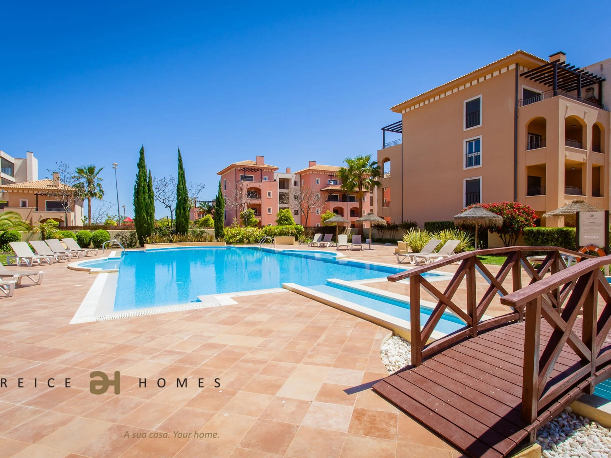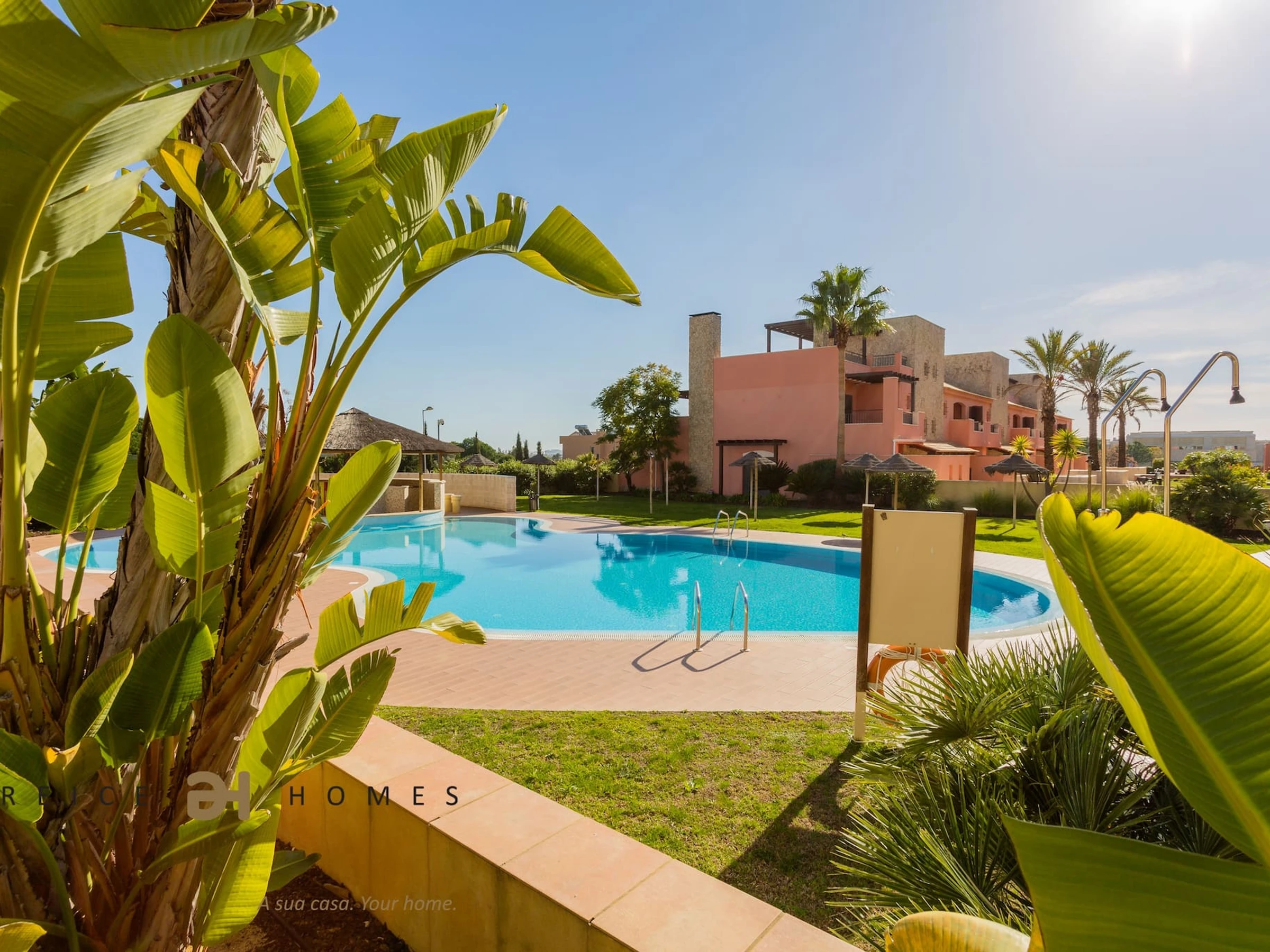 Le jardin avec pelouse et la grande piscine font de ce développement un lieu de détente pour vos vacances.
