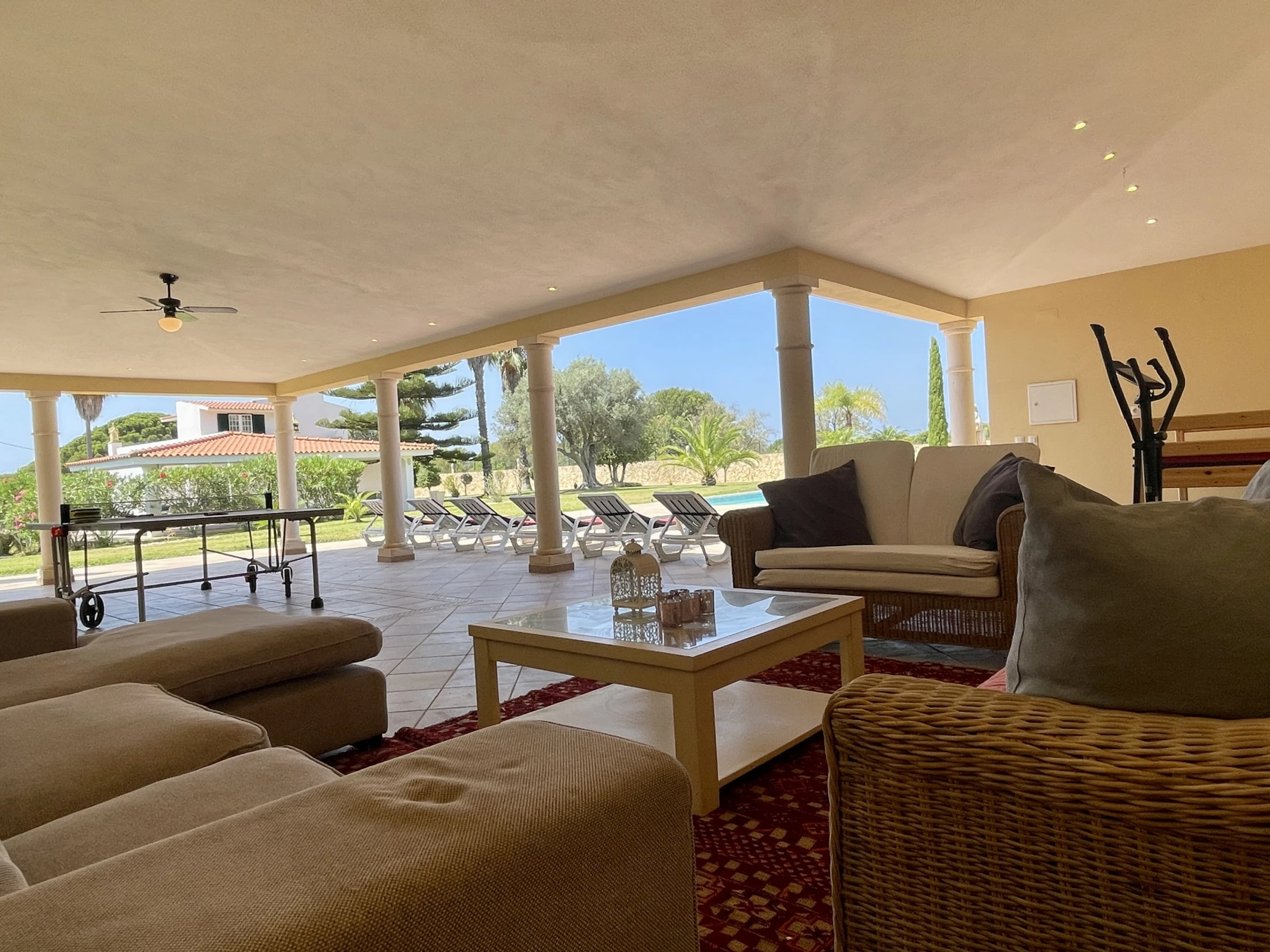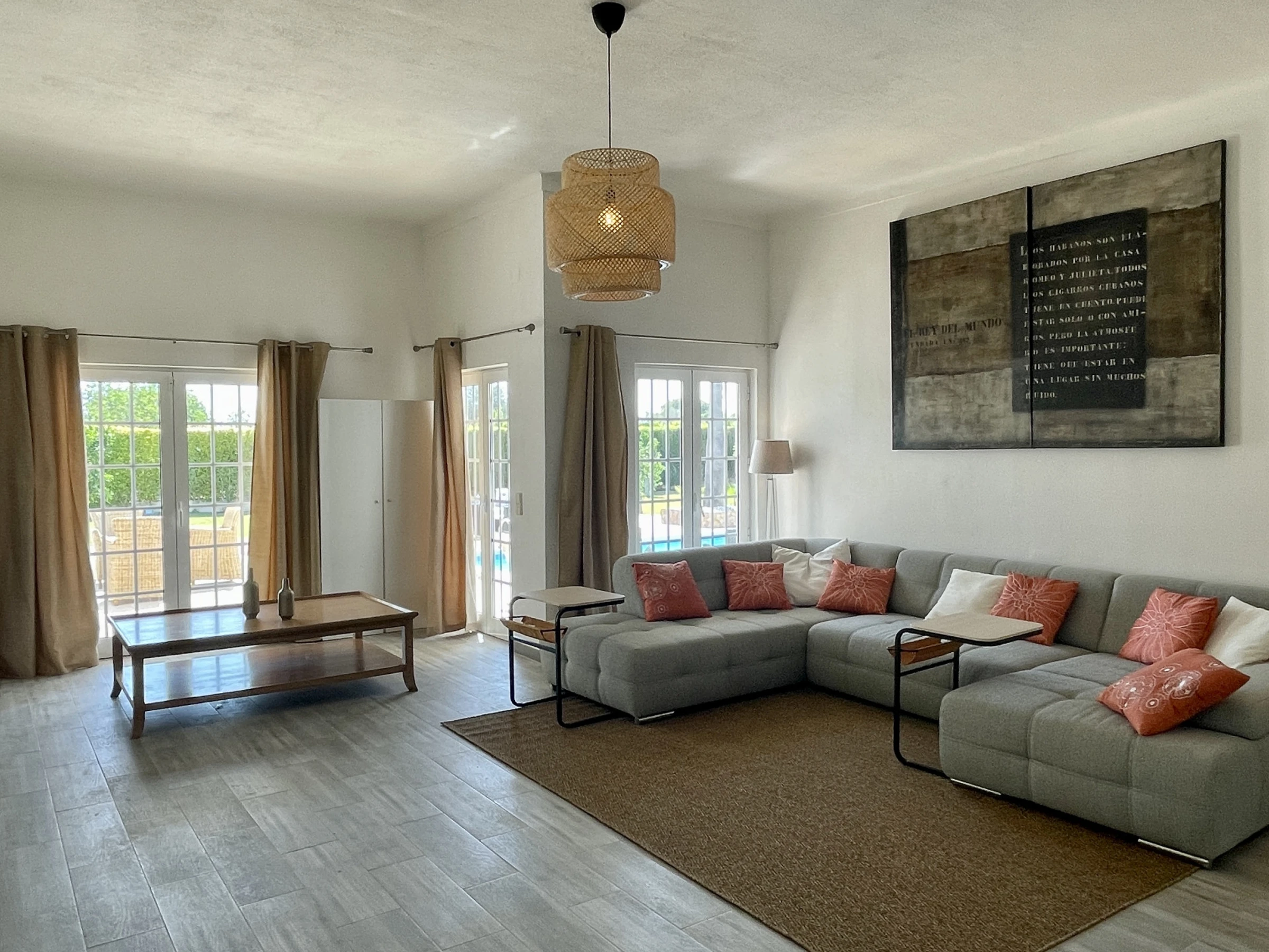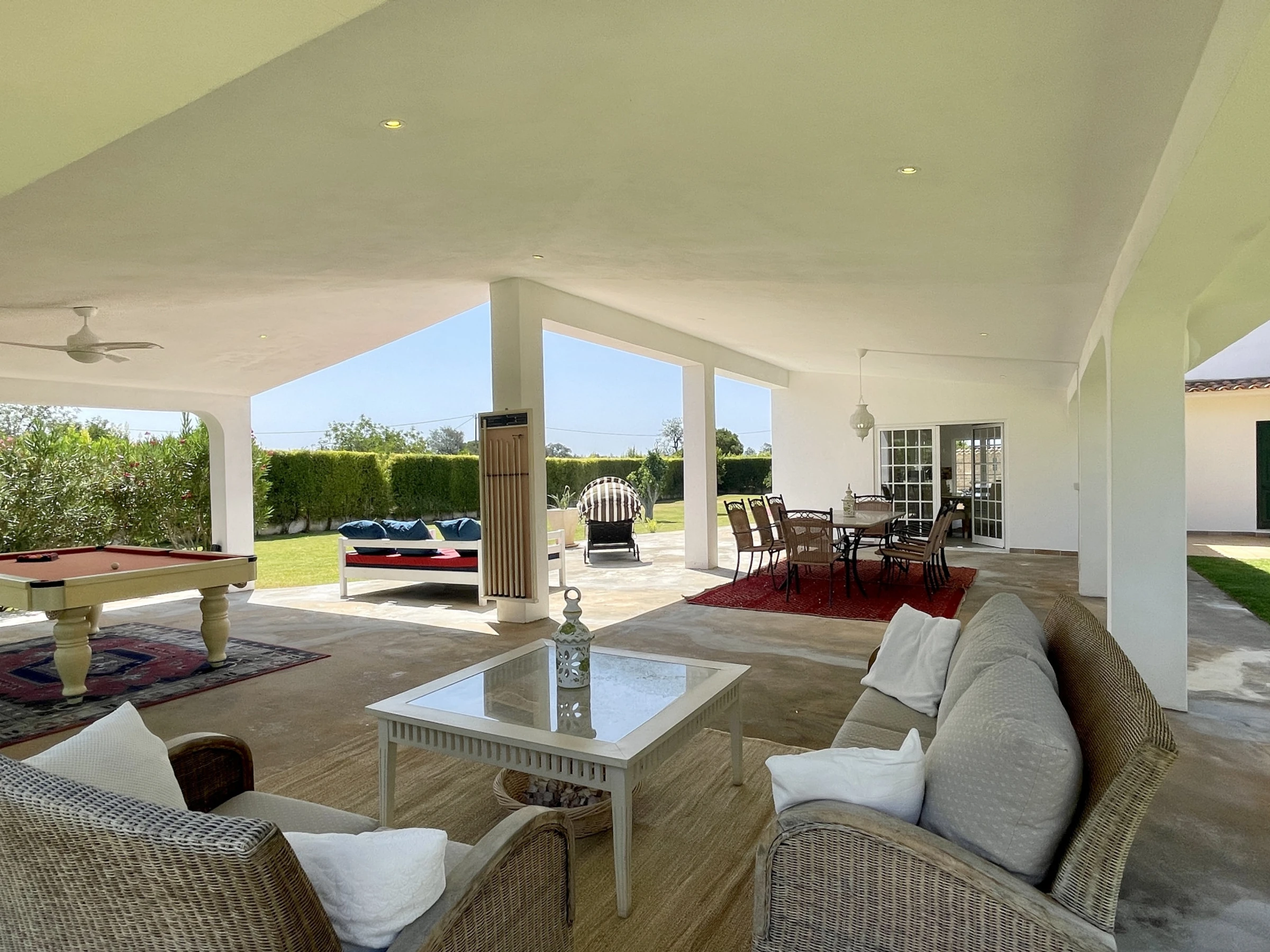 • Salon spacieux et lumineux, avec zone de repas et vue sur la piscine