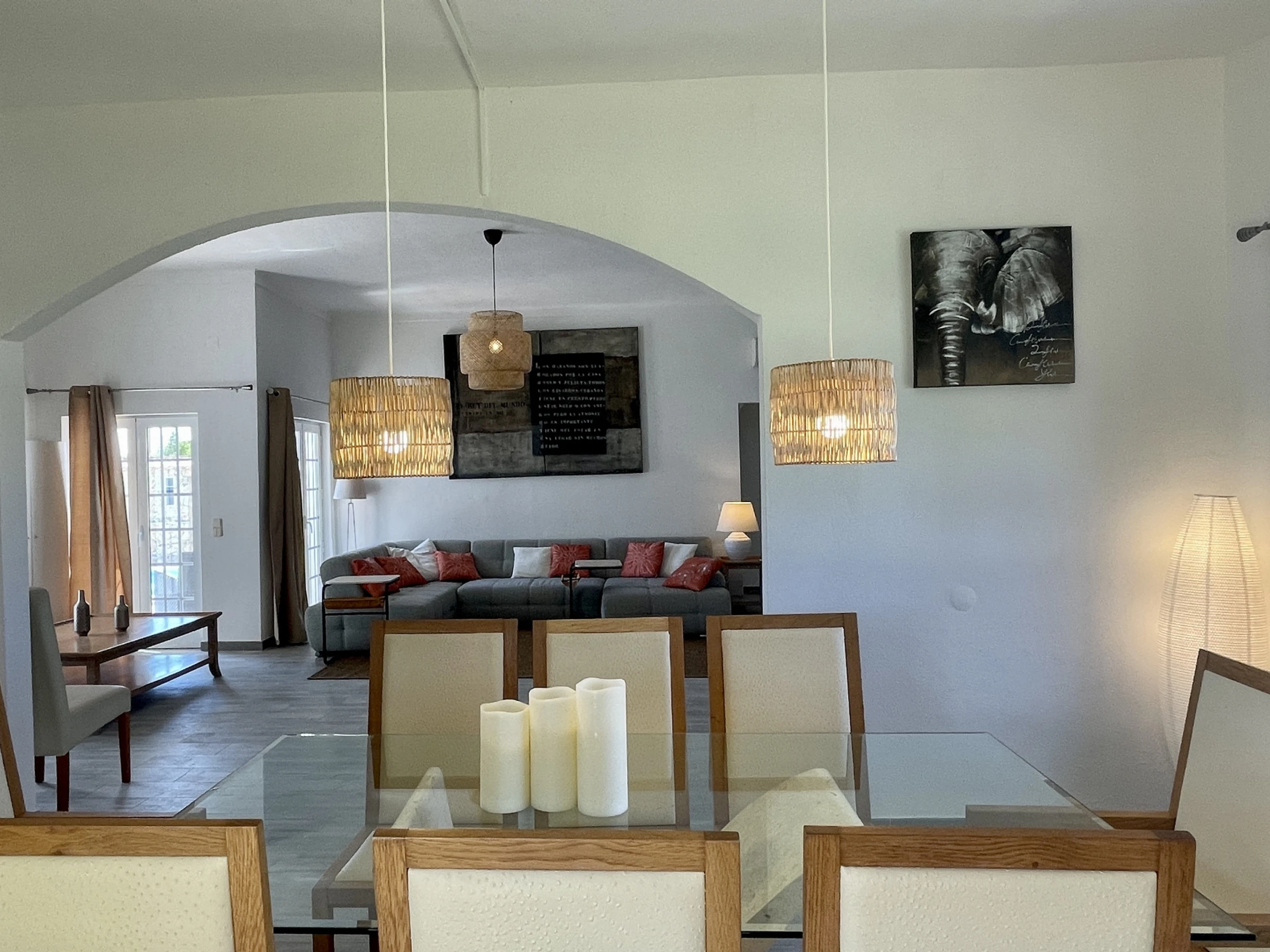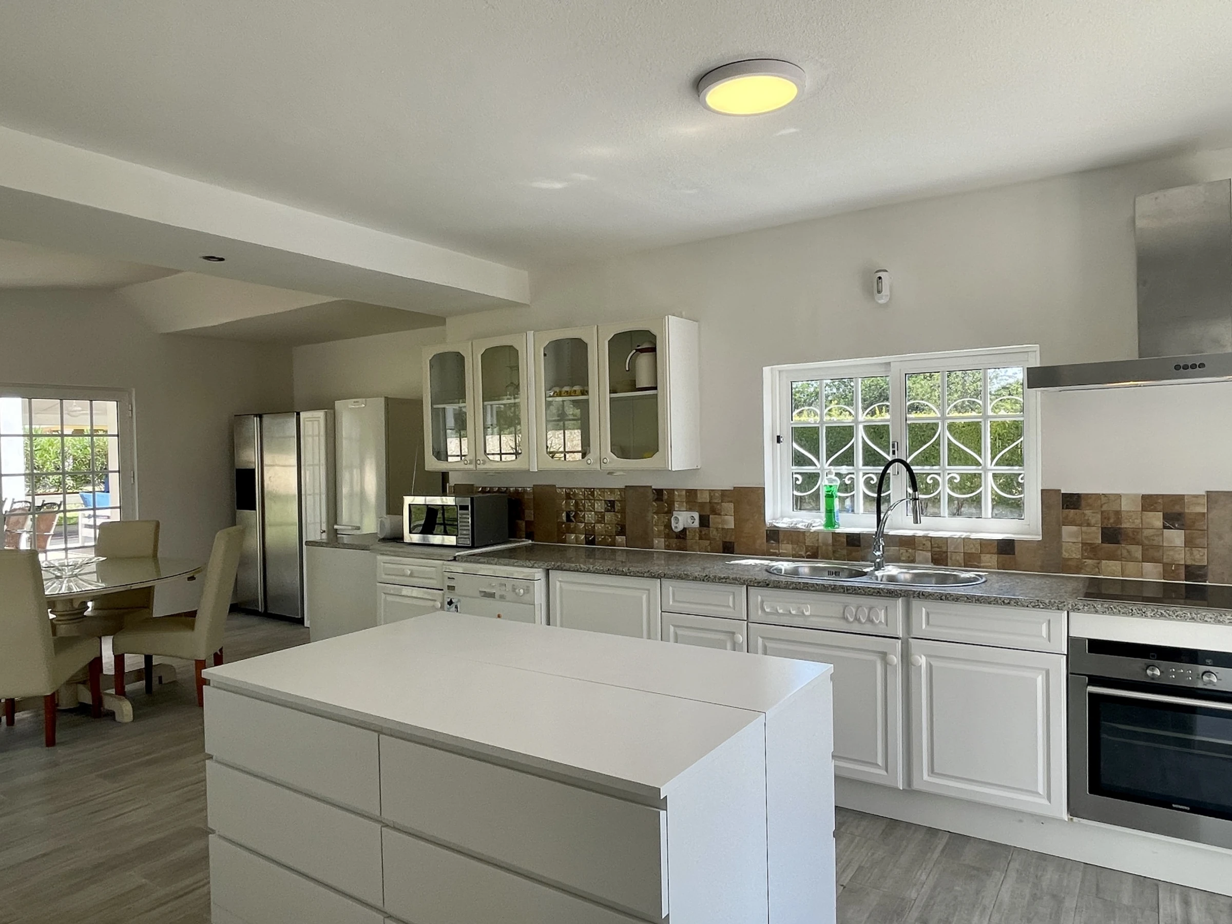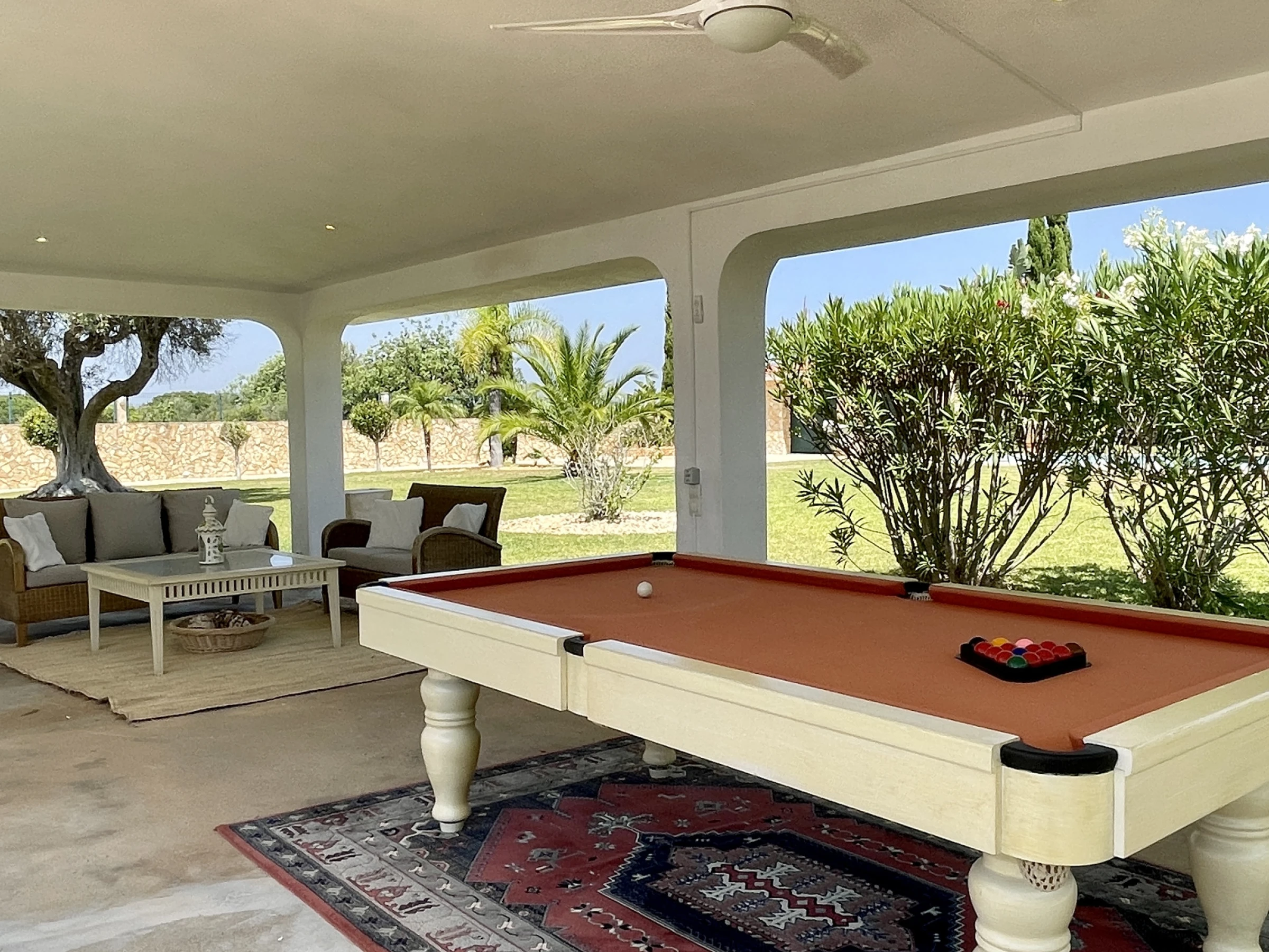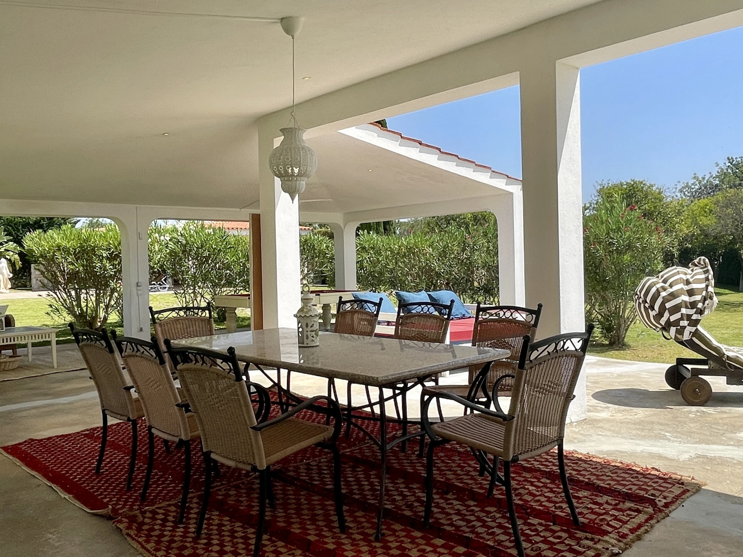 • Salon spacieux et lumineux, avec zone de repas et vue sur la piscine
