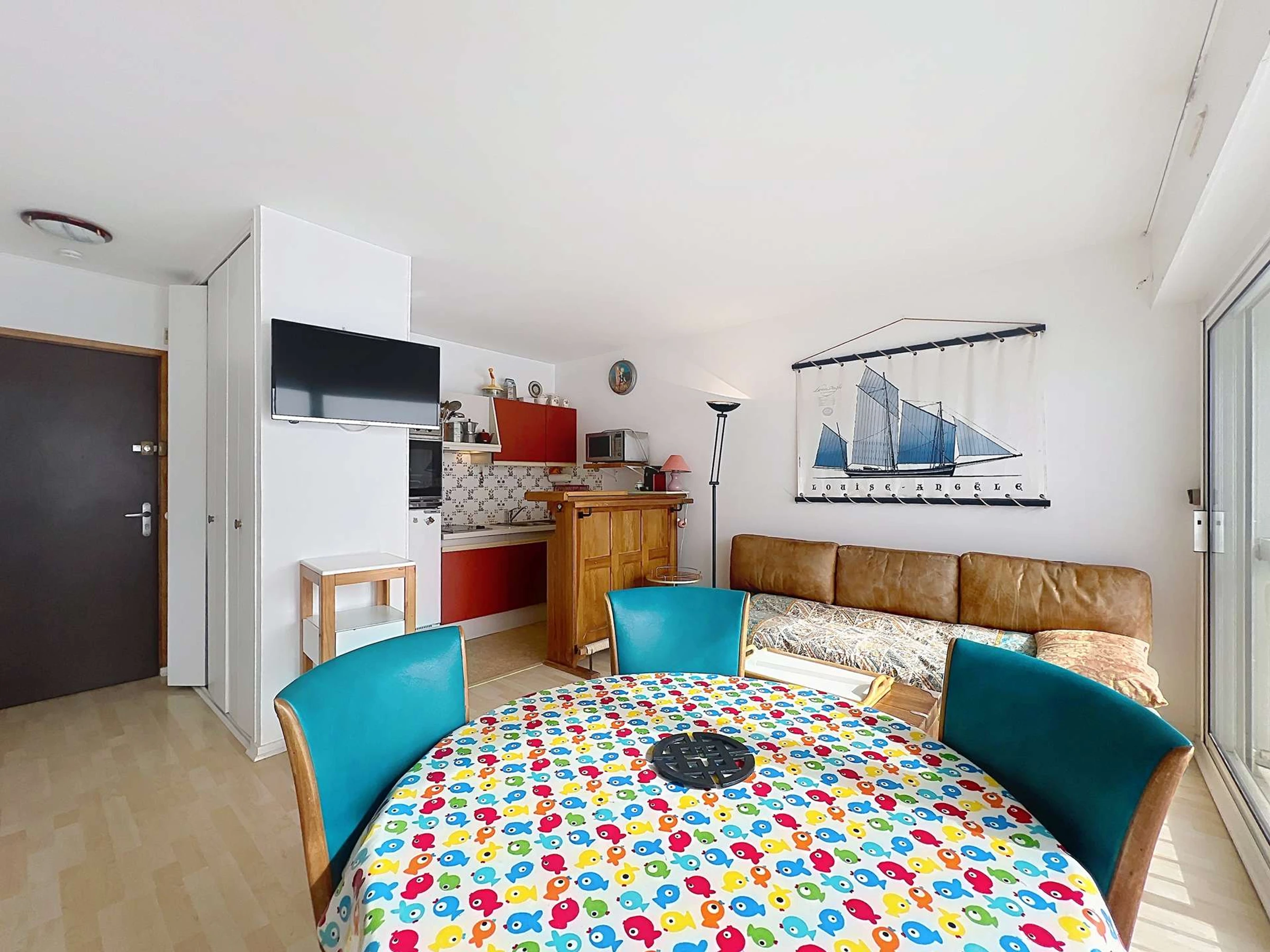 - Un séjour/salon avec canapé, table, chaises, TV,