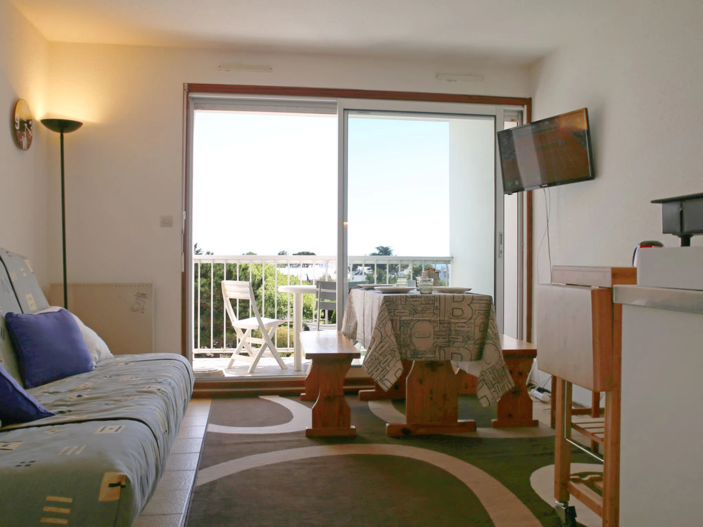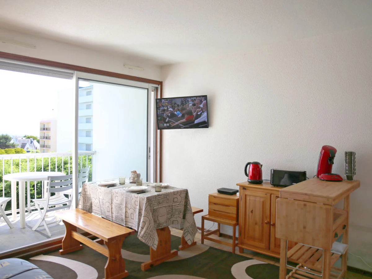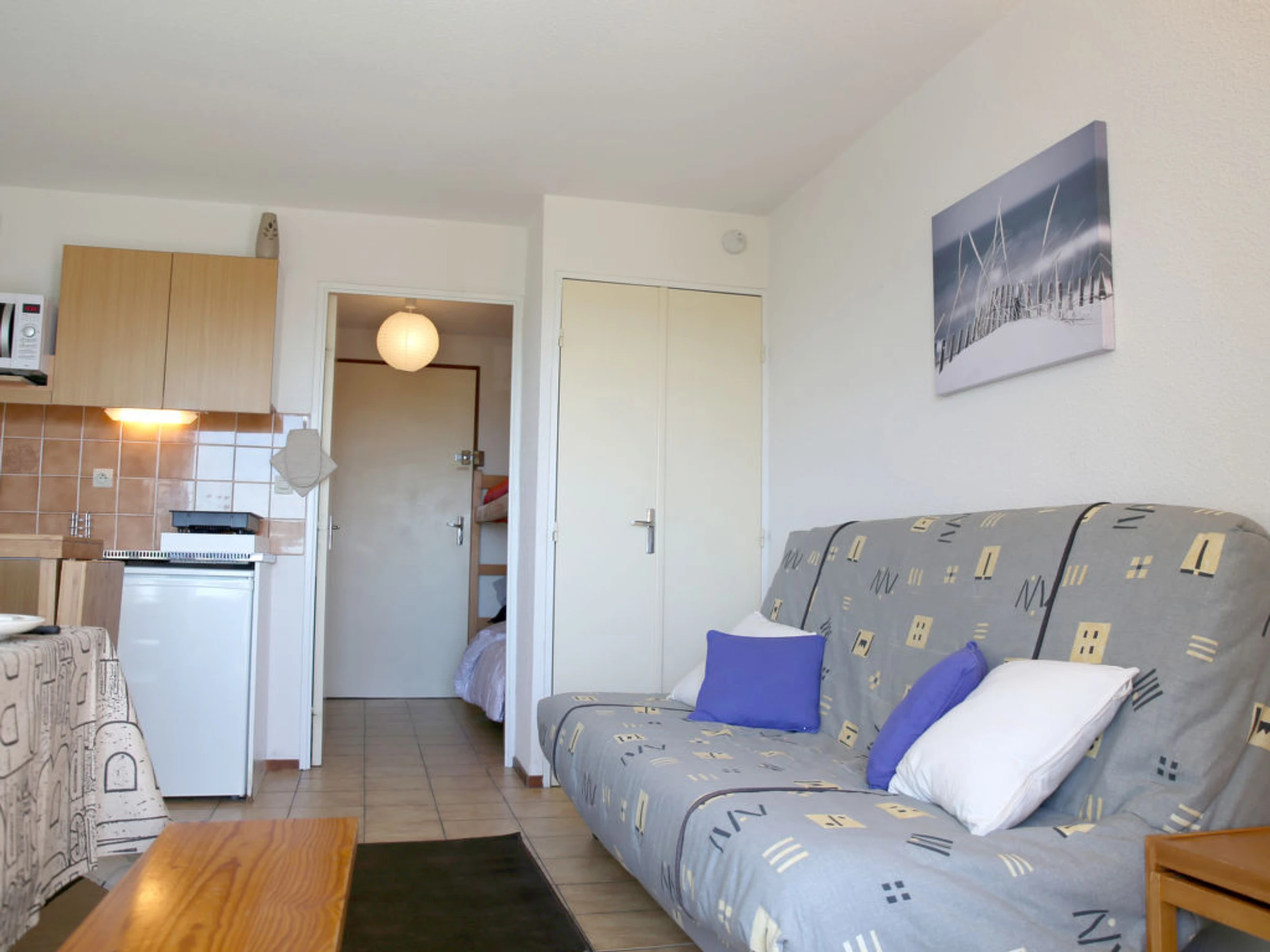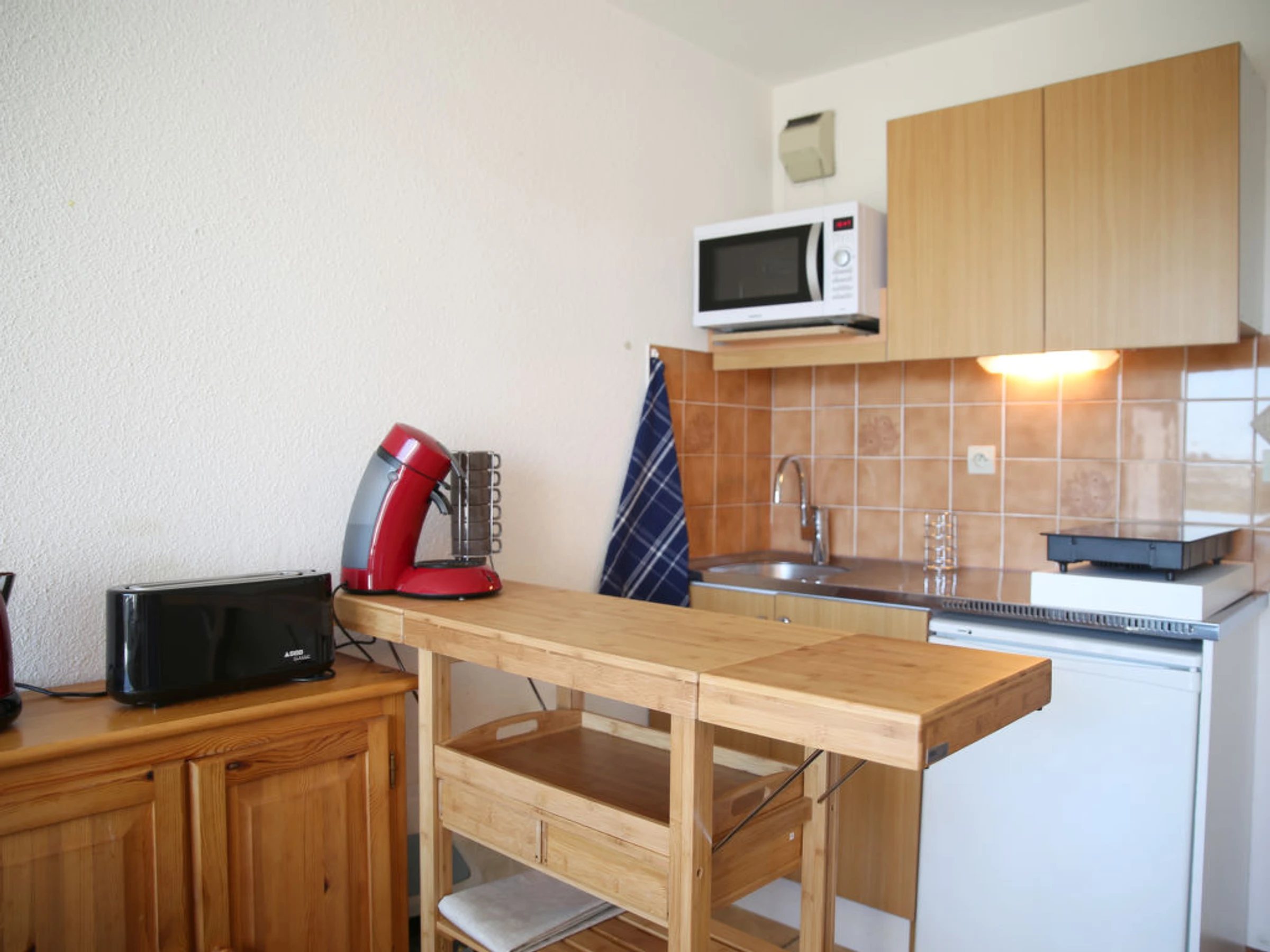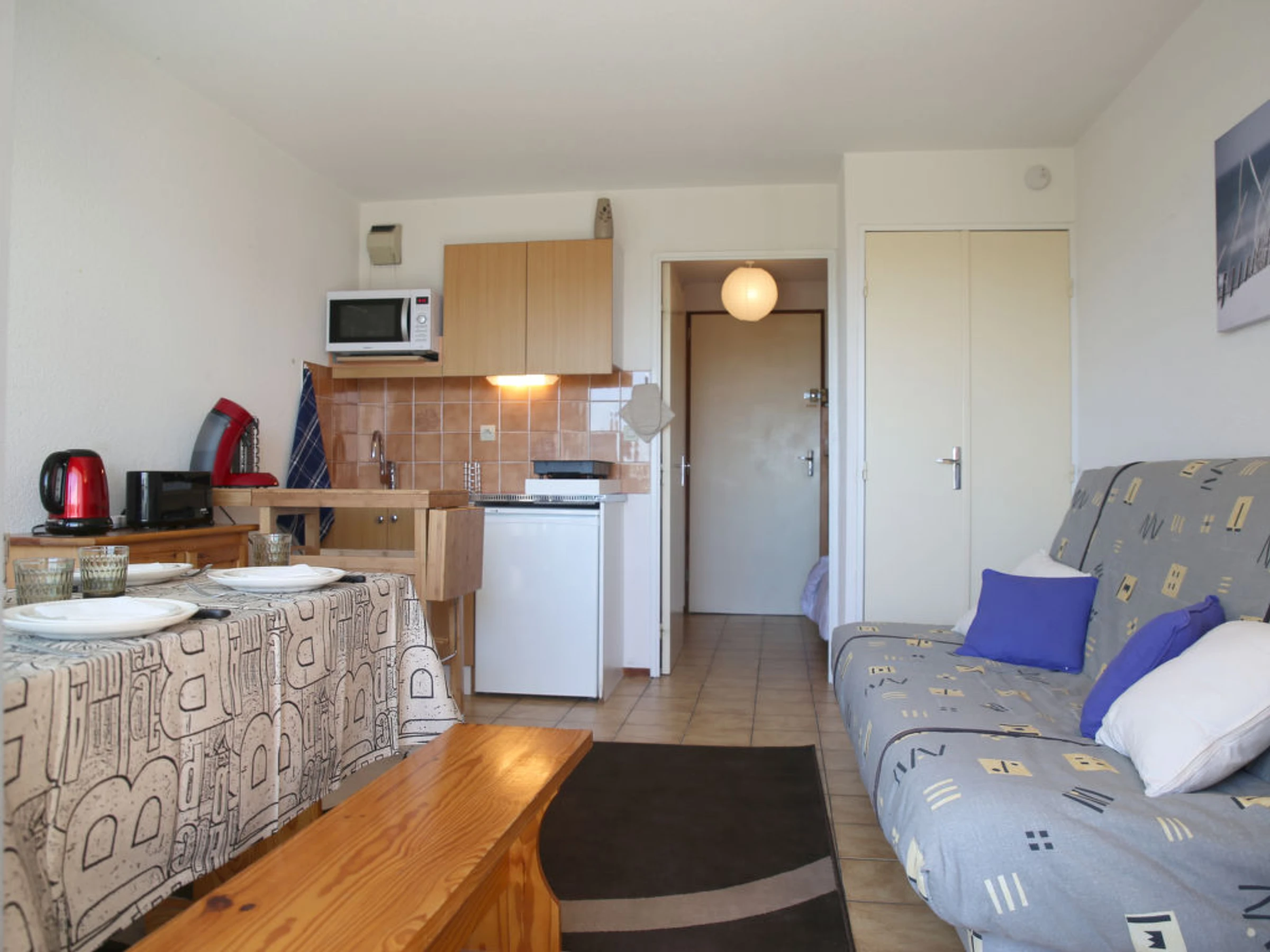 Studio 21 m2 au 4ème étage. Bien convenant à 2 adultes + 1 enfant. Aménagement simple et fonctionnel: séjour/salle à manger avec 1 divan-lit double (1 x 140 cm, longueur 190 cm), 1 x 1 lits superposés (90 cm, longueur 190 cm), TV (écran plat). Sortie sur le balcon. Coin cuisine (2 plaques à induction, cafetière électrique, combiné micro-ondes). Douche, WC séparé. Chauffage électrique. Balcon. Mobilier de balcon. Vue éloignée sur la mer. A disposition: Internet (Connexion WIFI). Place de parking. Veuillez noter: 1 animal/ chien de petite taille autorisé. Détecteur de fumée.