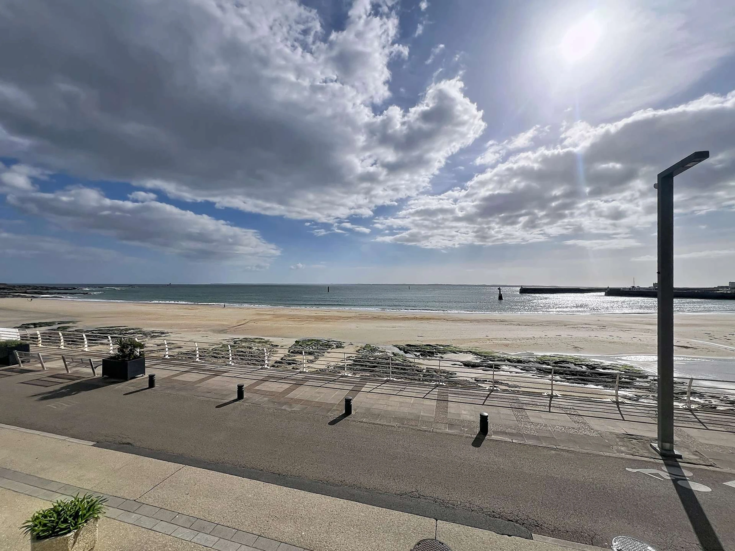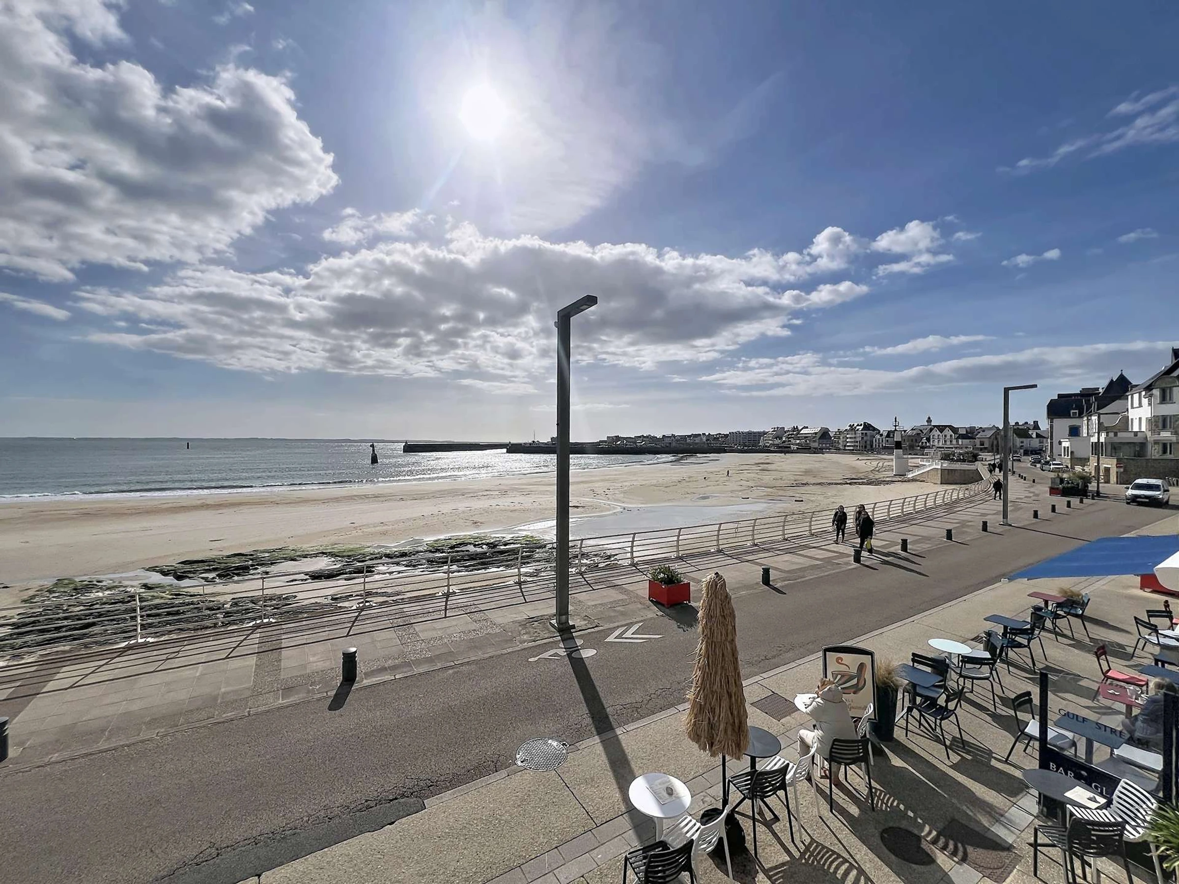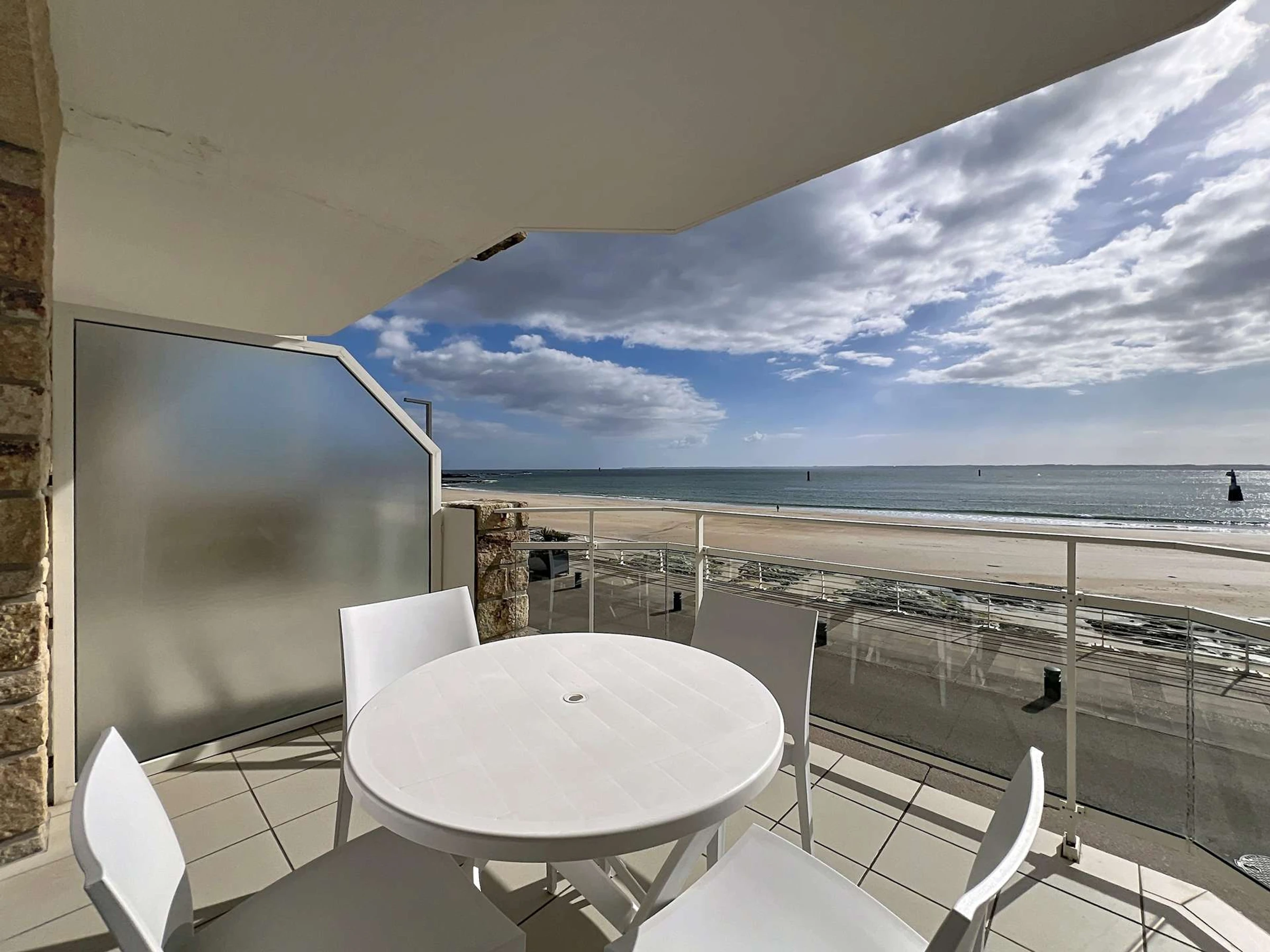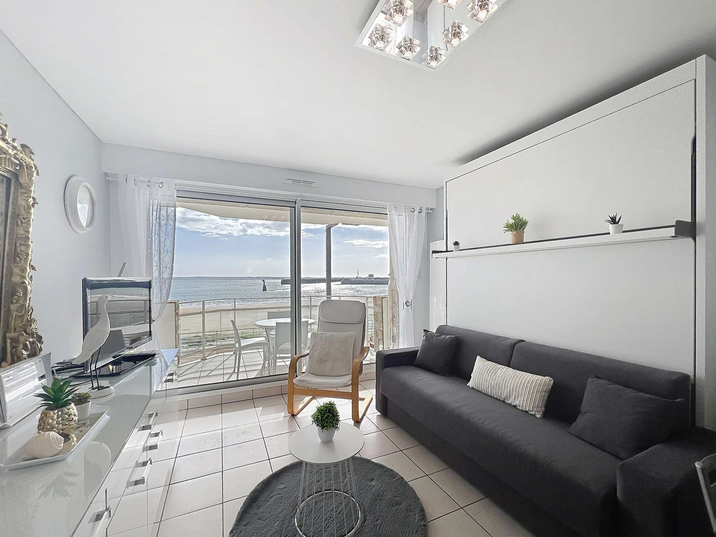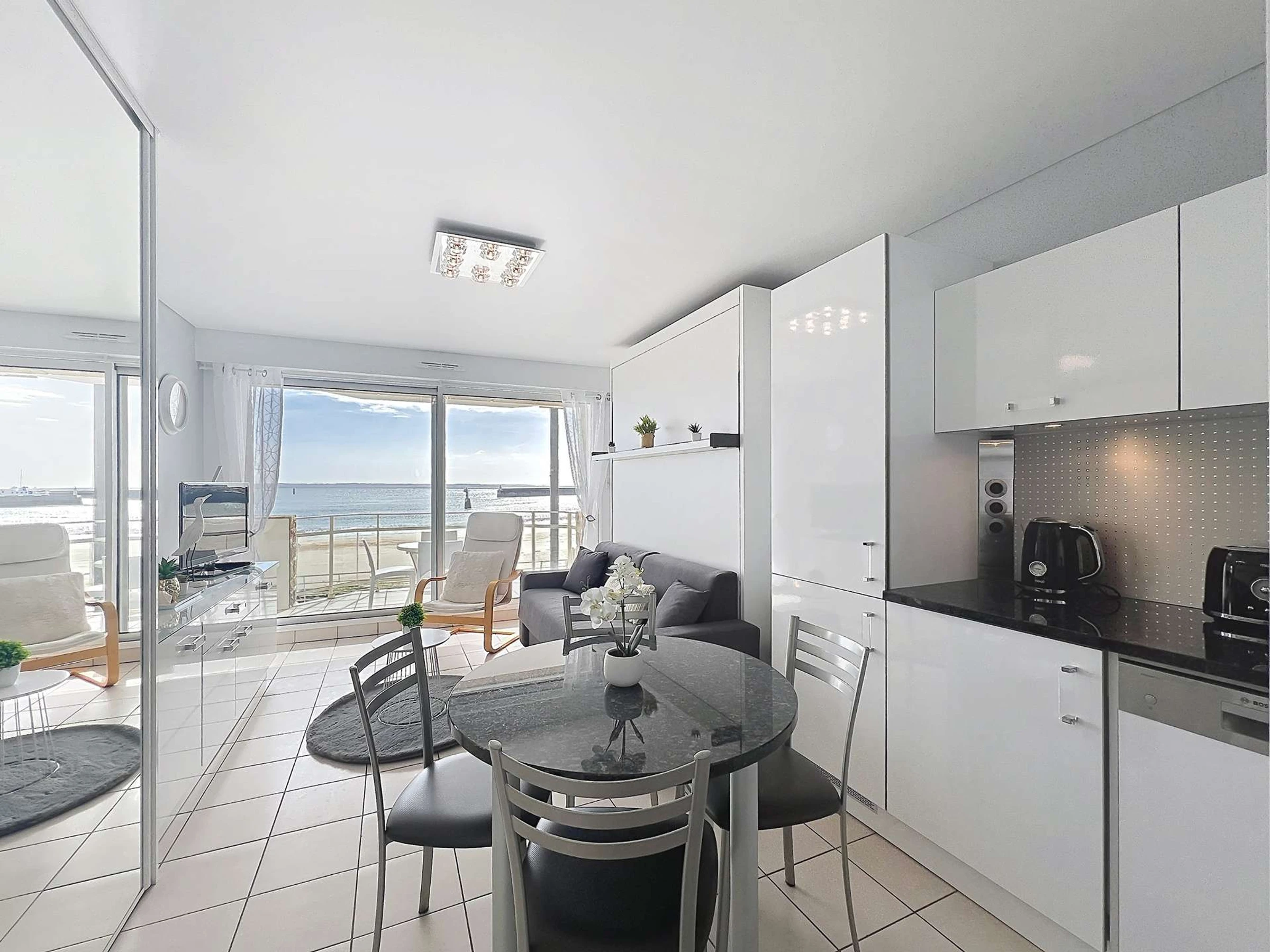 Studio de standing pour 3 personnes, entièrement rénové, au 1er étage, porte n°2 de la résidence Nausicaa. Il offre une vue directe sur mer, face à la Grande Plage de Quiberon et à deux pas du centre-ville.