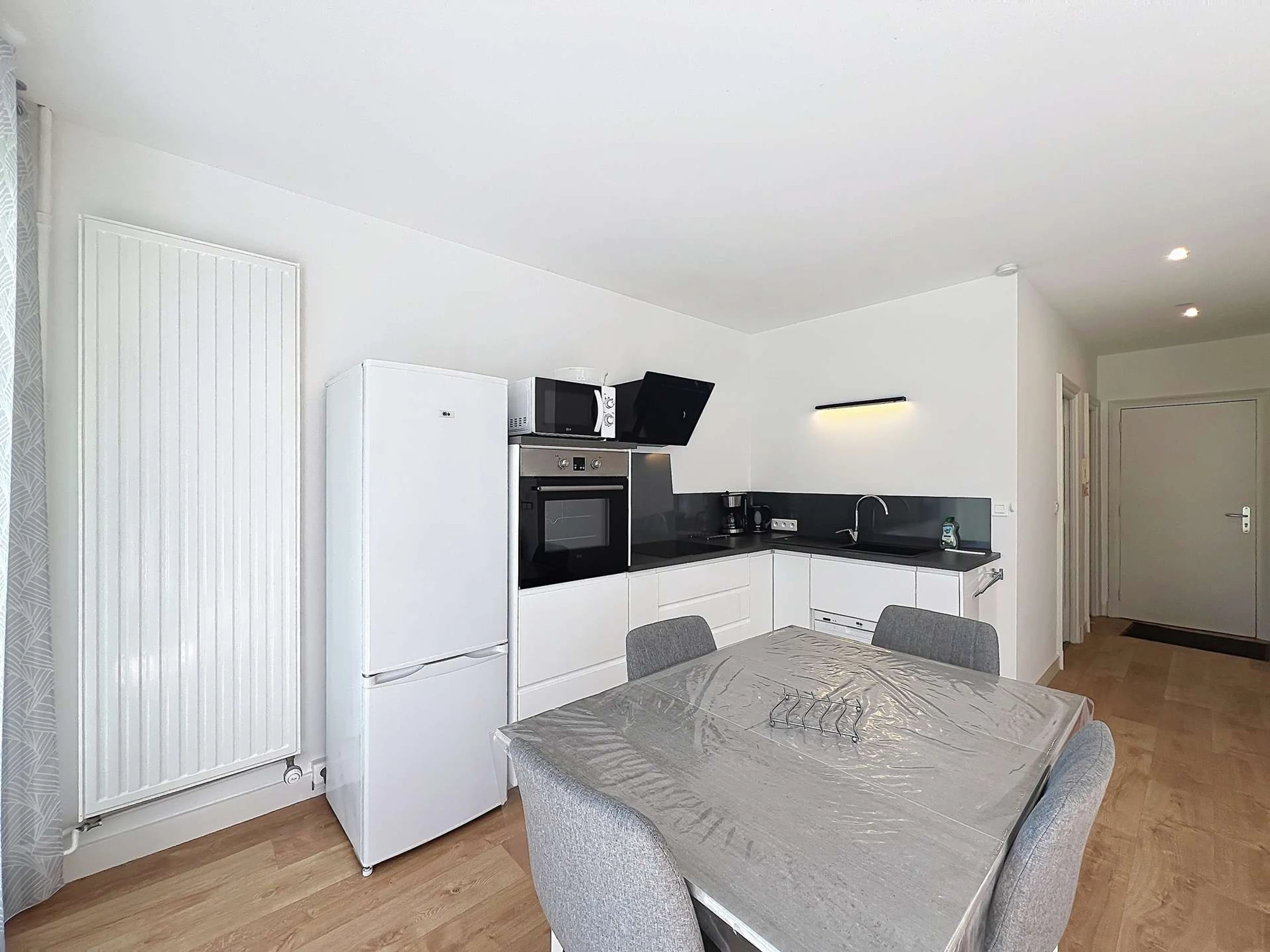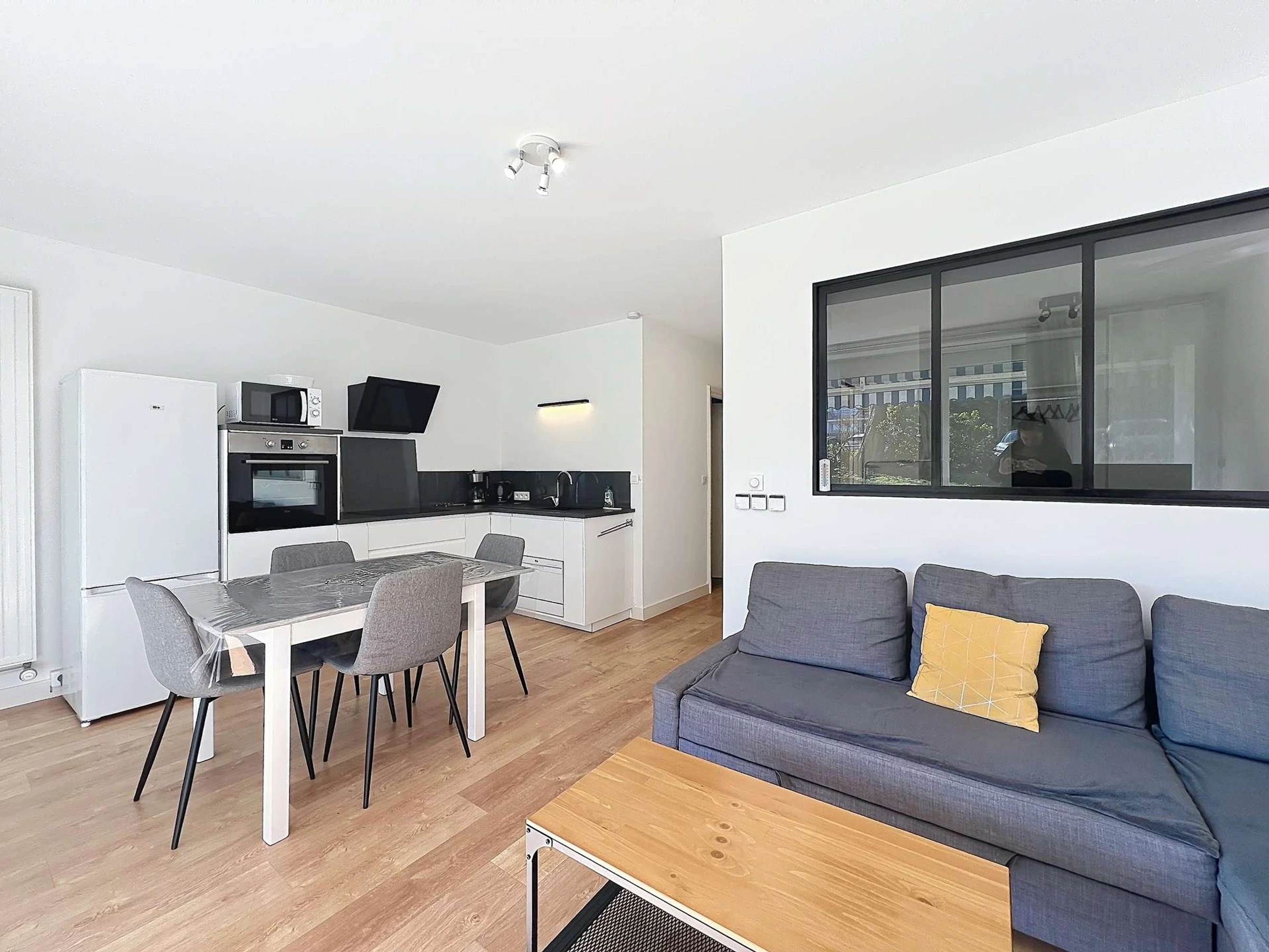-une cuisine ouverte aménagée et équipée (four, lave-vaisselle, plaque de cuisson induction, micro-ondes, frigo/congélateur),