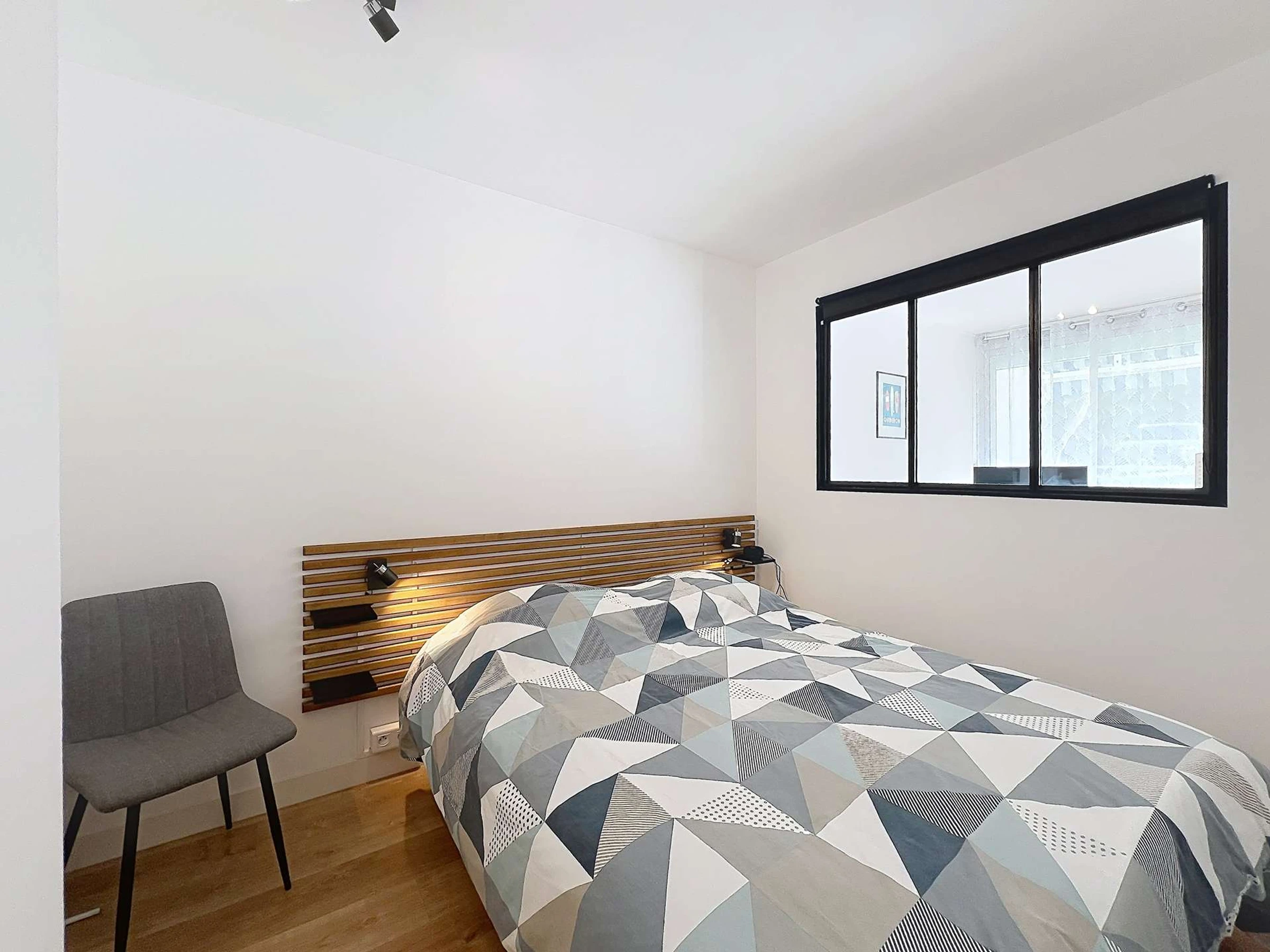 -une chambre avec un lit de 160x200cm et un grand placard,