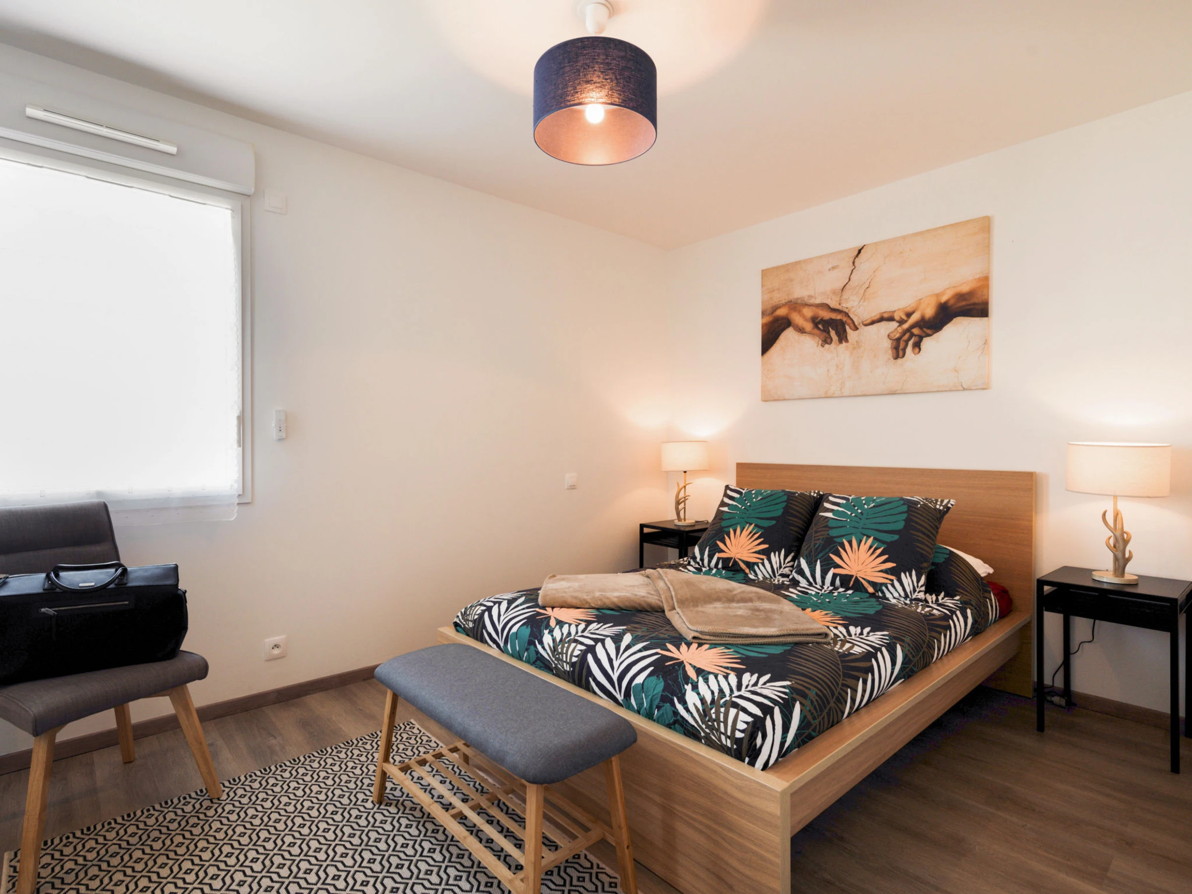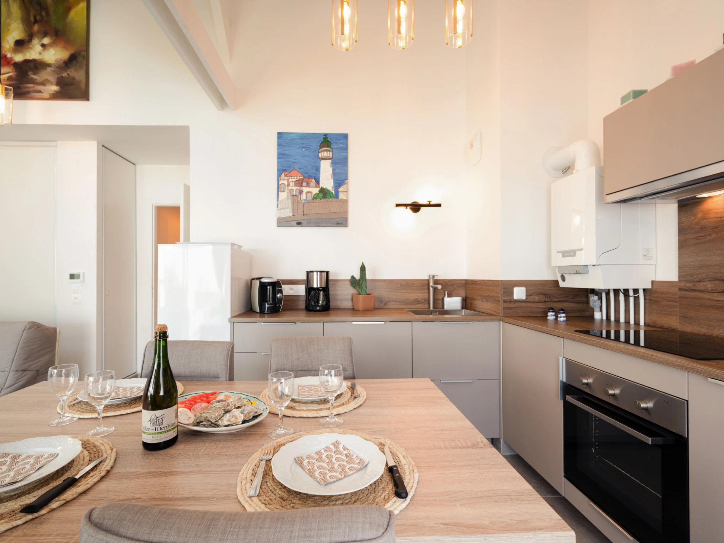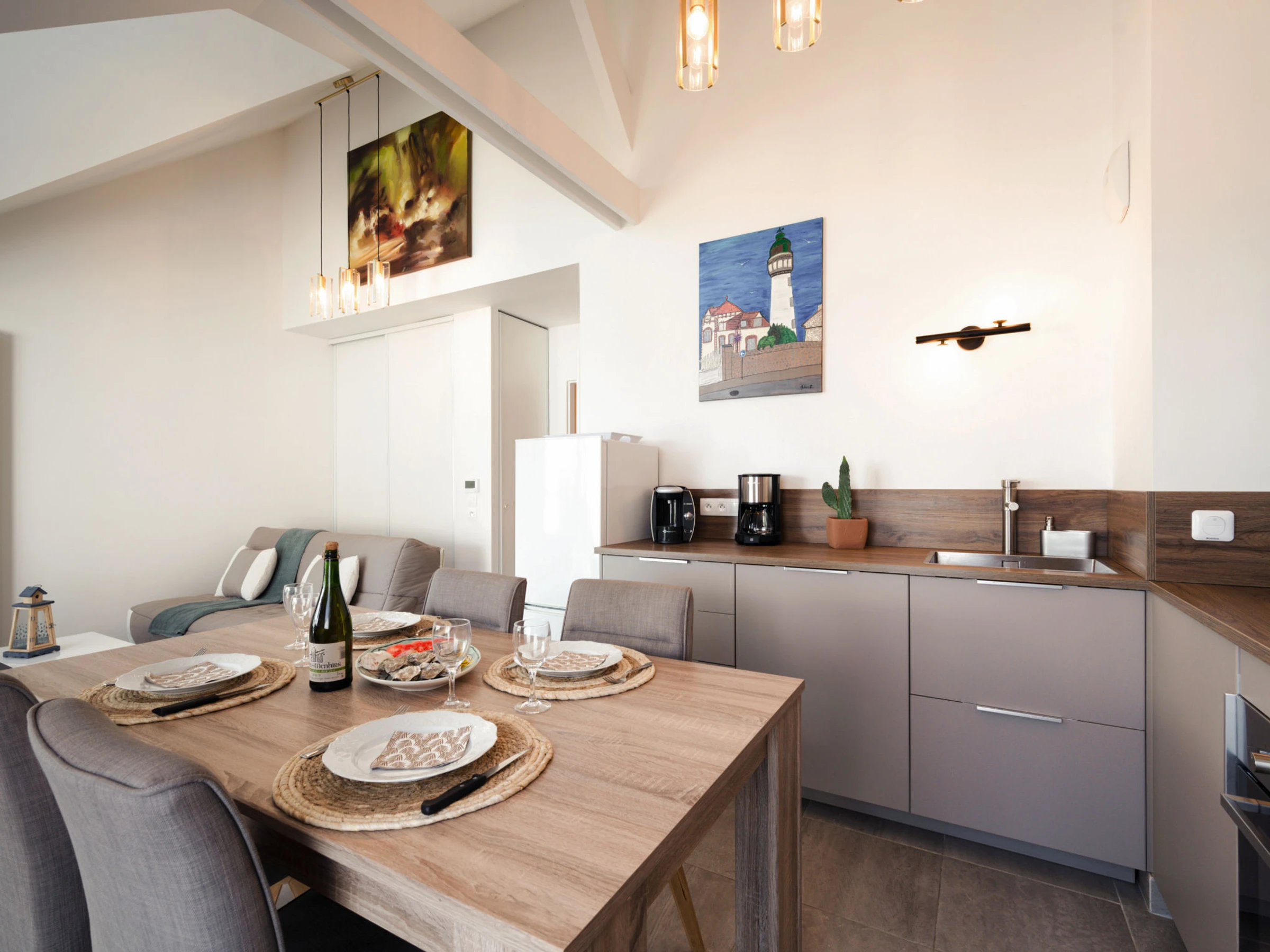 "Parc Océan", apt 2 pièces 43 m2 au 3ème étage. Aménagement confortable: séjour/salle à manger avec 1 divan-lit double (1 x 160 cm, longueur 200 cm), TV (écran plat). Sortie sur la terrasse. 1 chambre avec 1 grand-lit (1 x 140 cm, longueur 190 cm), TV (écran plat). Cuisine ouverte (four, 4 plaques vitrocéramiques, bouilloire électrique, cafetière électrique, combiné micro-ondes). Salle de bains, WC séparé. Chauffage. Terrasse 12 m2. Meubles de terrasse. A disposition: lave-linge. Internet (Connexion WIFI, gratuit). Place de parking No 6. Veuillez noter: logement non-fumeur. Détecteur de fumée. Annonce d'un particulier (art 155, IV du CGI).