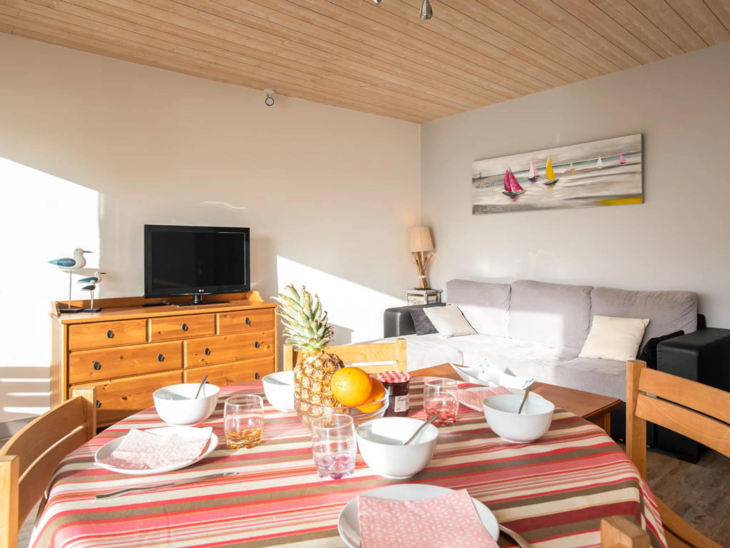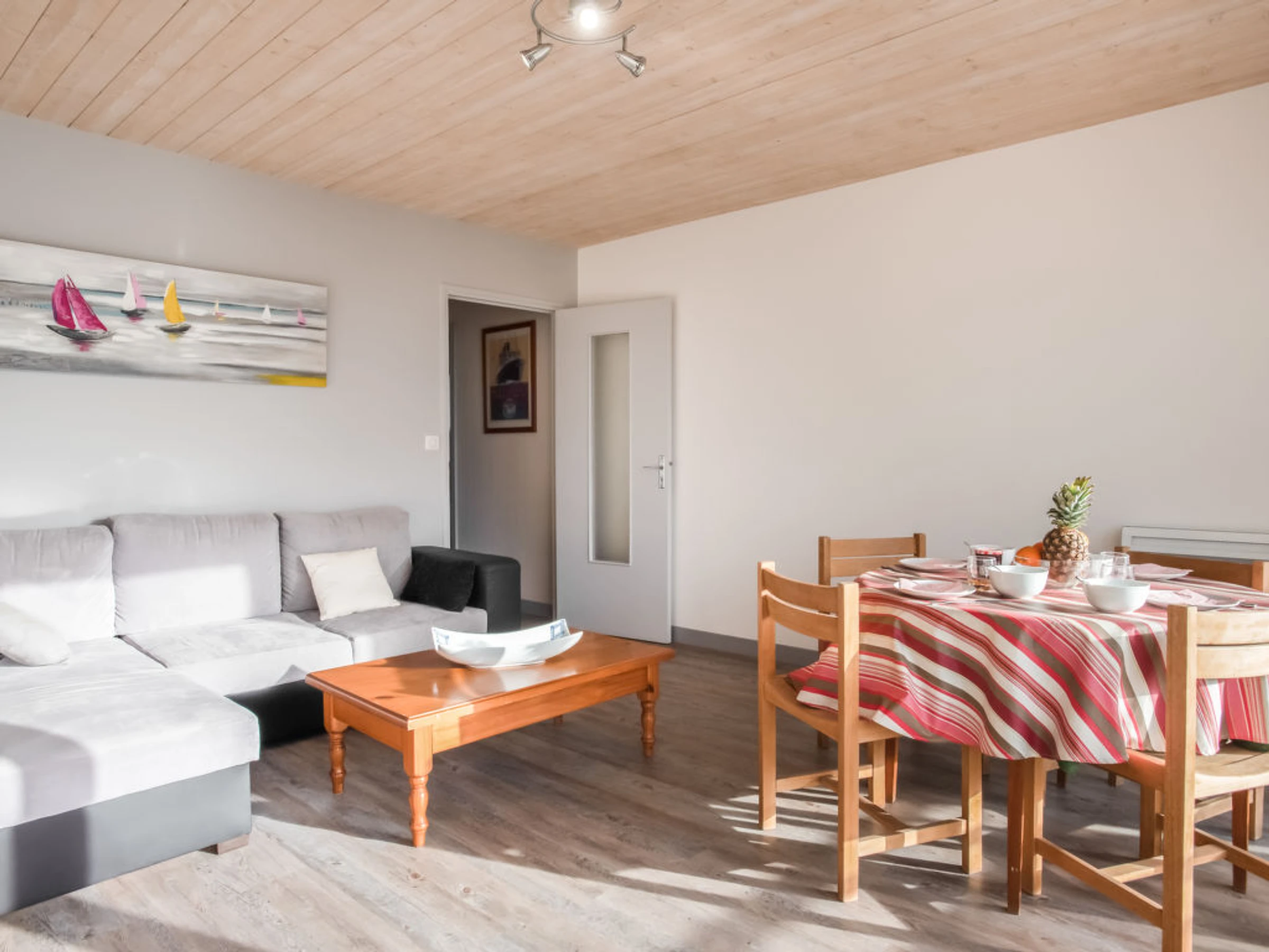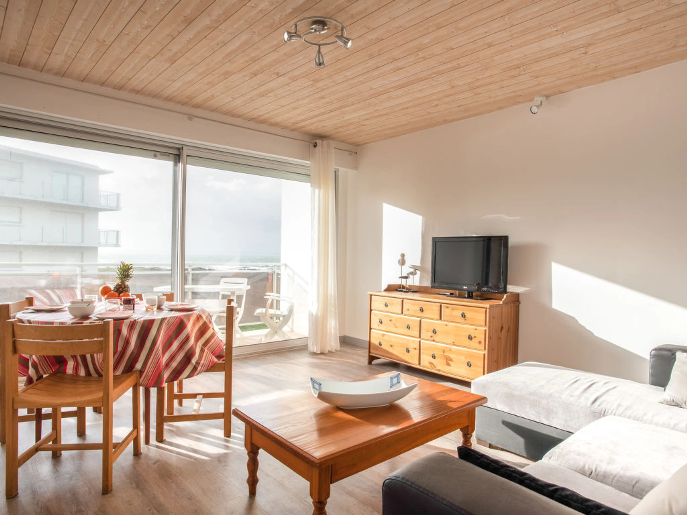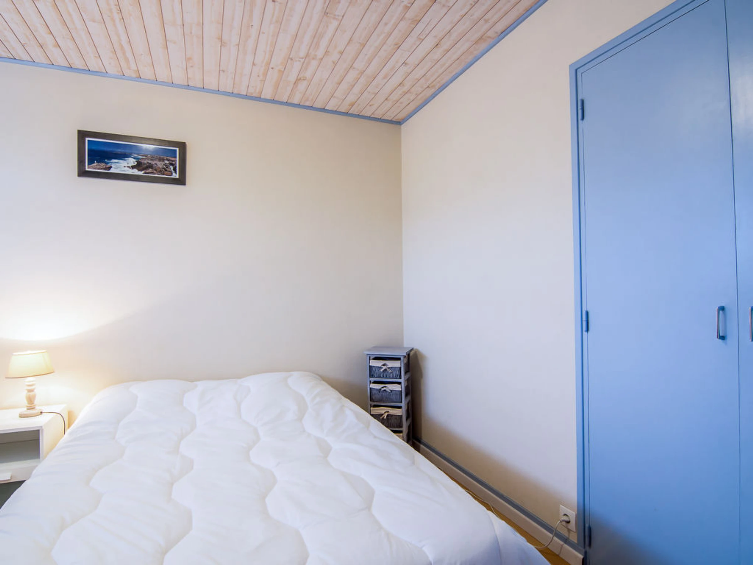 Apt 2 pièces 42 m2 au 1er étage. Aménagement fonctionnel et agréable: séjour/salle à manger avec 1 divan-lit double et TV (écran plat). Sortie sur le balcon. 1 chambre avec 1 grand-lit (1 x 140 cm, longueur 190 cm). Cuisine (four, lave-vaisselle, 3 plaques à induction, four micro-ondes, cafetière électrique). Douche/WC. Chauffage électrique. Mobilier de balcon. Vue sur la mer. A disposition: lave-linge, chaise haute pour enfant, lit bébé. Internet (Connexion WIFI, gratuit). Place de parking. Veuillez noter: détecteur de fumée.