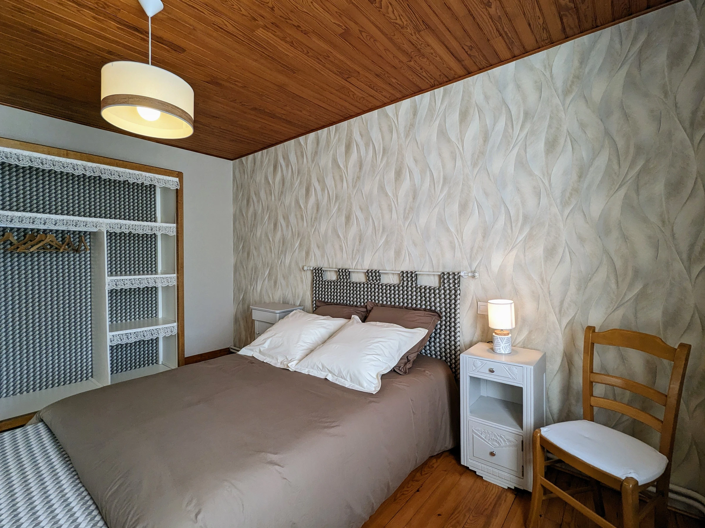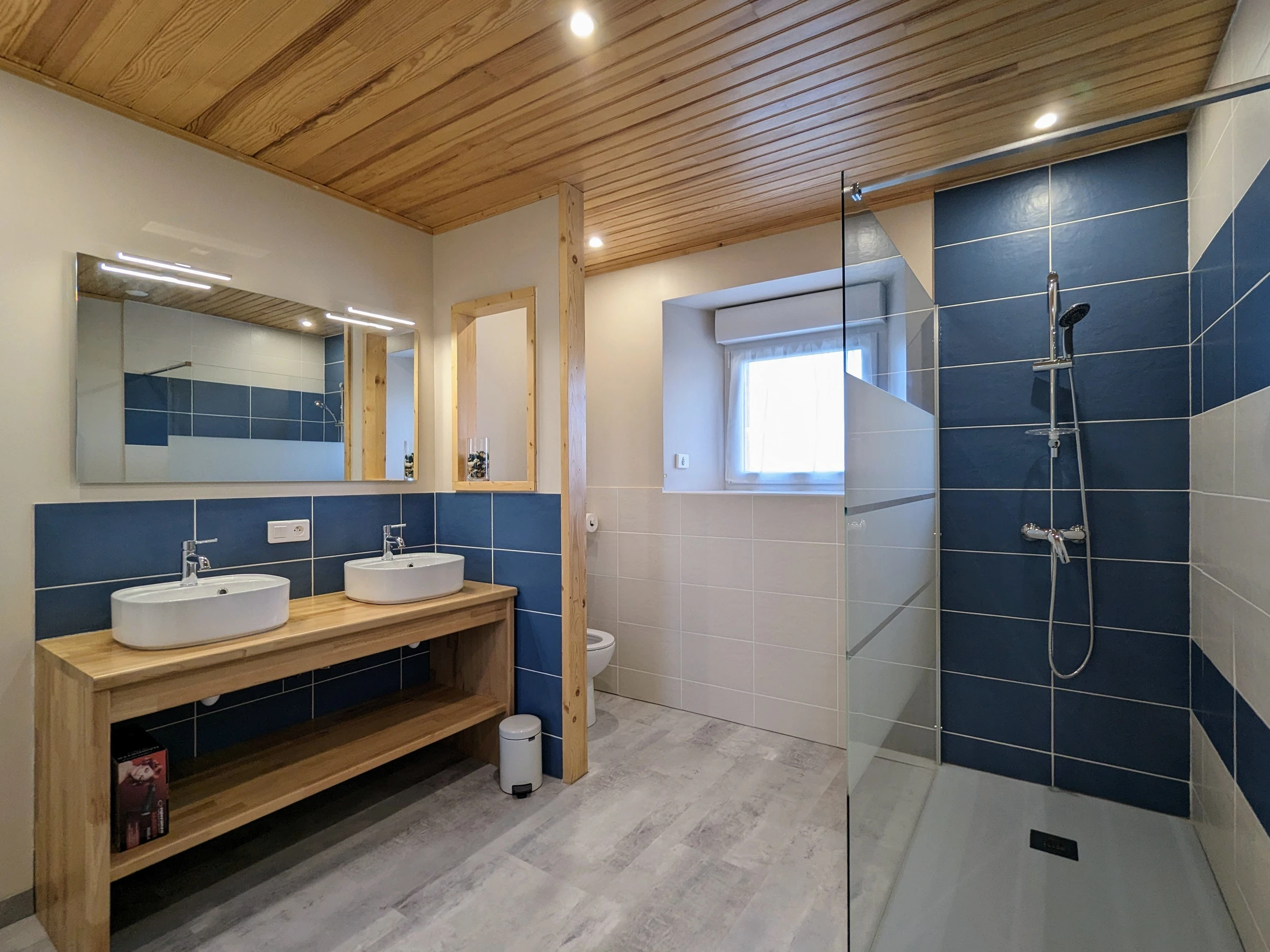 Au premier étage vous disposerez de 2 chambres avec lits doubles, une chambre avec 2 lits superposés en 90 et une grande salle d'eau avec douche et meuble double vasque.