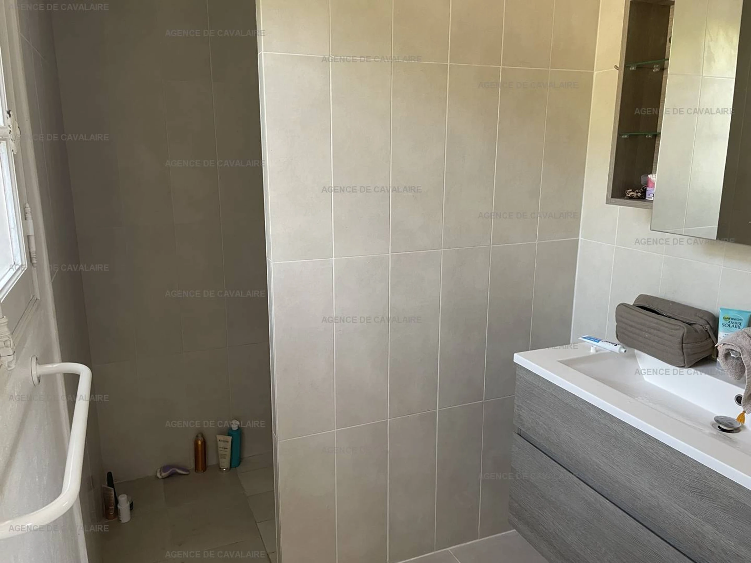 Au second niveau, 3 chambres climatisées (1x2 lits 90) donnant sur un balcon avec vue mer, dont 2 avec salle d'eau, un WC indépendant avec vasque.