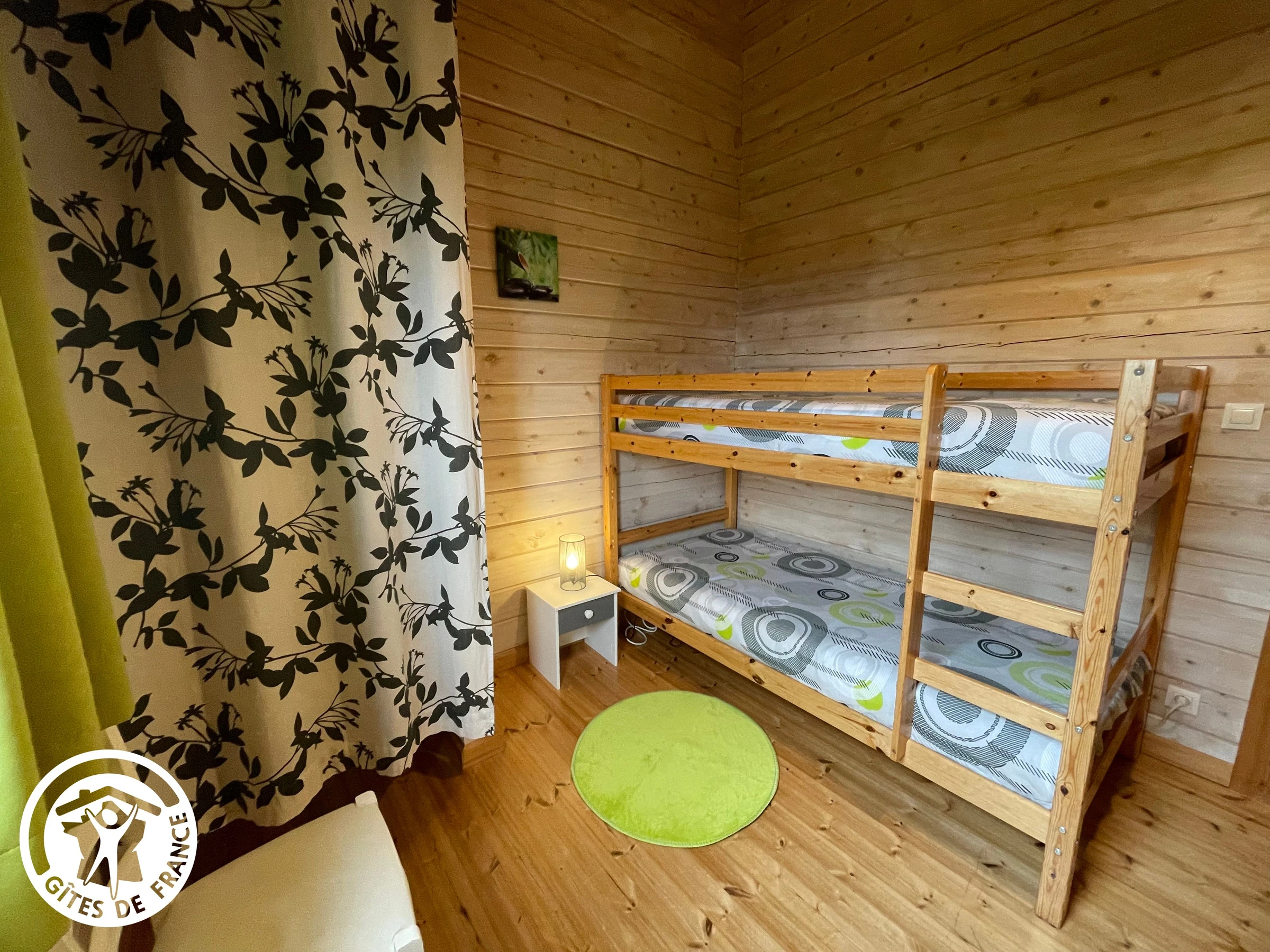 Maison indépendante en bois massif construite en 2007, située dans un petit hameau. RDC: séjour/salon (radio/CD)/coin-cuisine, salle d'eau, wc, chambre 1 (1 lit 160), chambre 2 (3 lits 1 personne dont 2 superposés). Terrain aménagé clos de 500 m² (terrasse couverte, salon de jardin, barbecue, 2 bains de soleil, 2 transats, jeu de badminton, ping-pong). Garage. En supplément :