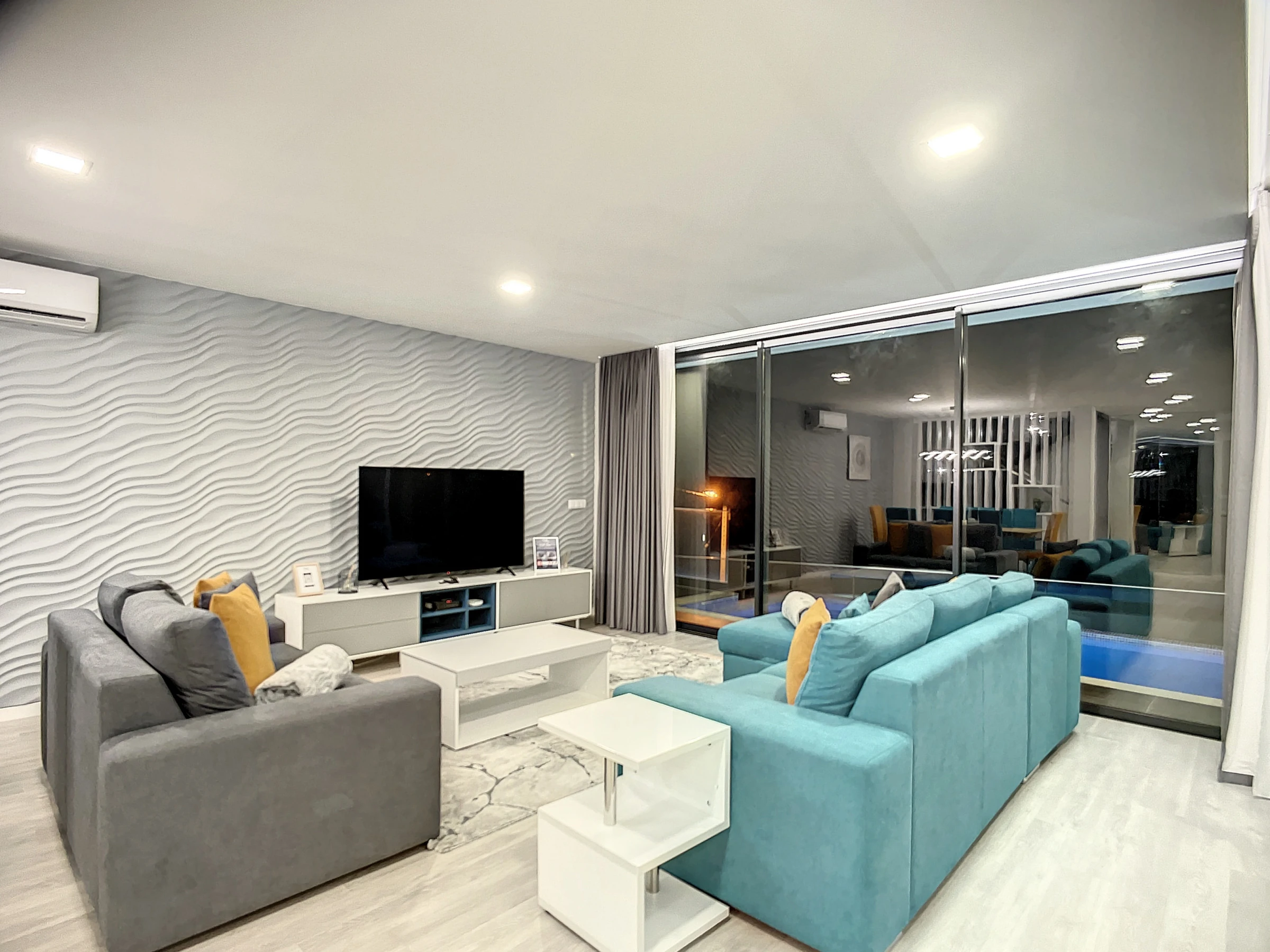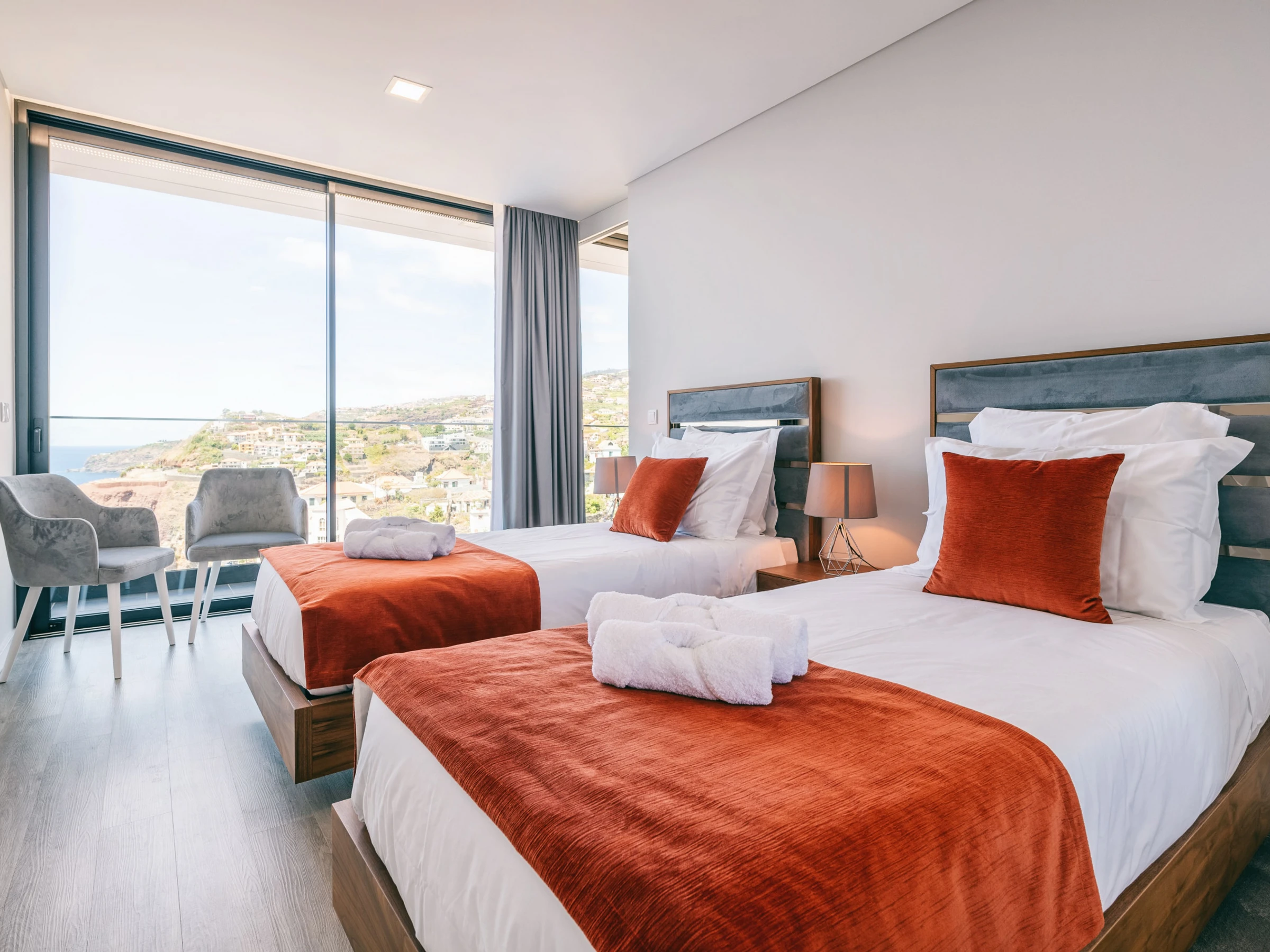 La villa peut accueillir jusqu'à 10 invités répartis dans quatre chambres. Trois chambres sont meublées avec des lits king-size, tandis que la quatrième chambre propose deux lits simples et un canapé-lit double dans l'espace commun, offrant des dispositions de couchage flexibles. Les quatre salles de bains sont équipées de douches, garantissant le confort des grands groupes.