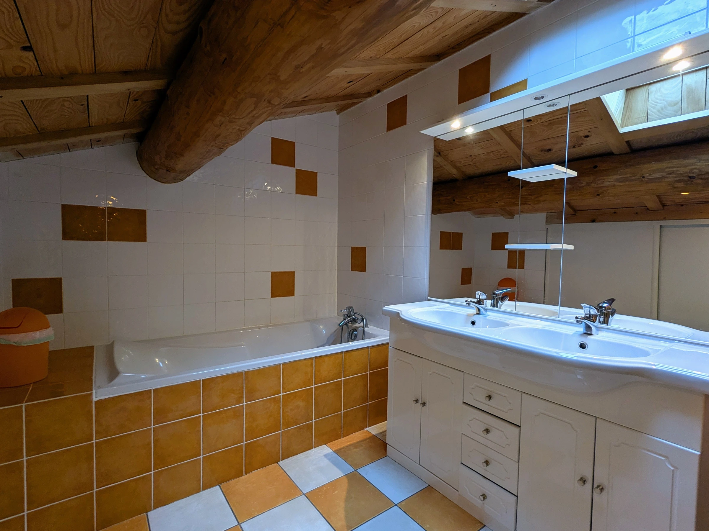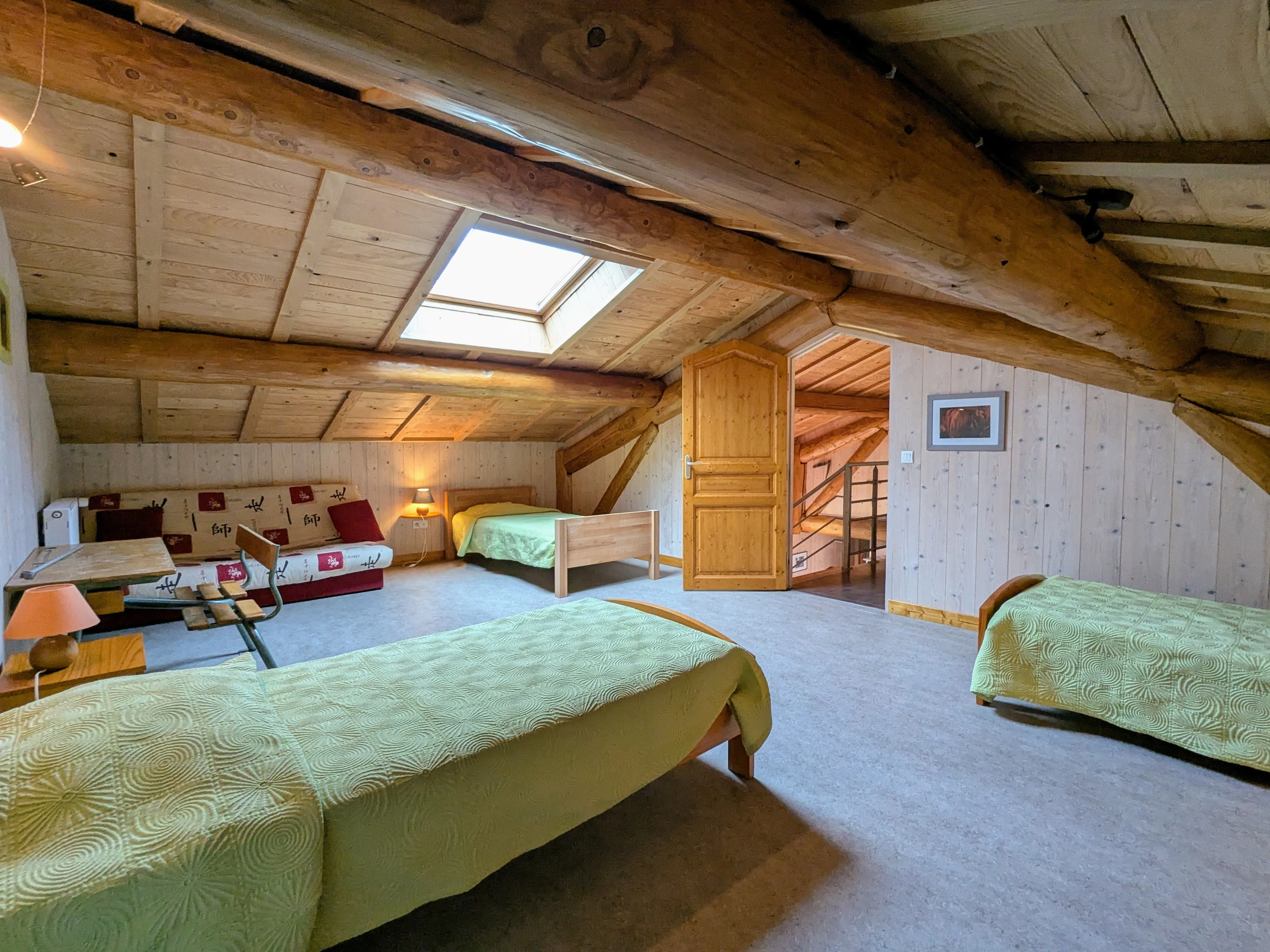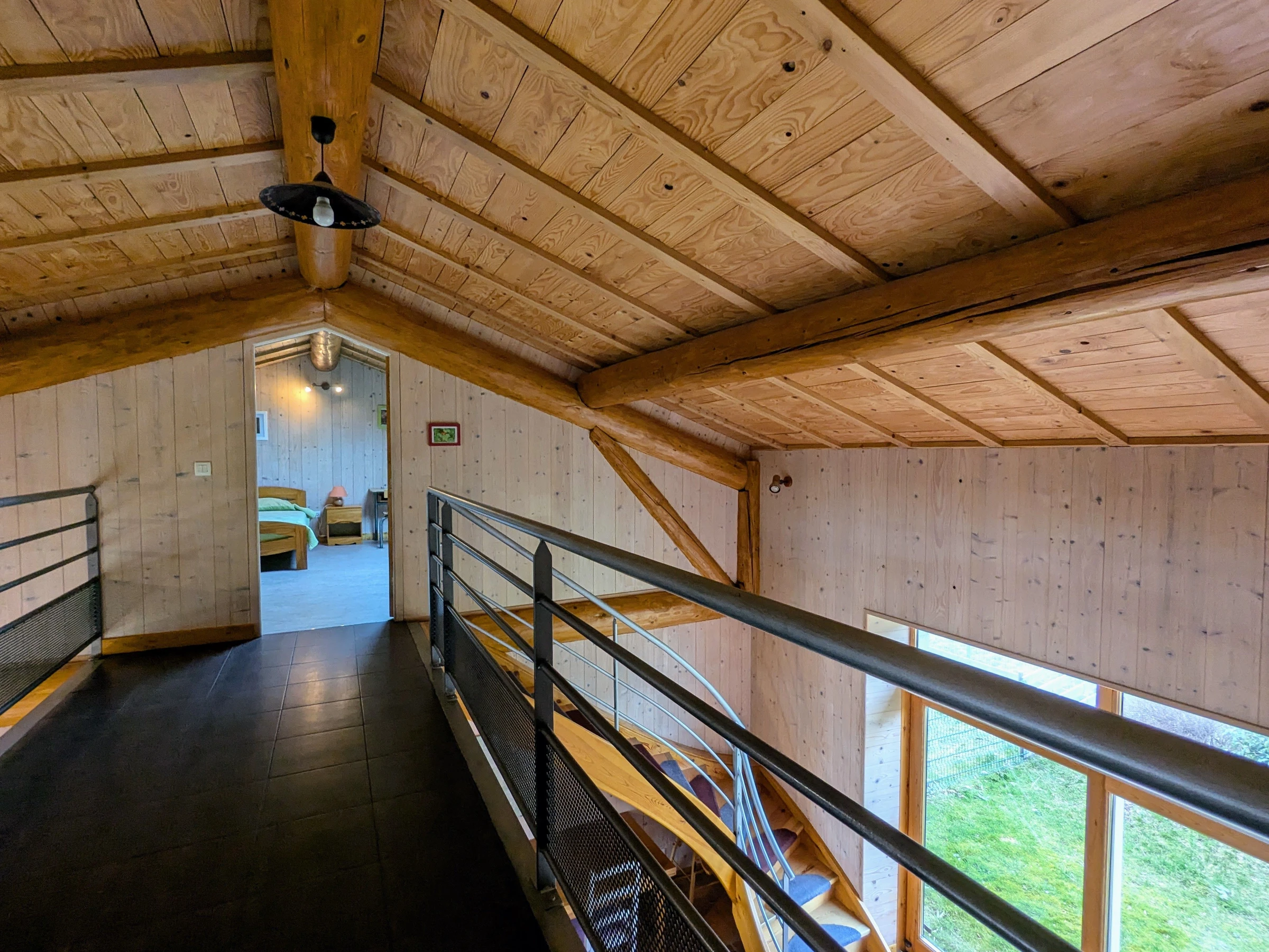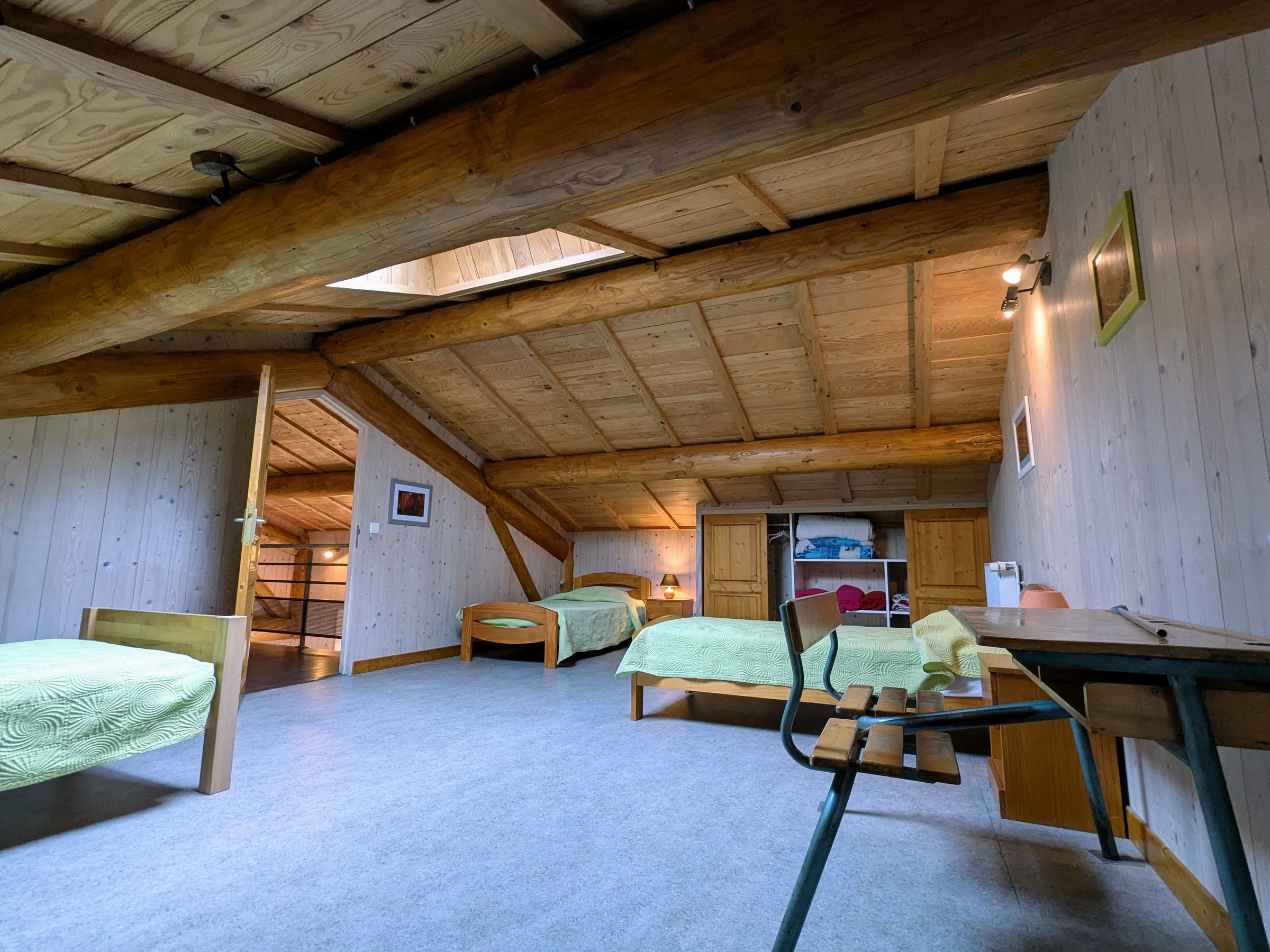 Prenant ce grand escalier, vous arrivez sur une passerelle desservant une chambre mansardée (3 lits 90) et une autre chambre mansardée (1 lit 140), une salle de bain avec baignoire et un WC indépendant.