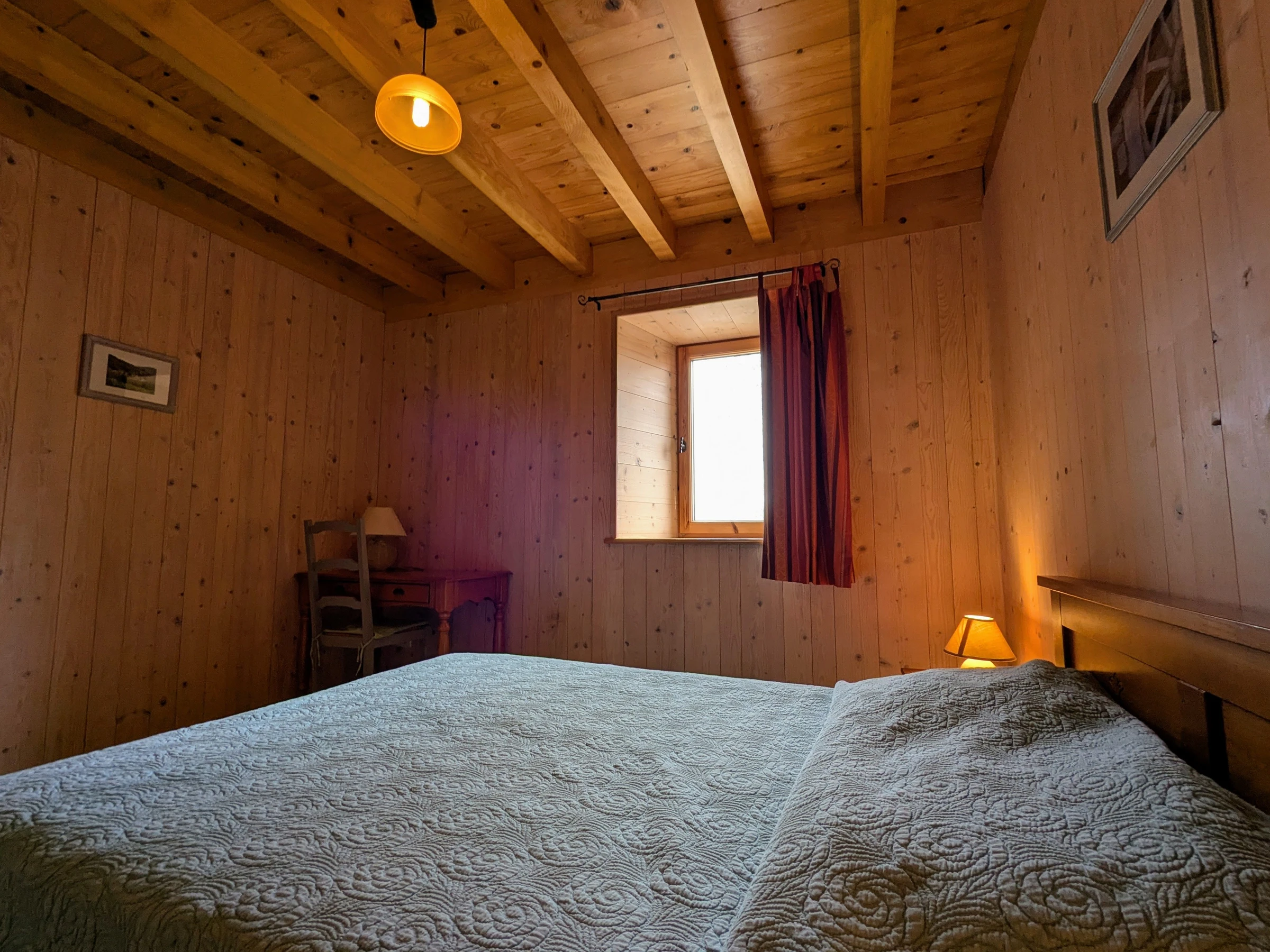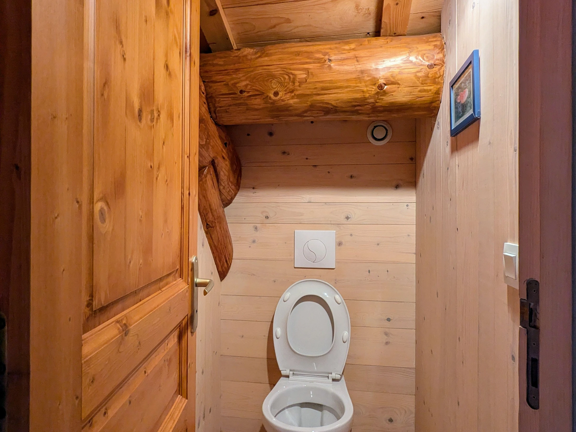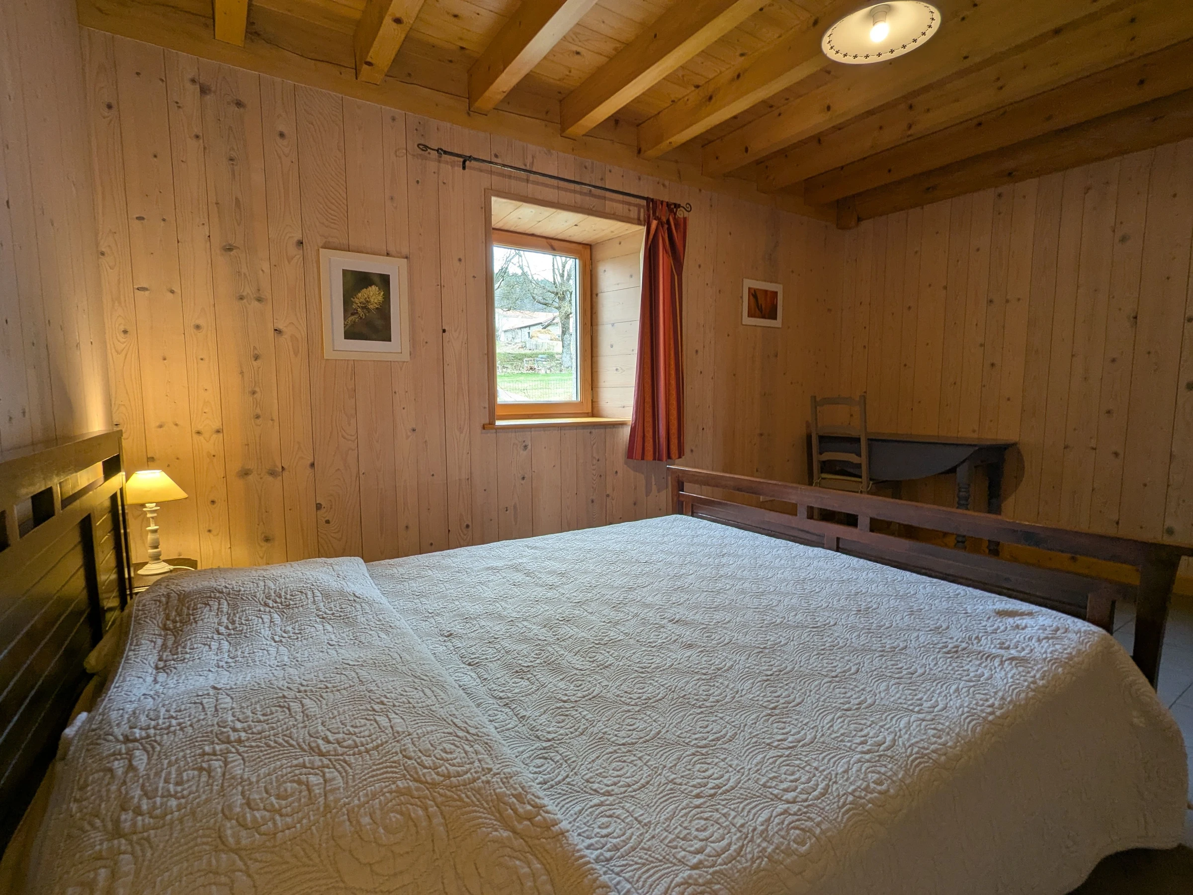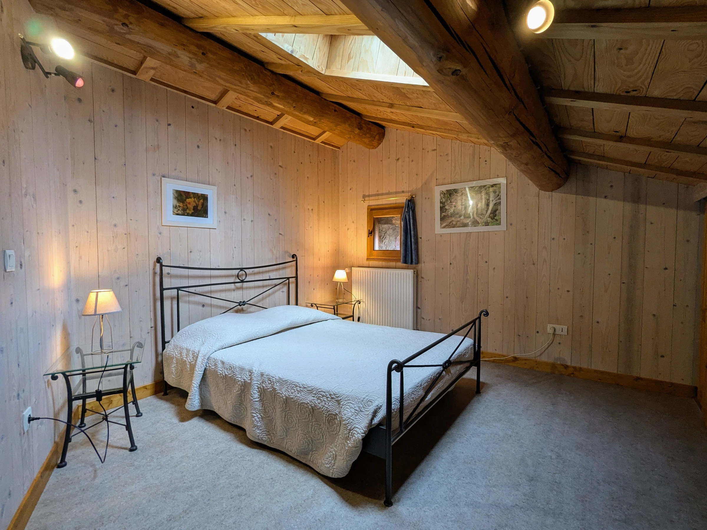 Prenant ce grand escalier, vous arrivez sur une passerelle desservant une chambre mansardée (3 lits 90) et une autre chambre mansardée (1 lit 140), une salle de bain avec baignoire et un WC indépendant.