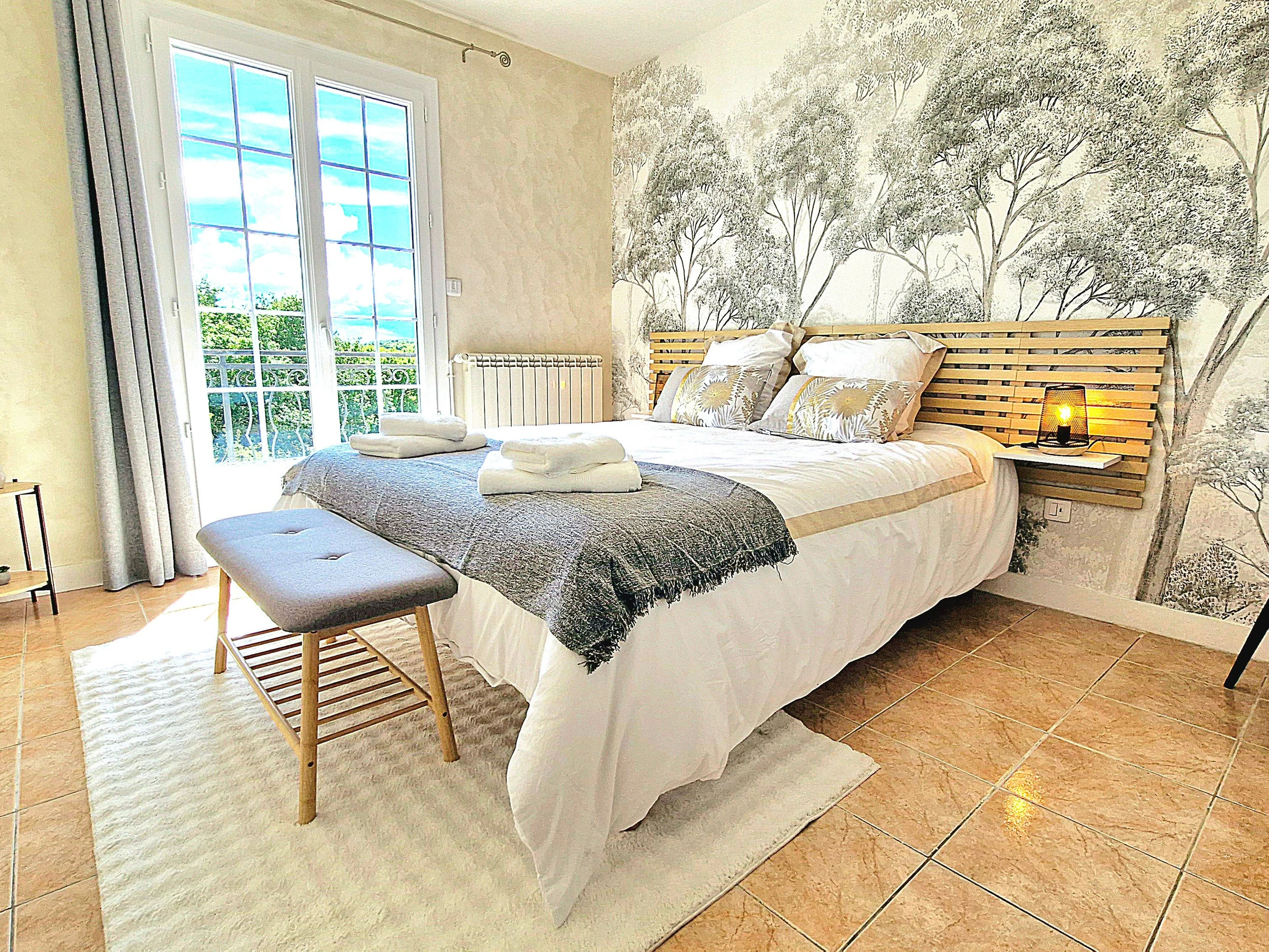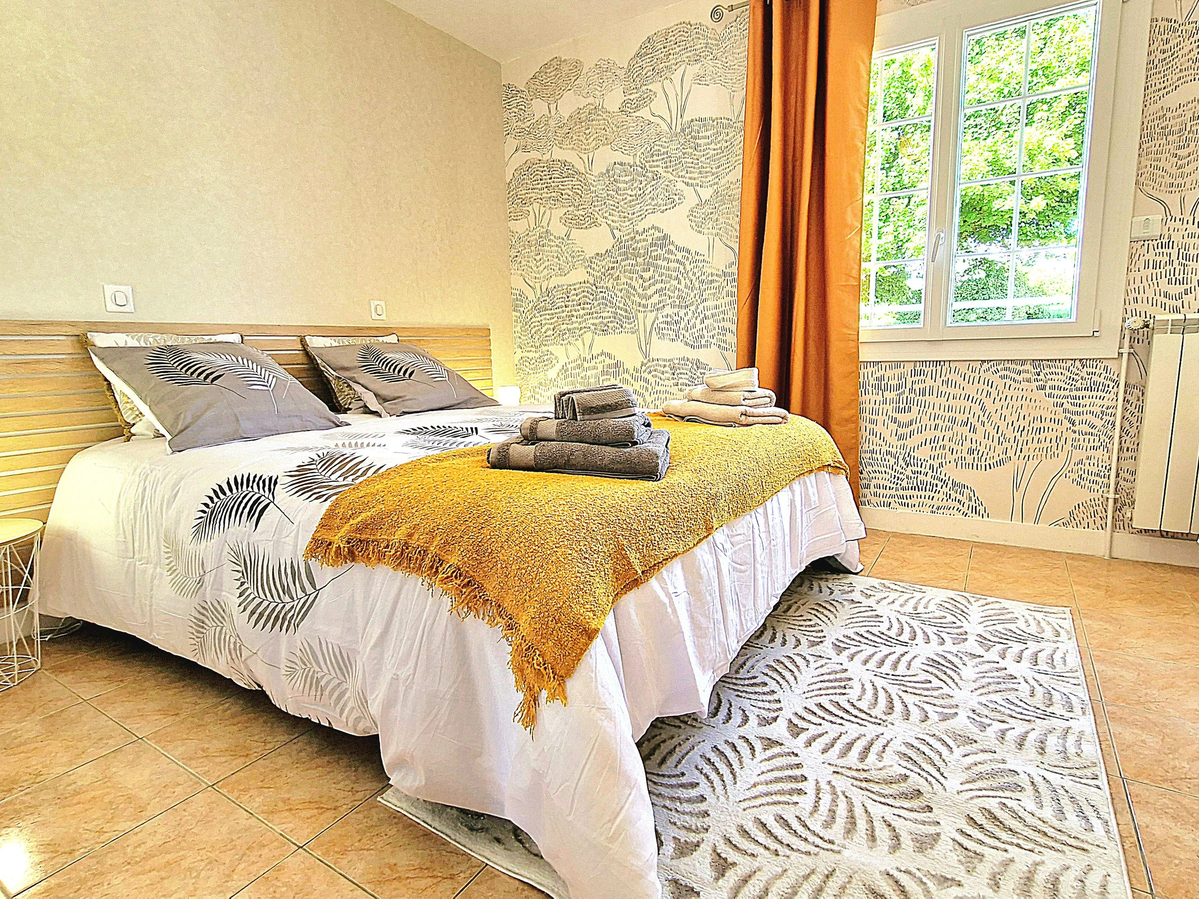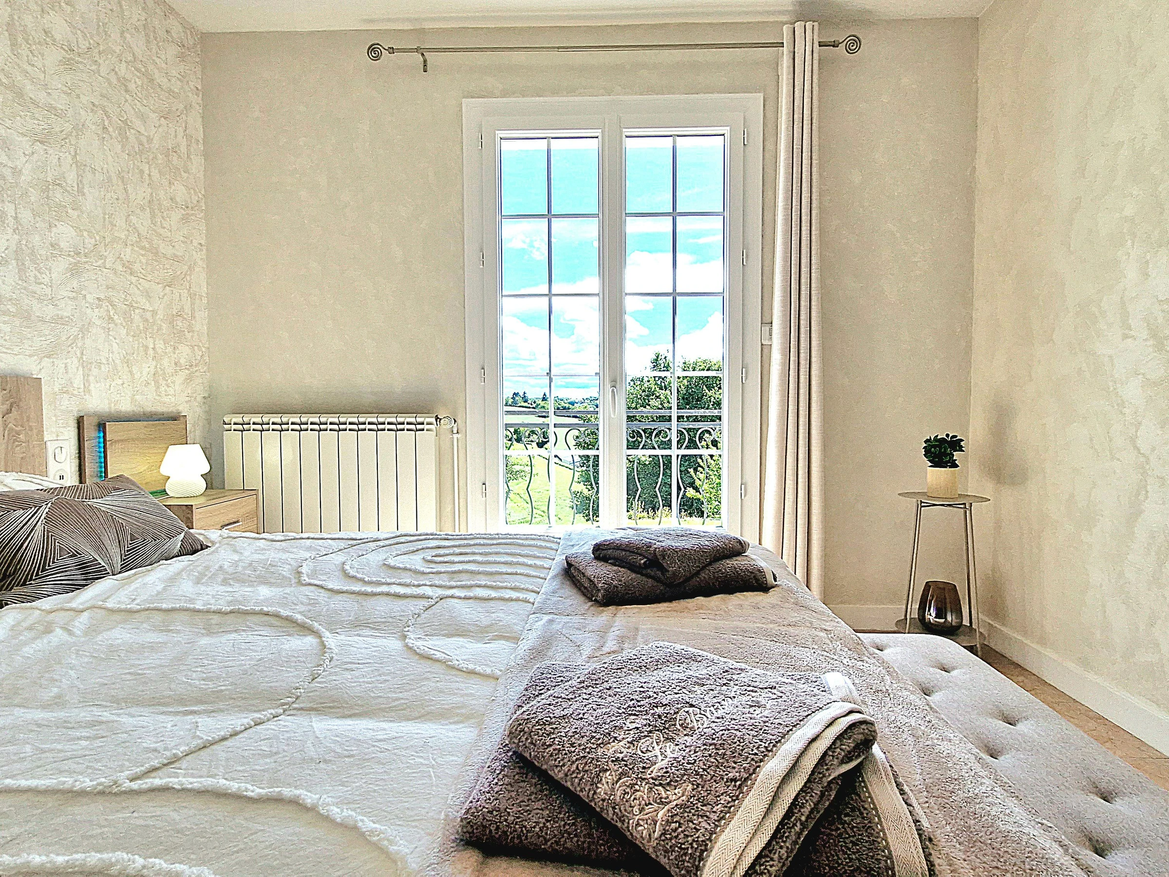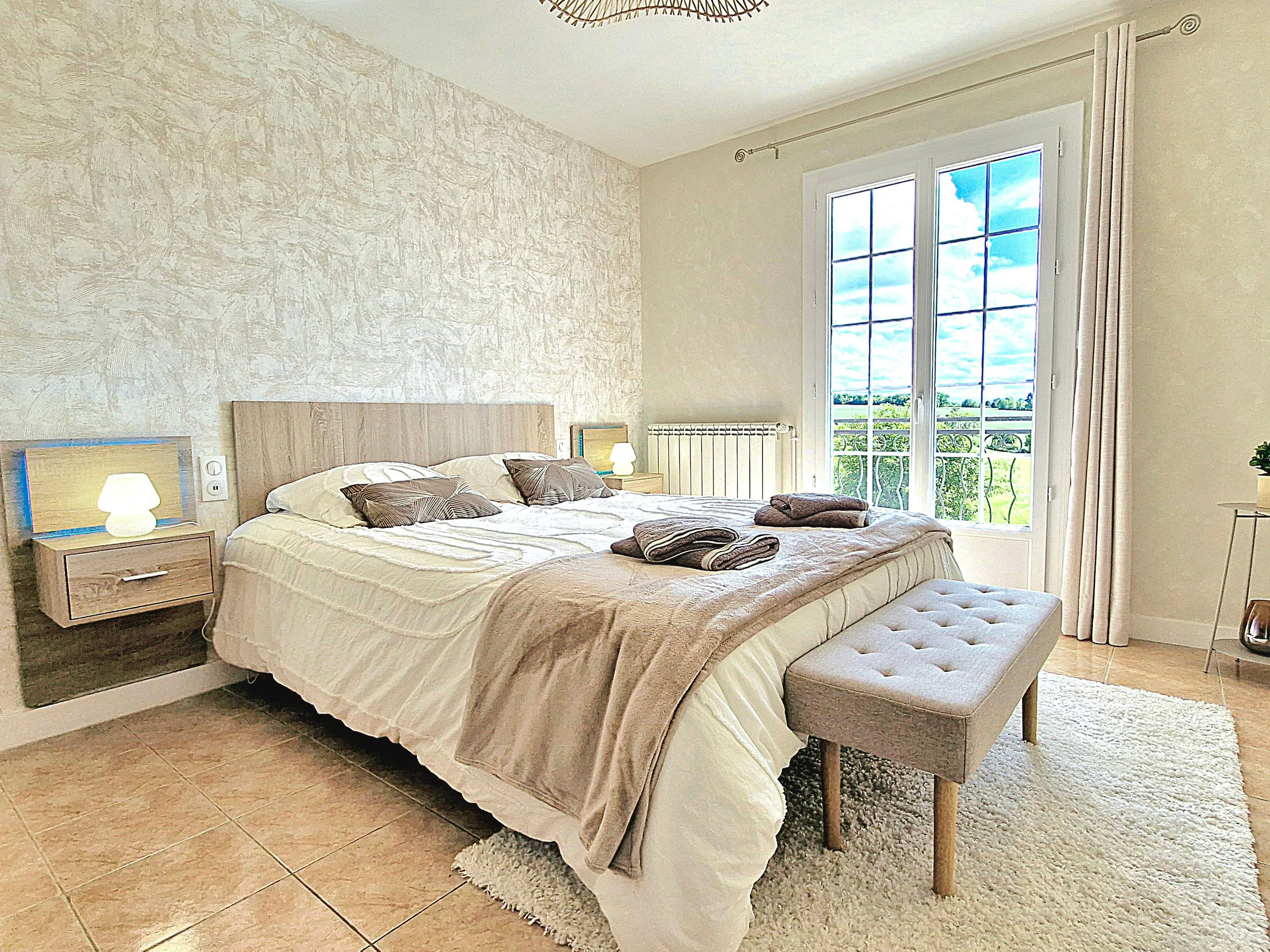 Venez séjourner au calme dans une maison individuelle entièrement climatisée, rénovée et joliment décorée bénéficiant d’une très belle vue dégagée sur la campagne. Garage et parking privé, grande terrasse avec salon de jardin, barbecue, spa (été) et jardin non clos. Grande pièce à vivre très lumineuse avec cuisine intégrée et équipée ouverte, espace salle à manger et salon avec télé et canapé convertible (possibilité couchage 1 personne 20€/nuit) avec accès direct à la terrasse. Espace nuit composé de 3 chambres (2 avec 1 lit 160x200 et 1 avec 2 lits 80x200 jumelables), 1 wc indépendant avec lave-mains et salle d’eau (douche grande dimension) avec double vasque. Formule tout compris : linge de lit avec lits faits à l’arrivée, linge de toilette, linge de cuisine, chauffage, électricité et ménage fin de séjour inclus