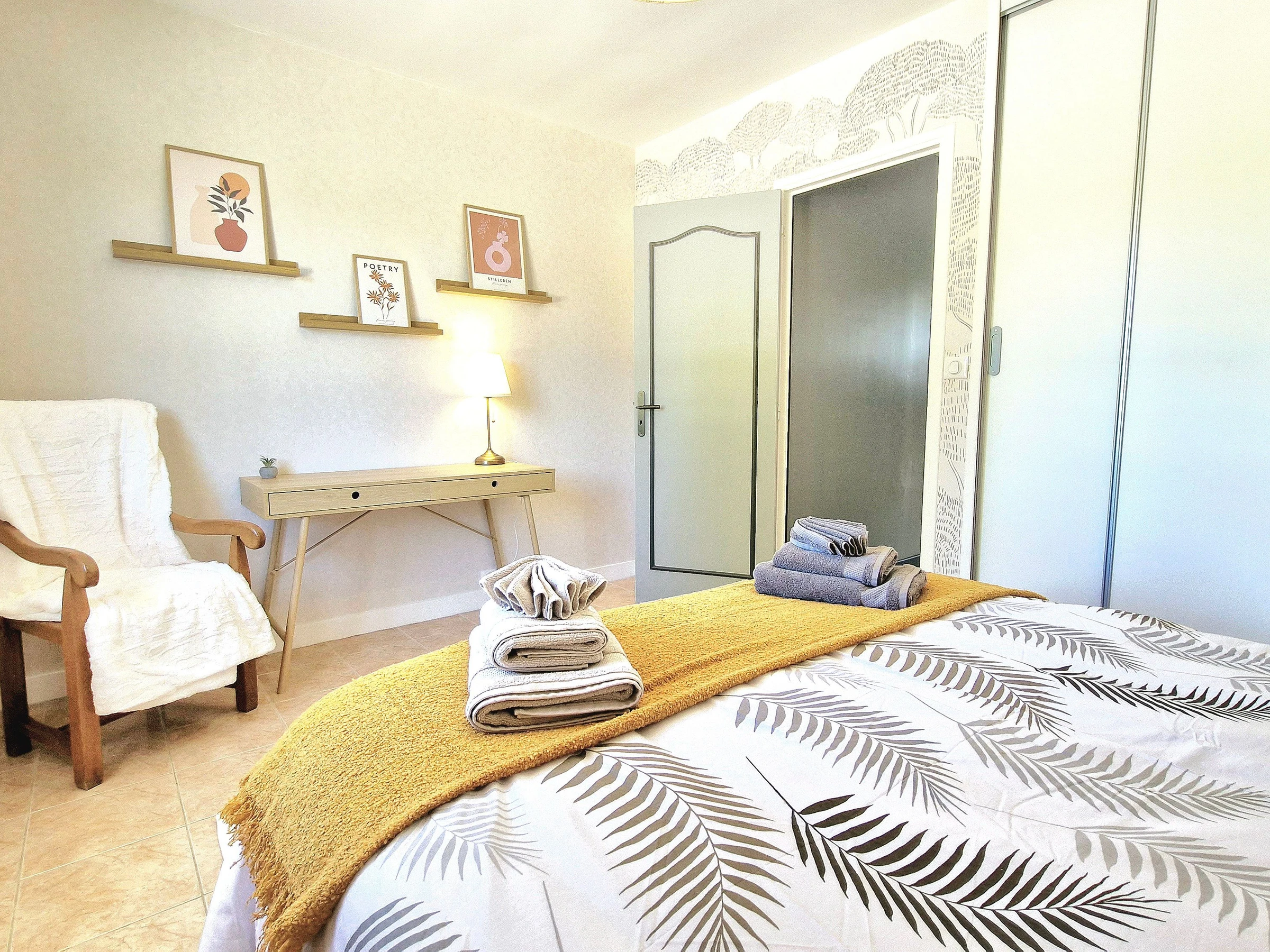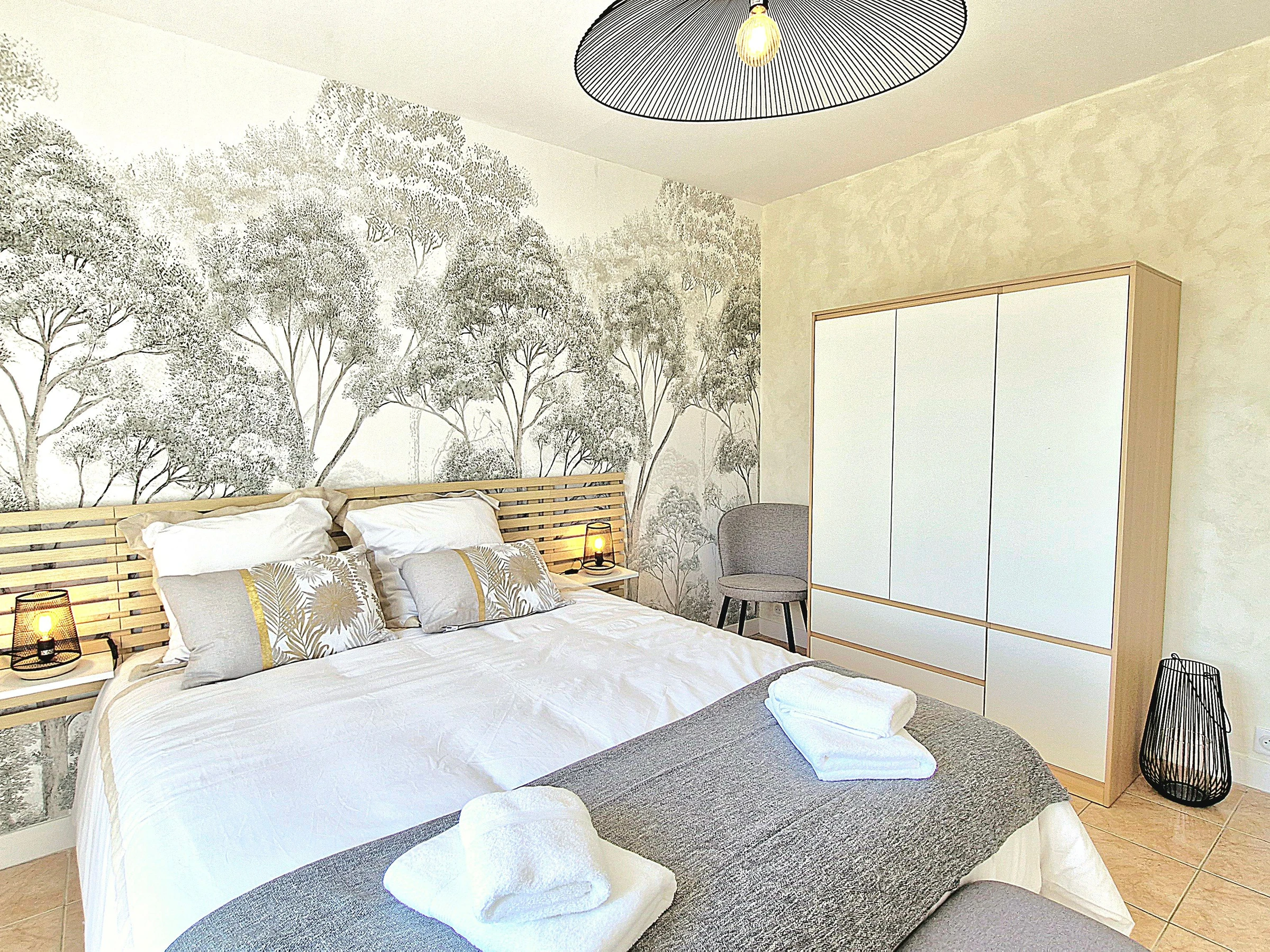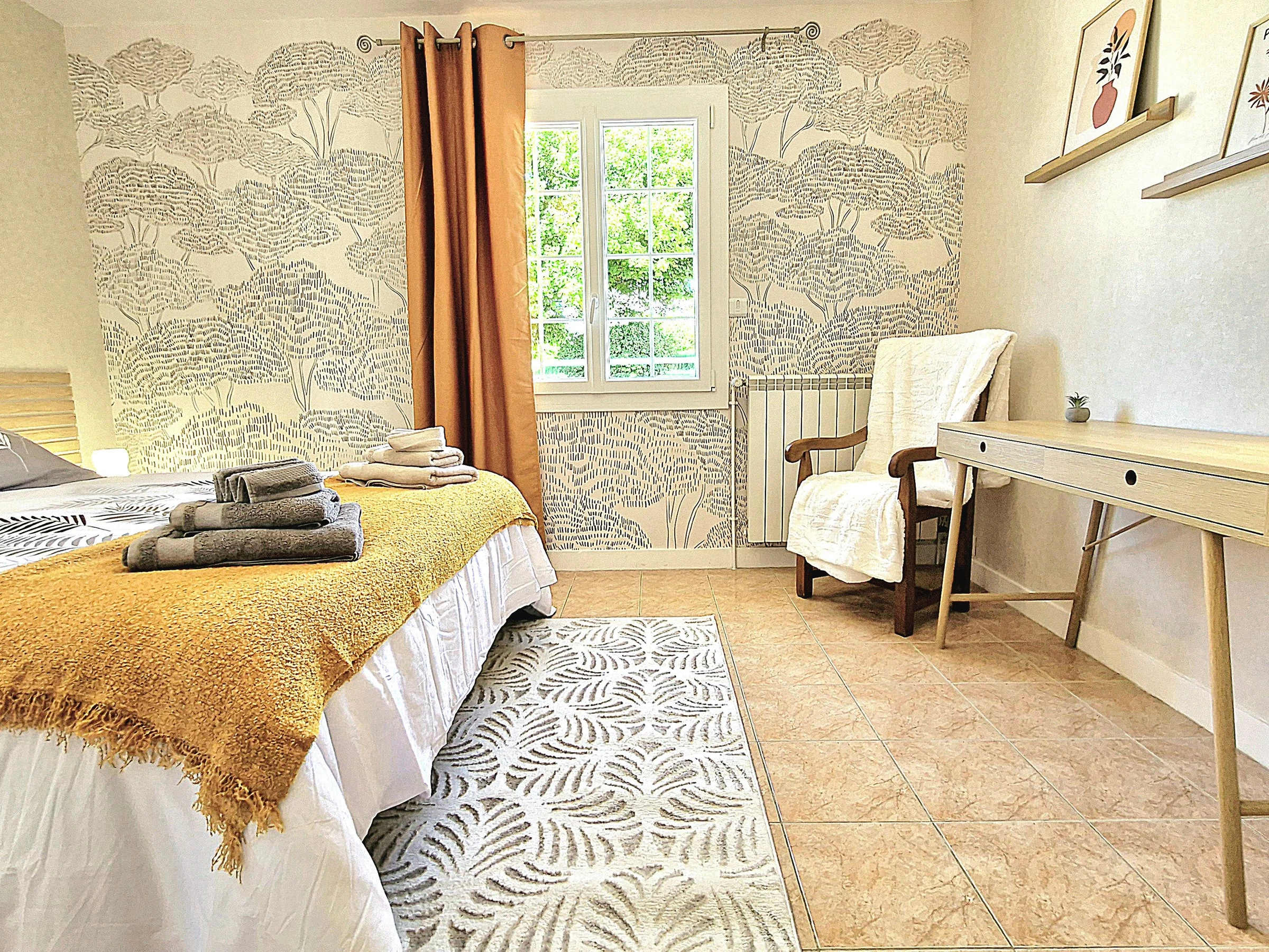 Venez séjourner au calme dans une maison individuelle entièrement climatisée, rénovée et joliment décorée bénéficiant d’une très belle vue dégagée sur la campagne. Garage et parking privé, grande terrasse avec salon de jardin, barbecue, spa (été) et jardin non clos. Grande pièce à vivre très lumineuse avec cuisine intégrée et équipée ouverte, espace salle à manger et salon avec télé et canapé convertible (possibilité couchage 1 personne 20€/nuit) avec accès direct à la terrasse. Espace nuit composé de 3 chambres (2 avec 1 lit 160x200 et 1 avec 2 lits 80x200 jumelables), 1 wc indépendant avec lave-mains et salle d’eau (douche grande dimension) avec double vasque. Formule tout compris : linge de lit avec lits faits à l’arrivée, linge de toilette, linge de cuisine, chauffage, électricité et ménage fin de séjour inclus