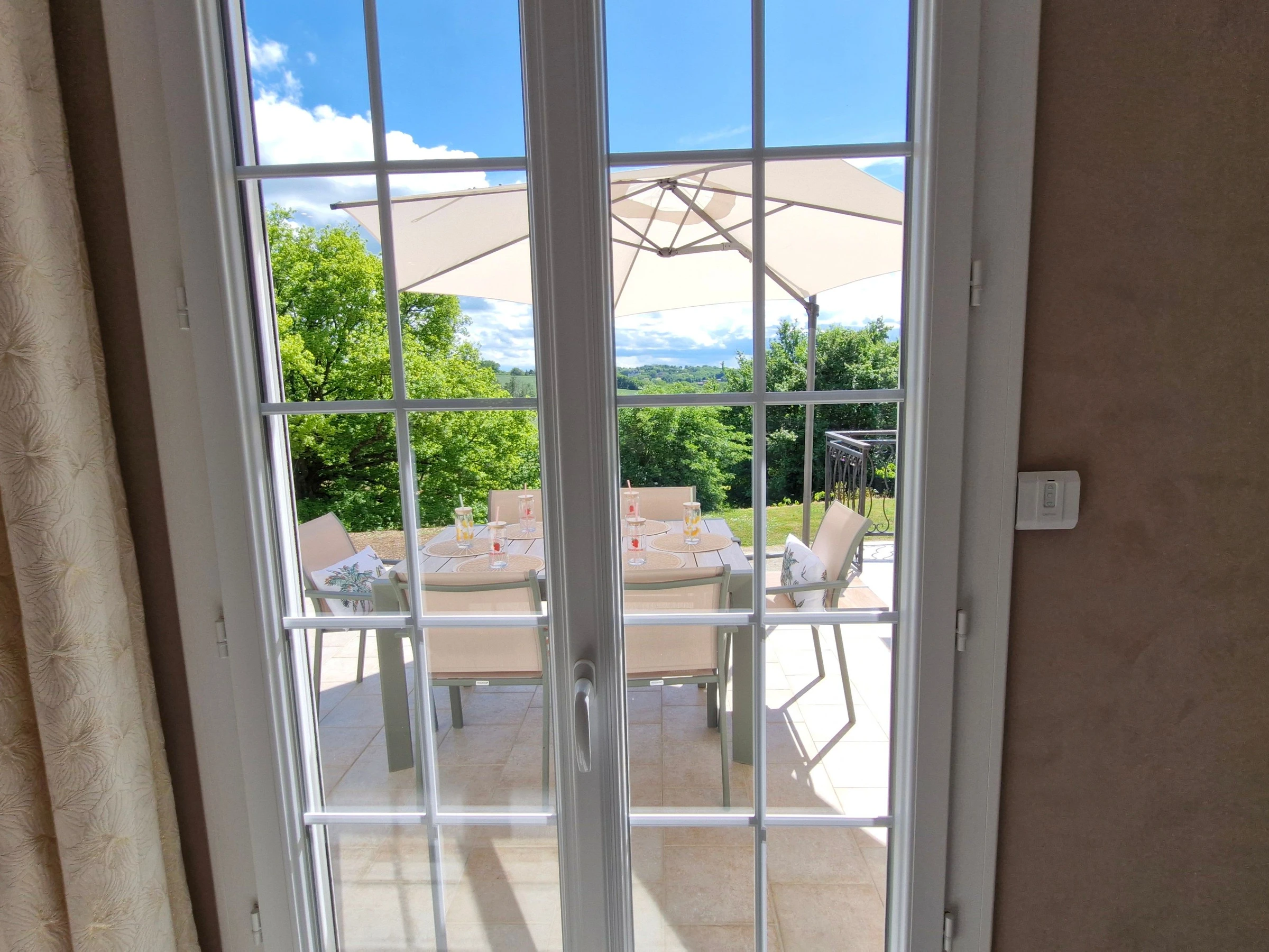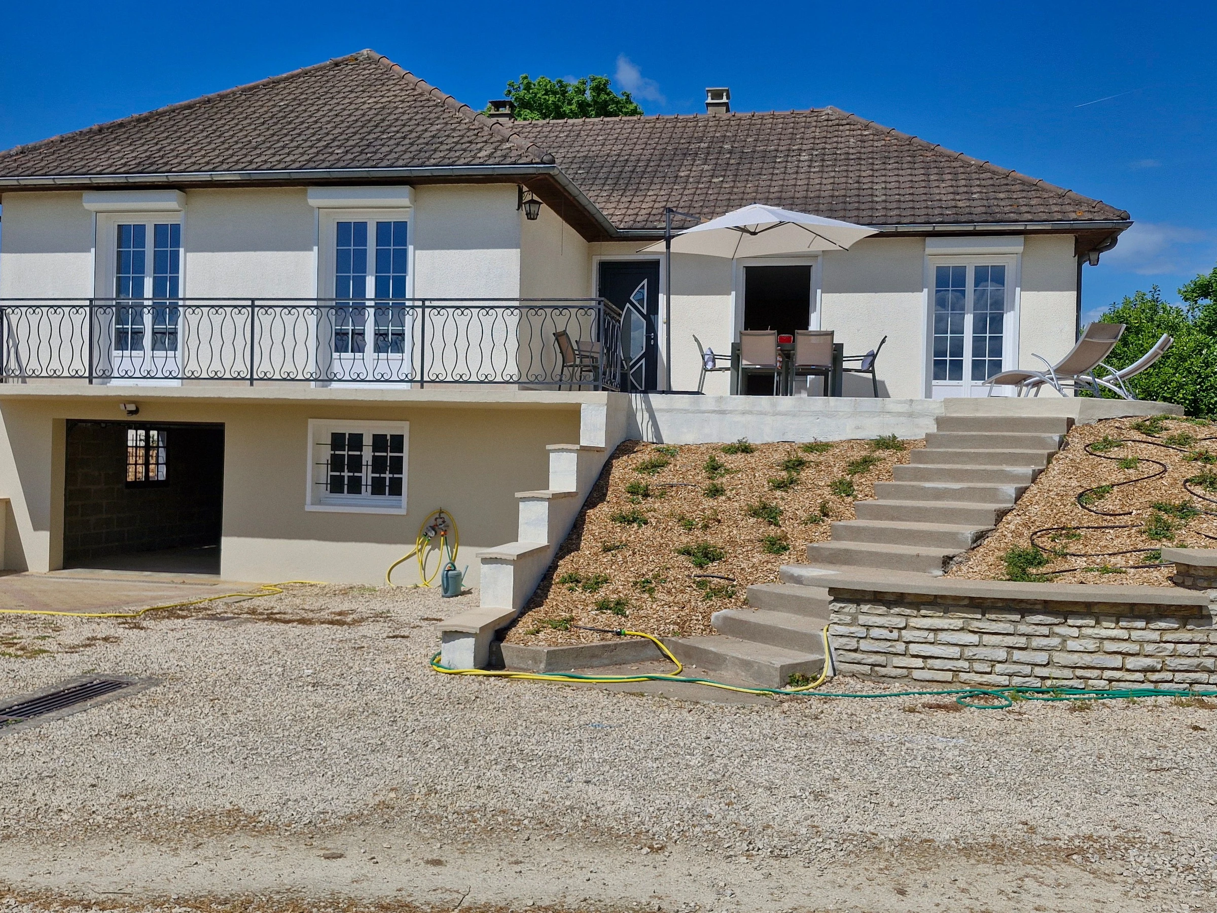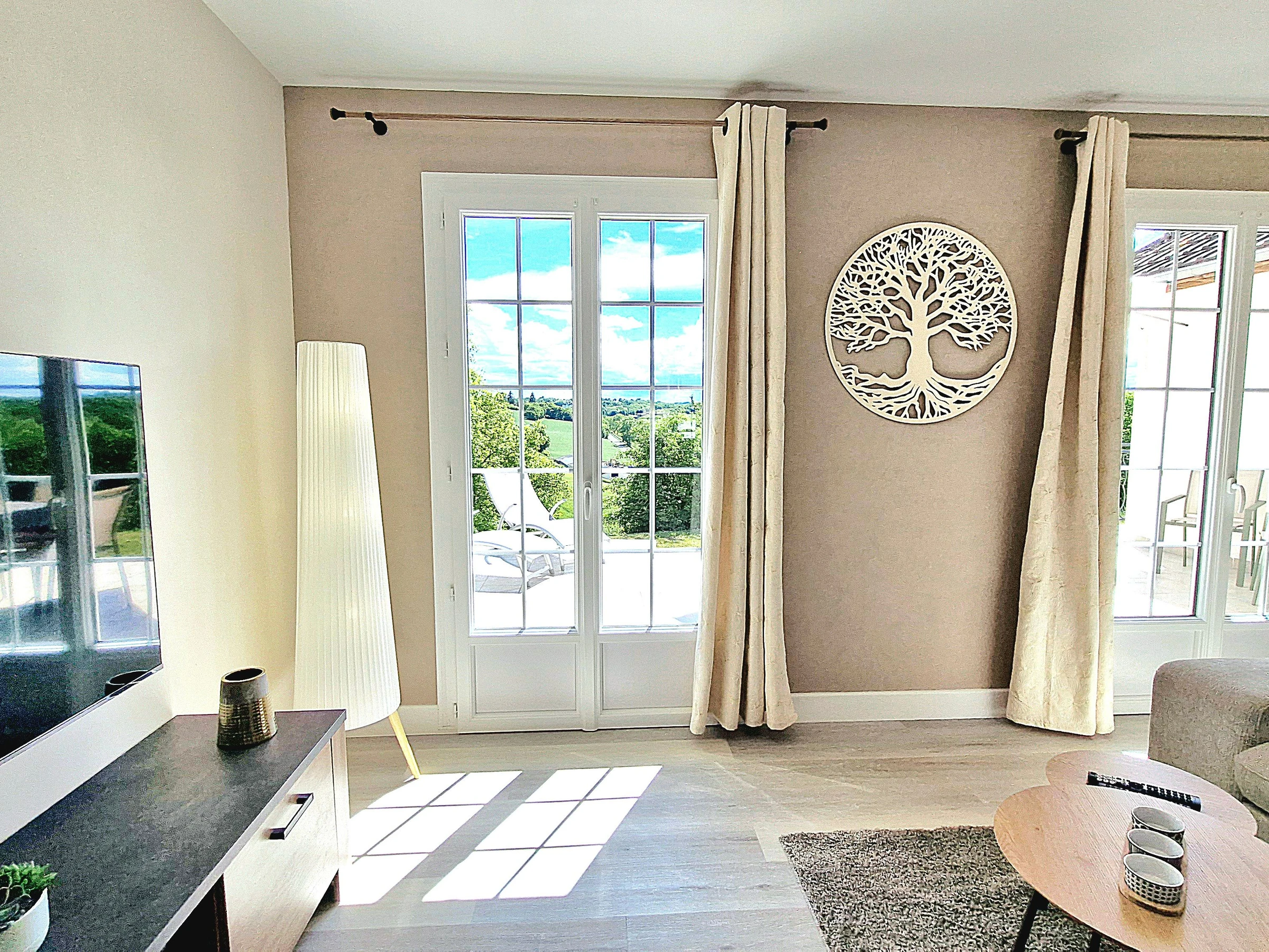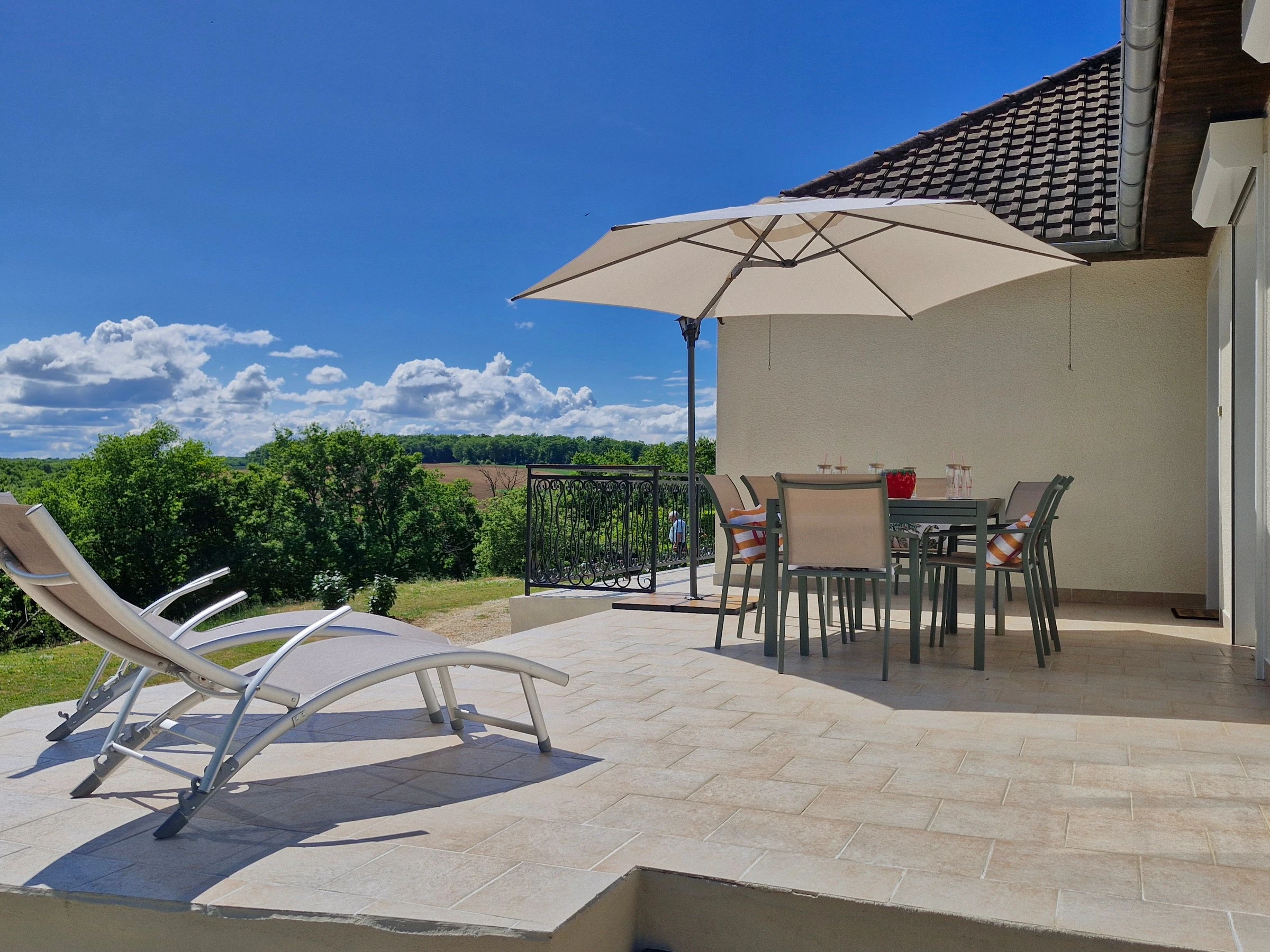 Venez séjourner au calme dans une maison individuelle entièrement climatisée, rénovée et joliment décorée bénéficiant d’une très belle vue dégagée sur la campagne. Garage et parking privé, grande terrasse avec salon de jardin, barbecue, spa (été) et jardin non clos. Grande pièce à vivre très lumineuse avec cuisine intégrée et équipée ouverte, espace salle à manger et salon avec télé et canapé convertible (possibilité couchage 1 personne 20€/nuit) avec accès direct à la terrasse. Espace nuit composé de 3 chambres (2 avec 1 lit 160x200 et 1 avec 2 lits 80x200 jumelables), 1 wc indépendant avec lave-mains et salle d’eau (douche grande dimension) avec double vasque. Formule tout compris : linge de lit avec lits faits à l’arrivée, linge de toilette, linge de cuisine, chauffage, électricité et ménage fin de séjour inclus