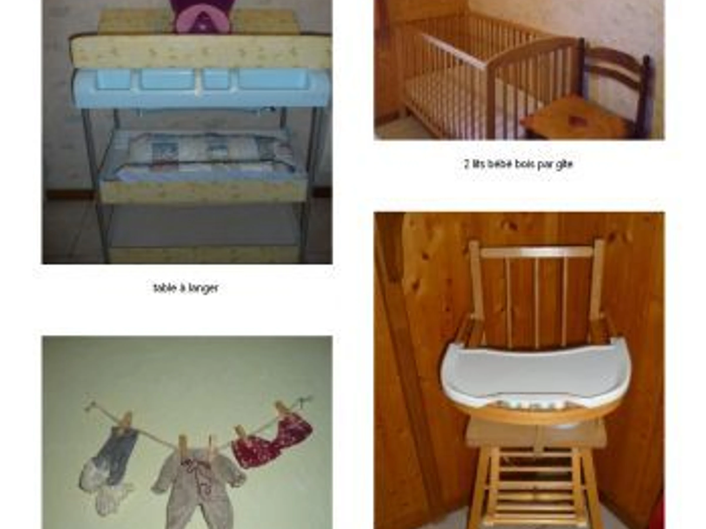 Pour bébé : 2 lits, chaise, baignoire et table à langer.