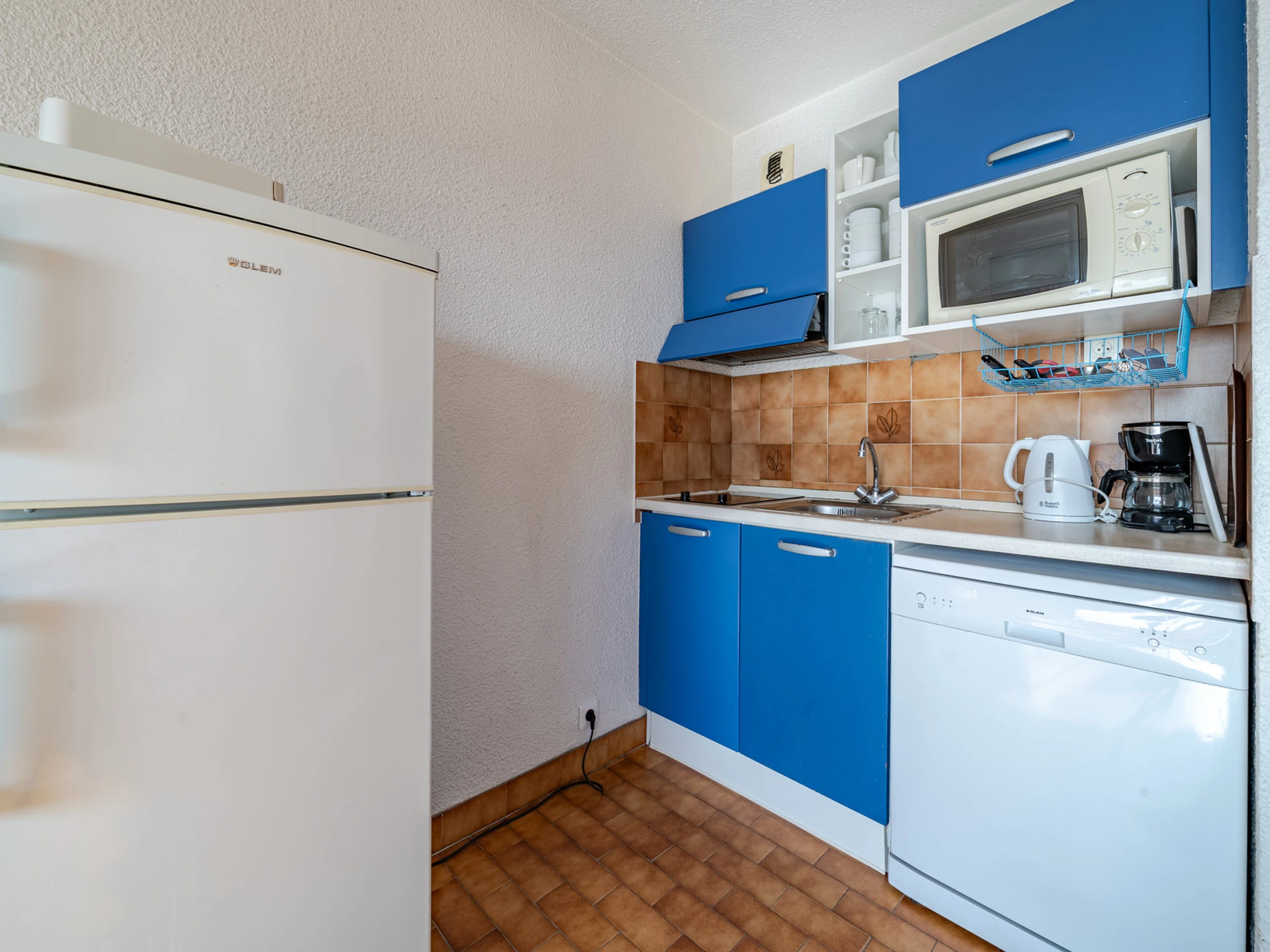 Kitchenette équipée : lave-vaisselle, micro-ondes, réfrigérateur-congélateur, grille-pain, bouilloire, cafetière-filtre.
