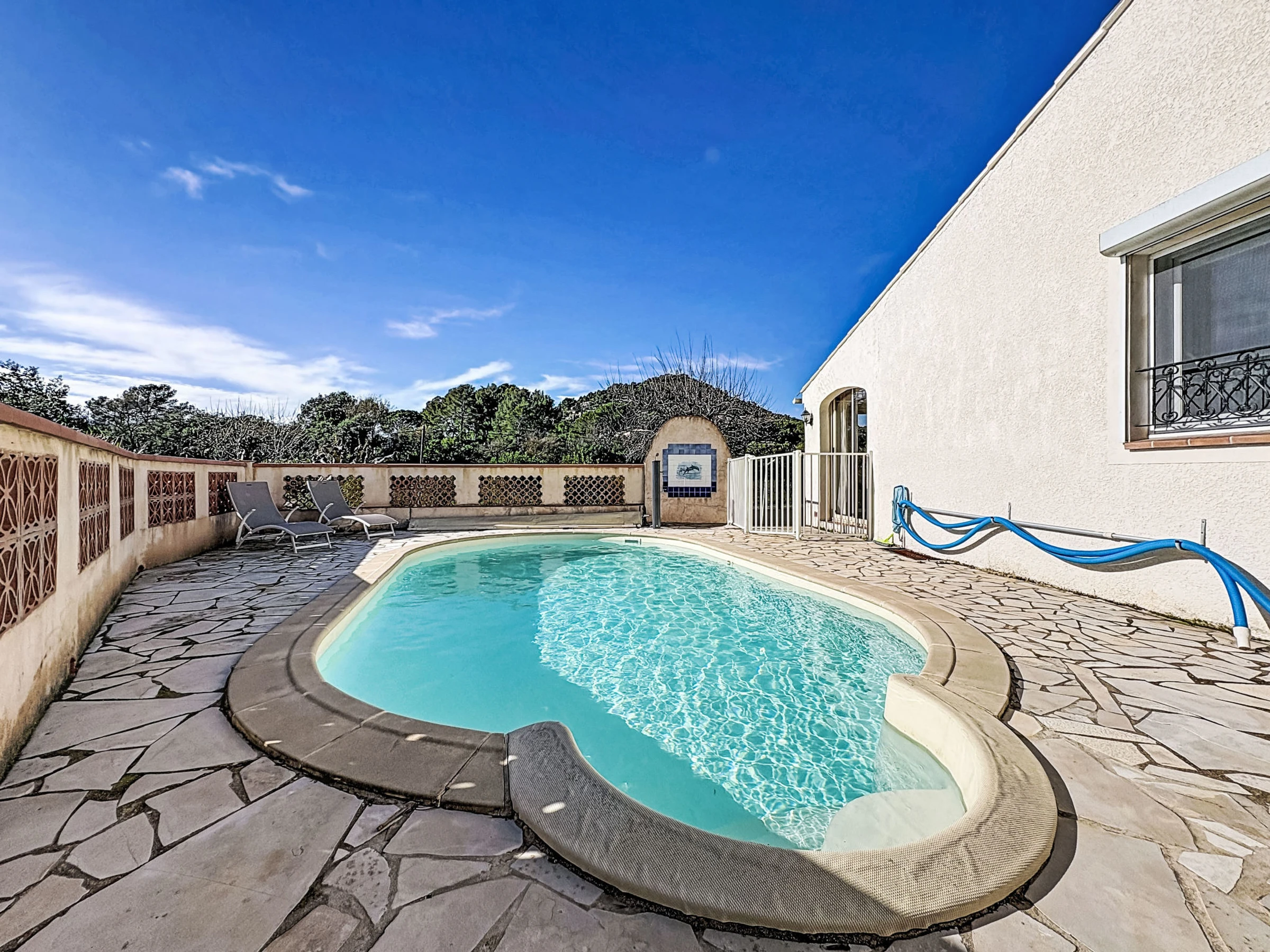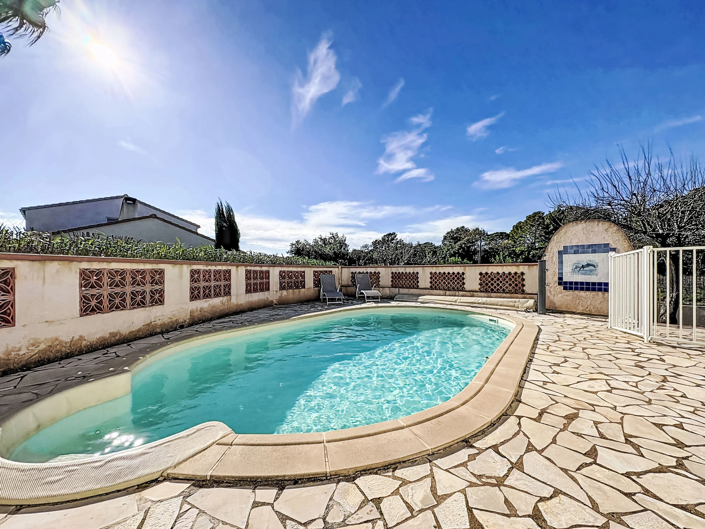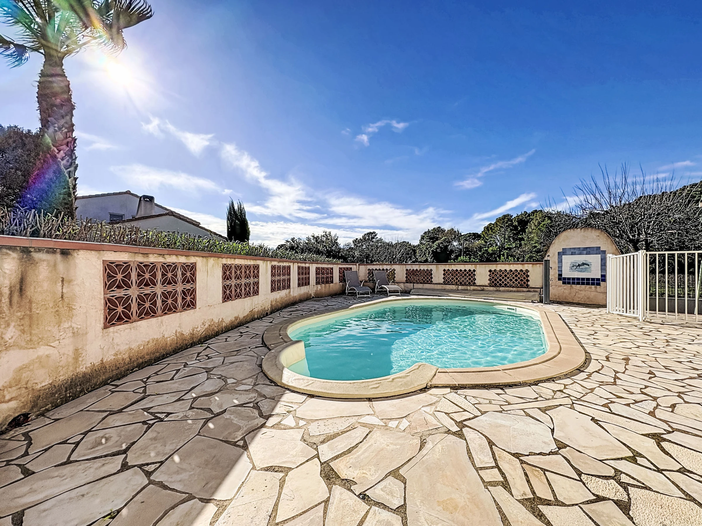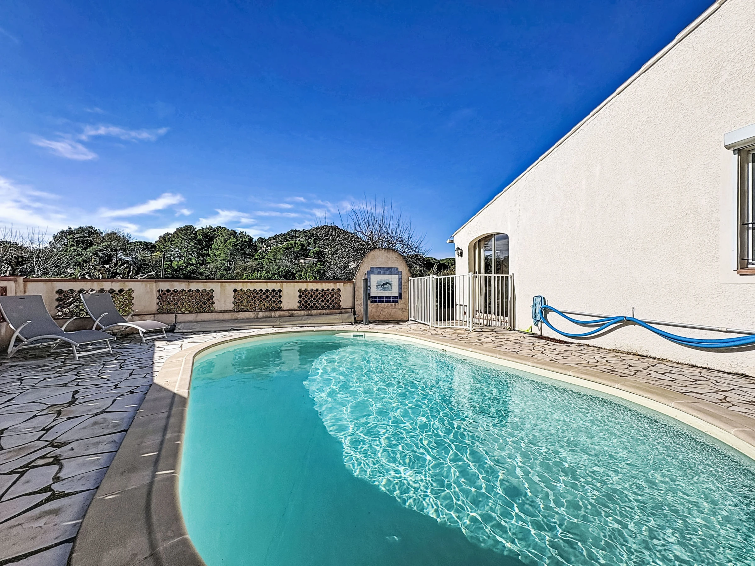 Maison individuelle "Le Racine", année de construction 1970. Dans le quartier de la Bouverie, à 500 m du centre, à 20 km de la mer, dans une impasse. A usage privé: terrain (clôturé), piscine ronde (10 x 4 m, profondeur 130 - 190 cm, disponibilité saisonnière: [hidden] - [hidden] Douche extérieure, barbecue, place de parking. Magasin d'alimentation, boulangerie, café 500 m, arrêt de bus "Coeur de la Bouverrie" 500 m, gare ferroviaire "Fréjus" 20 km, plage de sable "Plage de Saint Aygulf" 19 km plage de graviers "Calanques des Louvans" 18 km, centre de plongée 27 km, centre thermal "Thalasso de Port Fréjus" 21 km. Port plaisance 15 km, terrain de golf (18 trous) 13 km, ecole de voile 22 km, centre équestre 2 km. Attractions à proximité: Aqualand, Lunapark 17 km, Fréjus 20 km, St Raphael 22 km, Saint Tropez 45 km. Les domaines skiables de renommée sont facilement accessibles: Auron, Isola [hidden] km. Les lacs connus sont facilement accessibles: Lac de St Cassien 50 km, Lac du Du Verdon 90 km. Région de randonnées: Estérel 35 km.