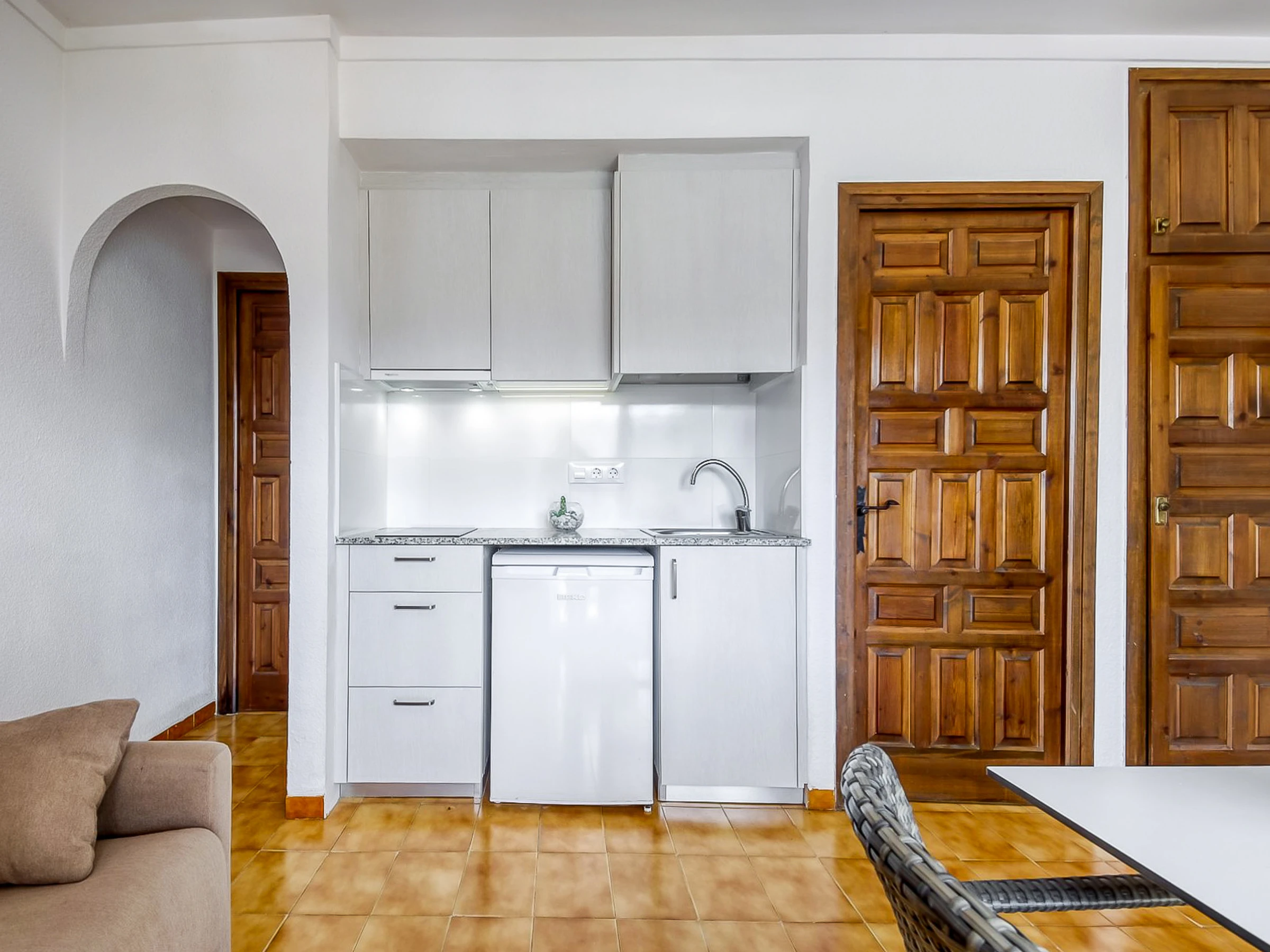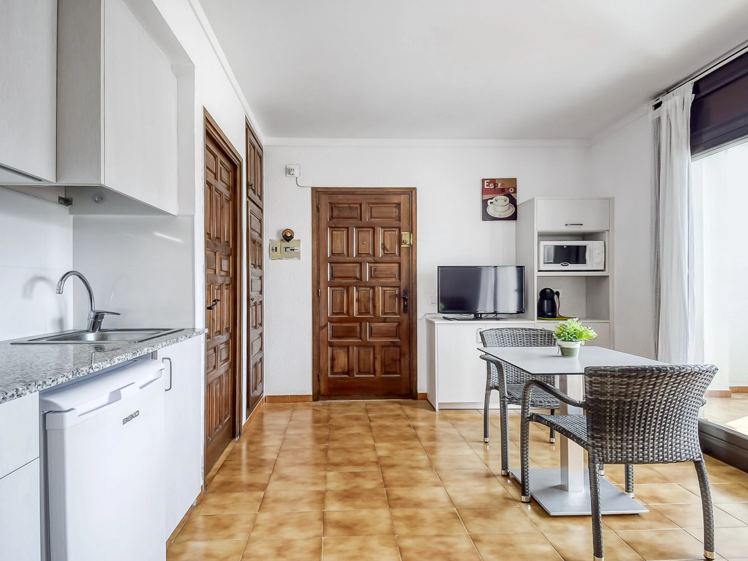 À l'intérieur, l'appartement dispose d'une kitchenette équipée d'appareils de base, tels qu'un réfrigérateur, un four micro-ondes et une cafetière, ainsi que d'ustensiles de cuisine et de vaisselle pour le confort des clients.