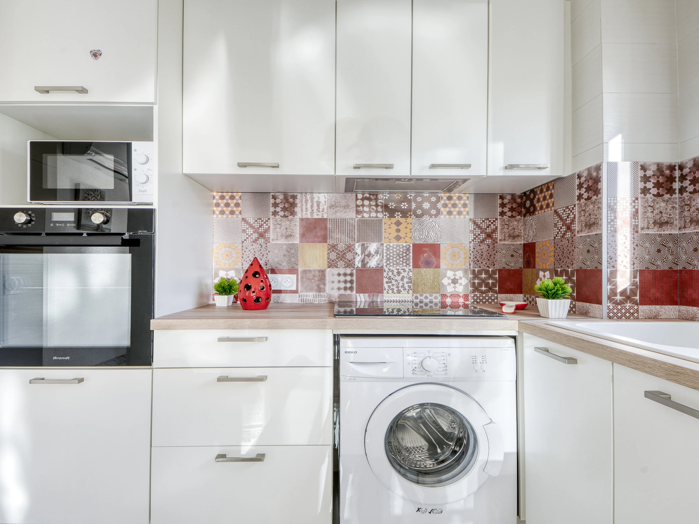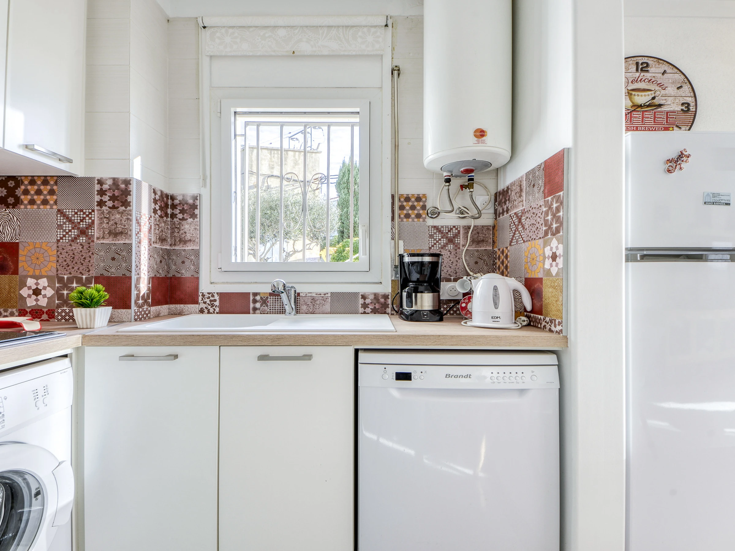 La cuisine ouverte est entièrement équipée avec tout ce dont vous avez besoin, y compris un réfrigérateur, un four micro-ondes, un four, un congélateur, un lave-linge, un lave-vaisselle, de la vaisselle, des couverts, des ustensiles de cuisine et une cafetière pour commencer chaque journée avec énergie.