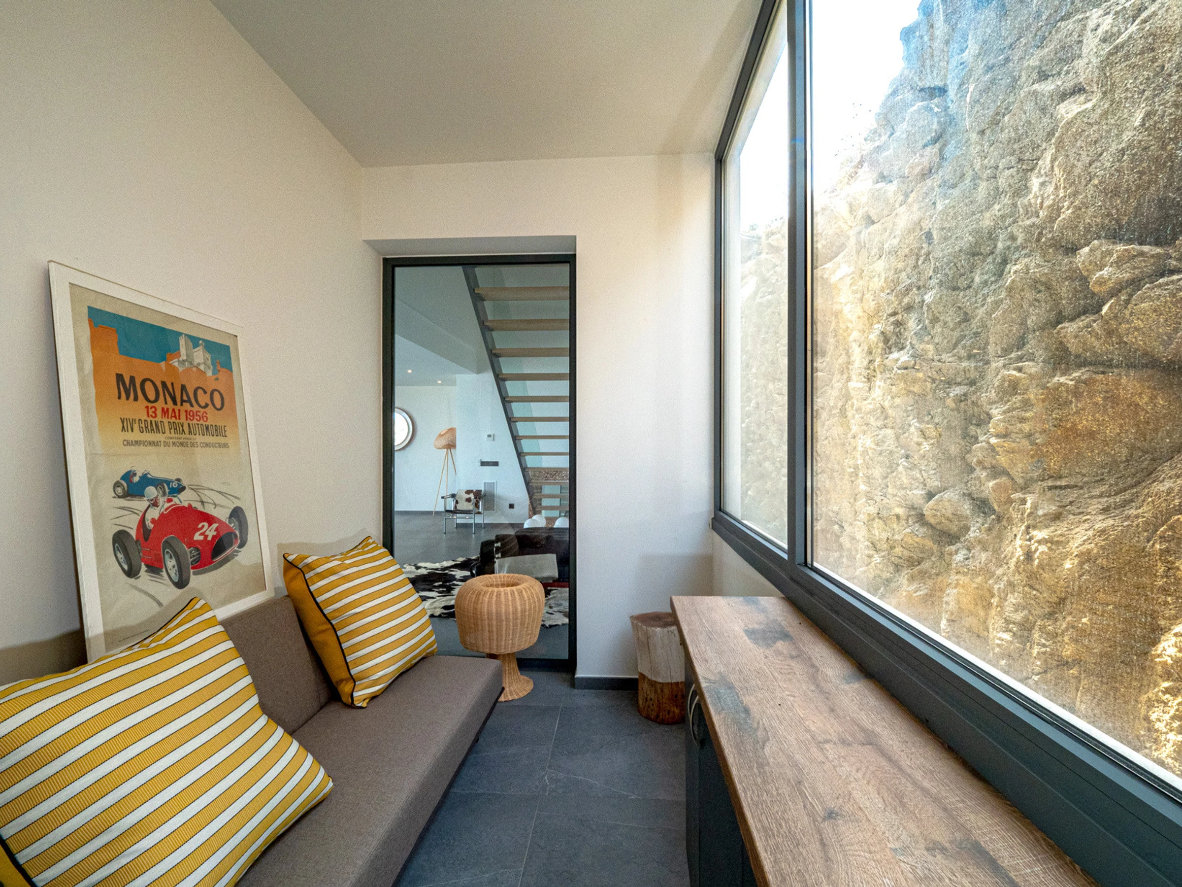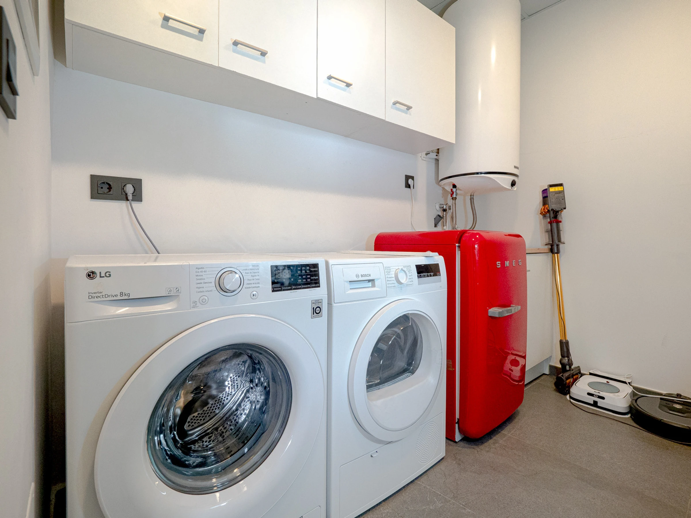 De la route, vous pouvez accéder au garage ou vous trouverez deux places de parking et l'ascenseur qui monte à l'étage principal, quand-même vous pouvez également monter les escaliers latéraux sans avoir à entrer dans le garage.