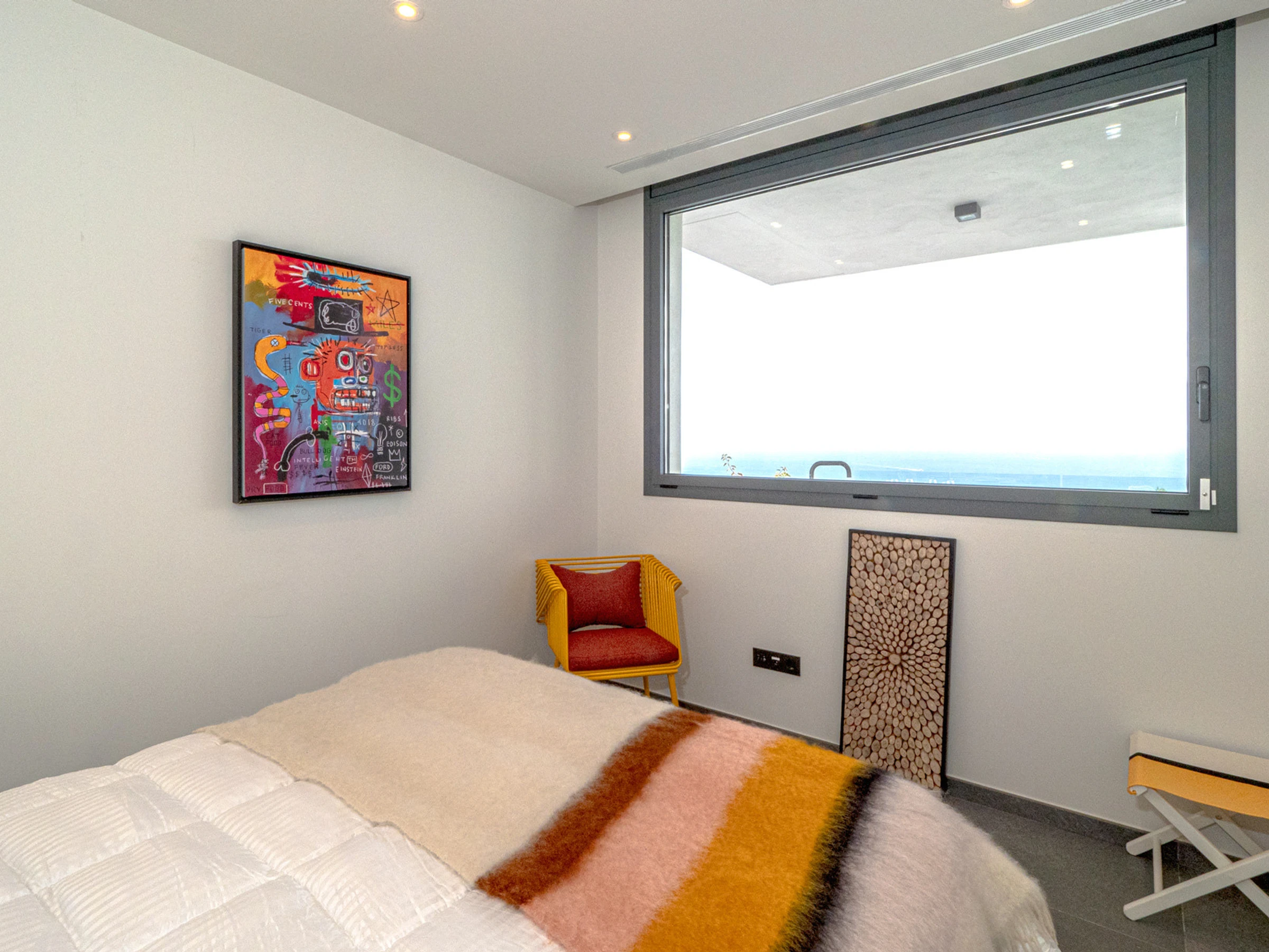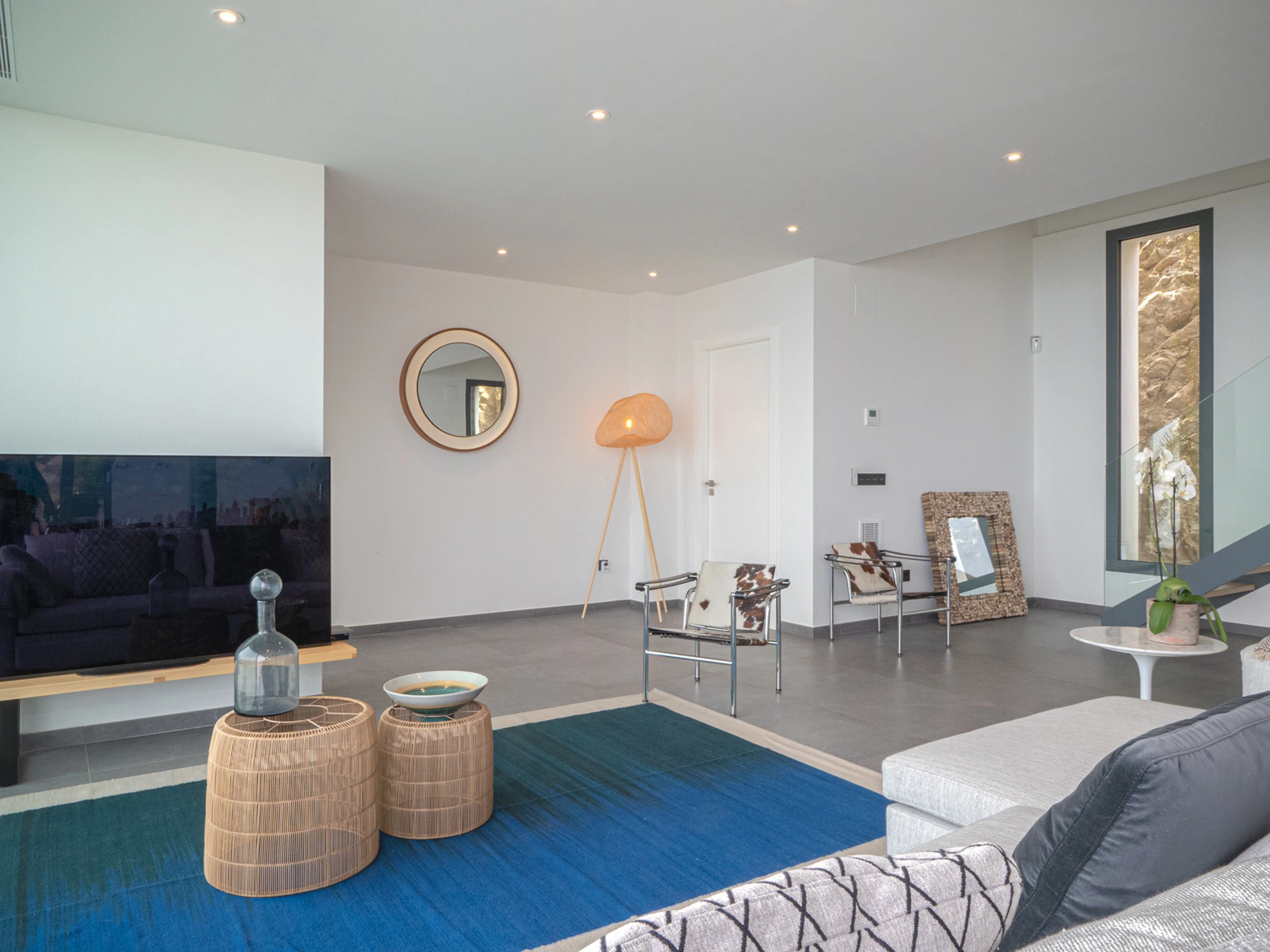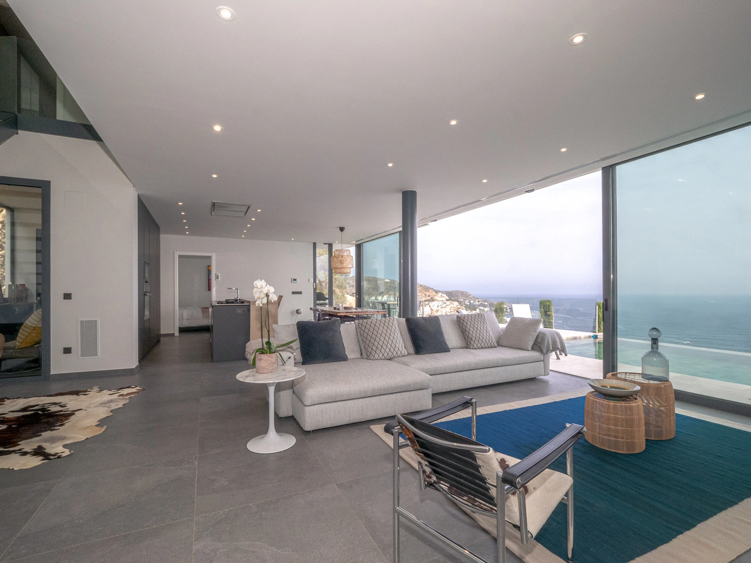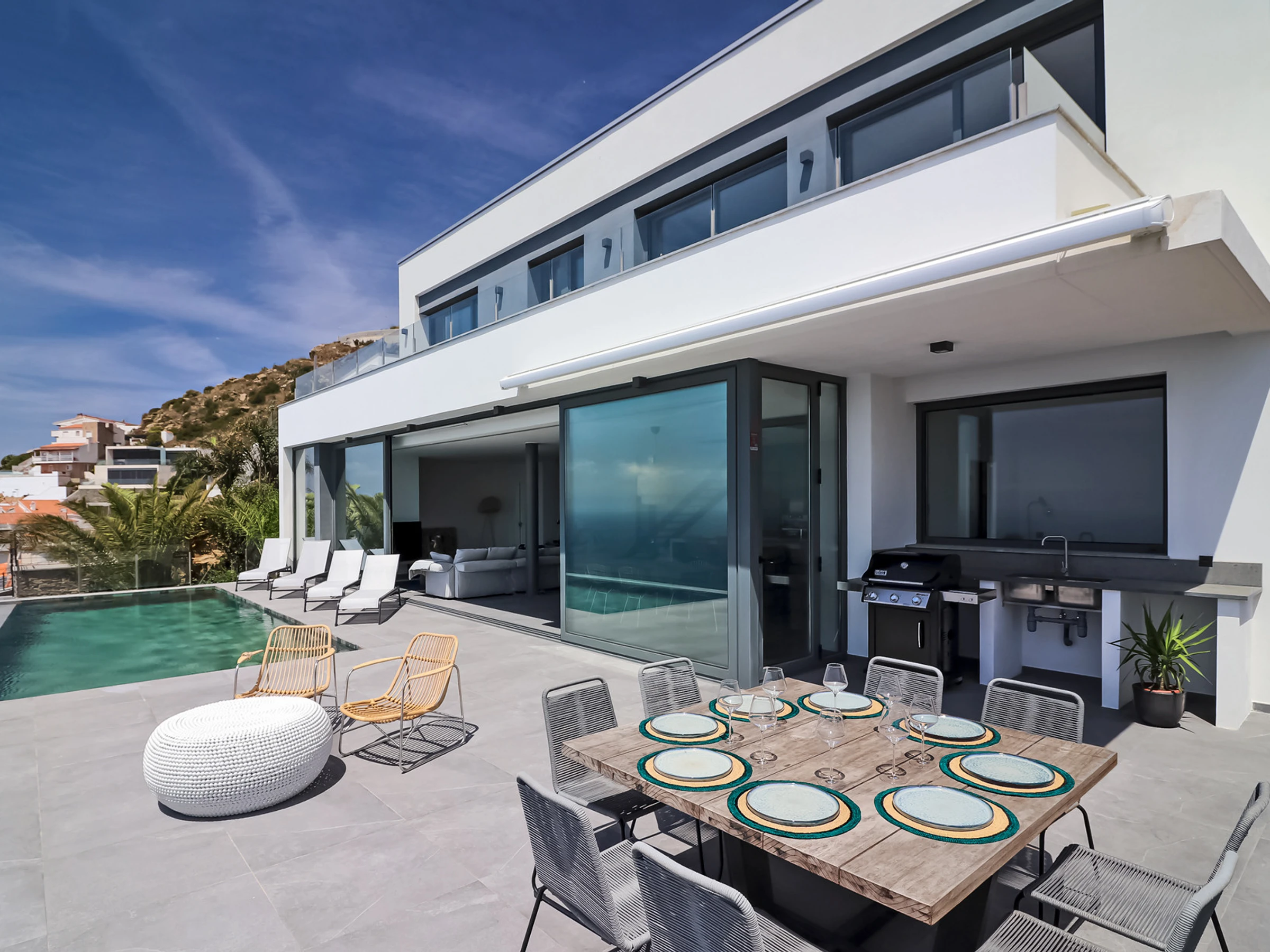 Au rez-de-chaussée, il y a une chambre double, une salle de bain complète, une cuisine américaine avec des finitions de haute qualité, où vous pourrez cuisiner une paella avec vue sur la mer et vous reposer dans le spacieux salon-salle à manger avec un grand écran végétal. Au même étage, on retrouve la terrasse impeccable avec plusieurs transats pour bronzer, une magnifique piscine à débordement et un espace pour les amateurs de braises, avec un barbecue à gaz Weber dernier cri.