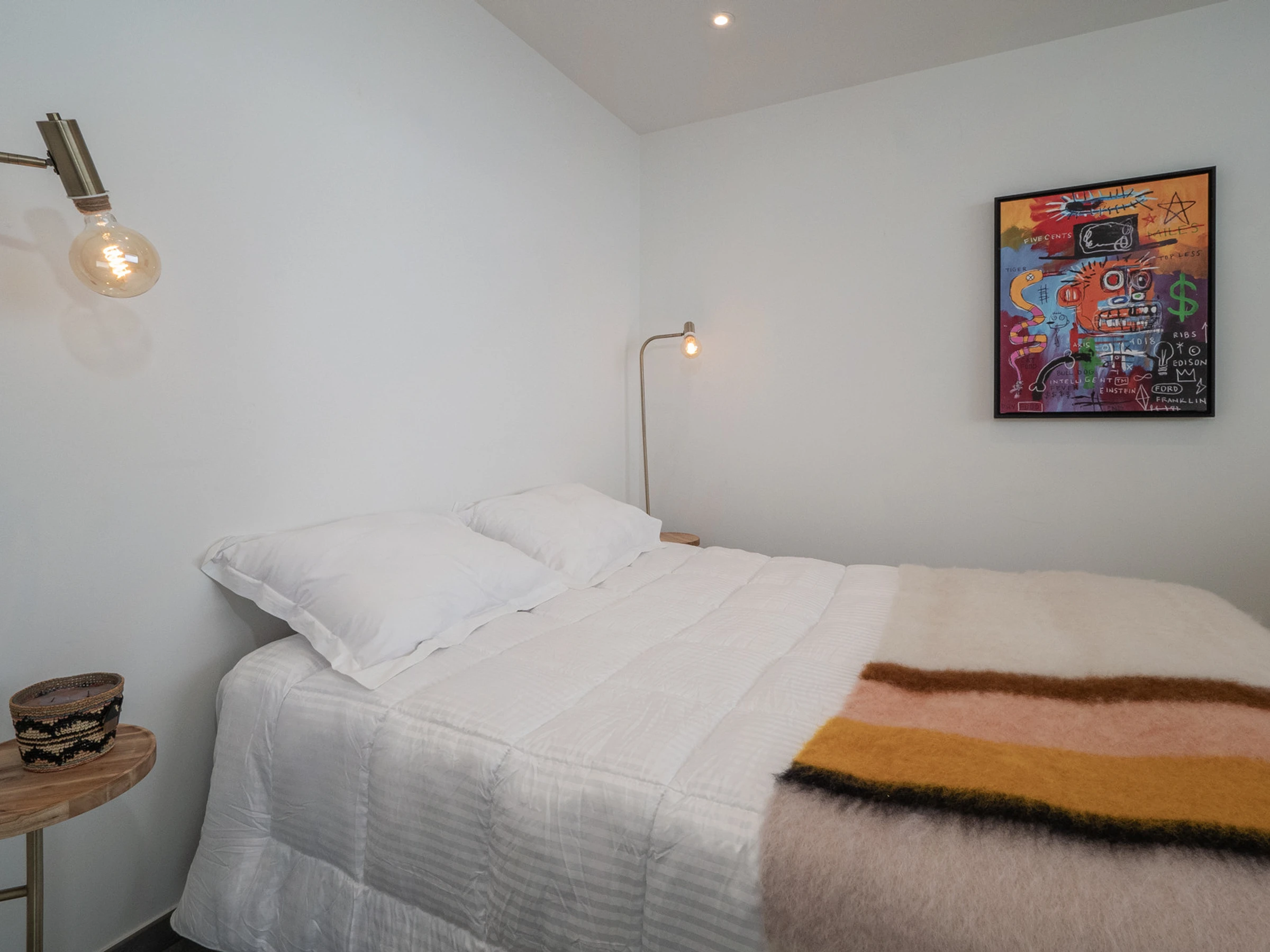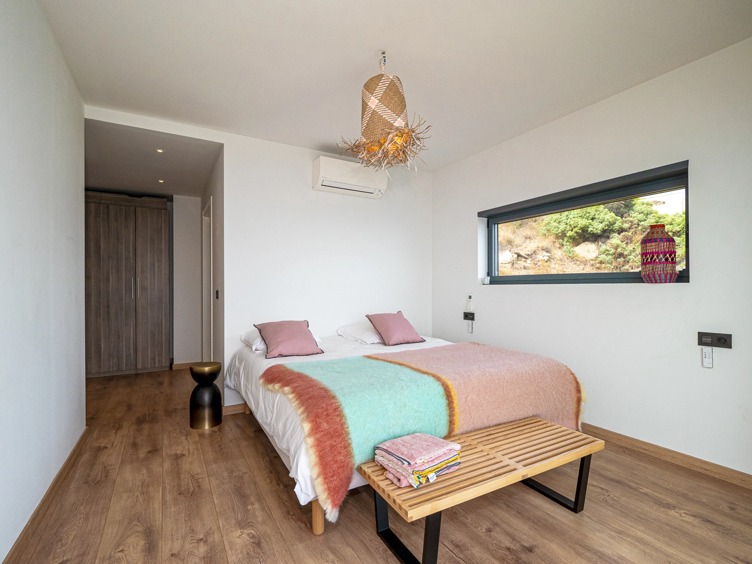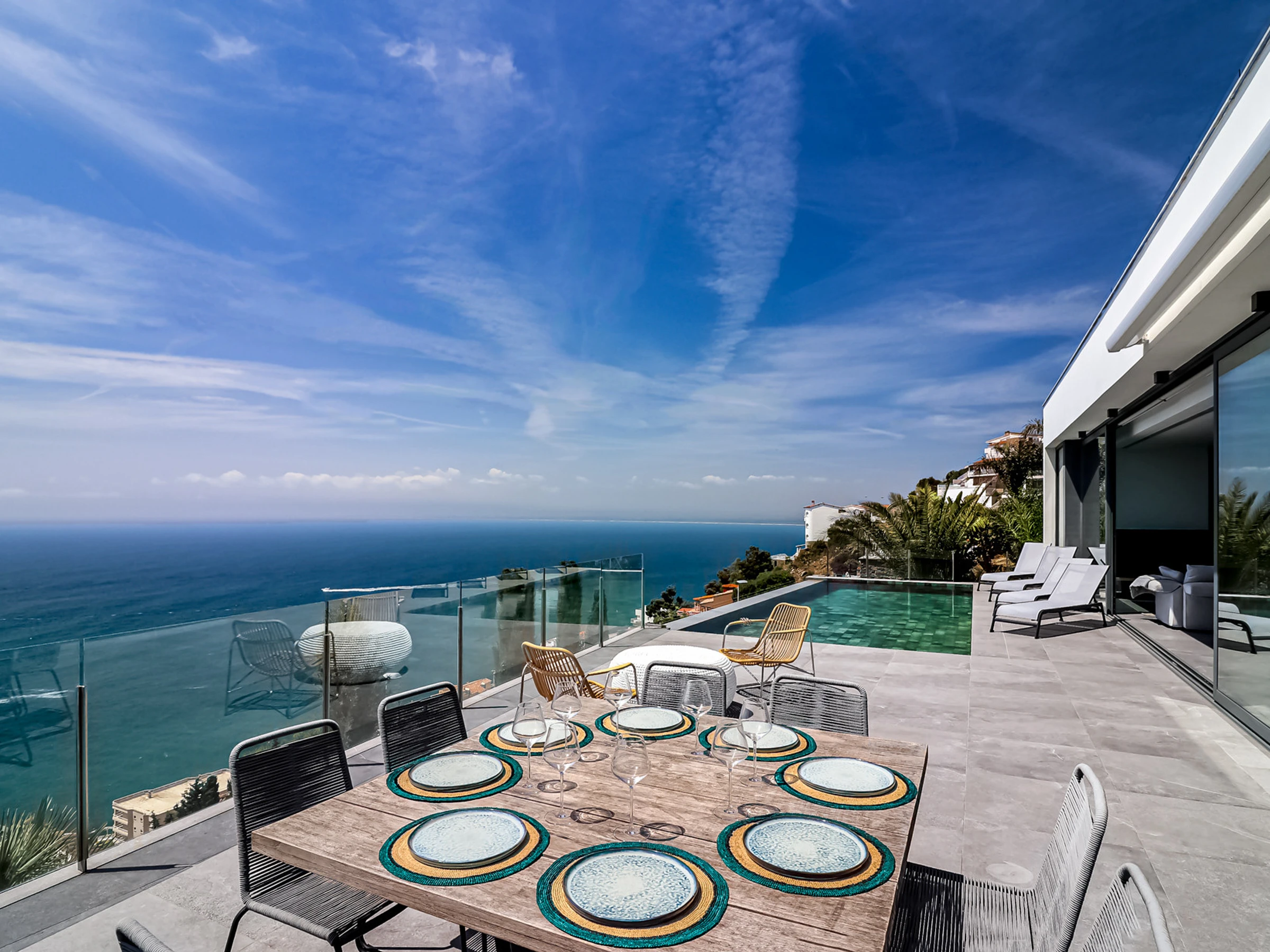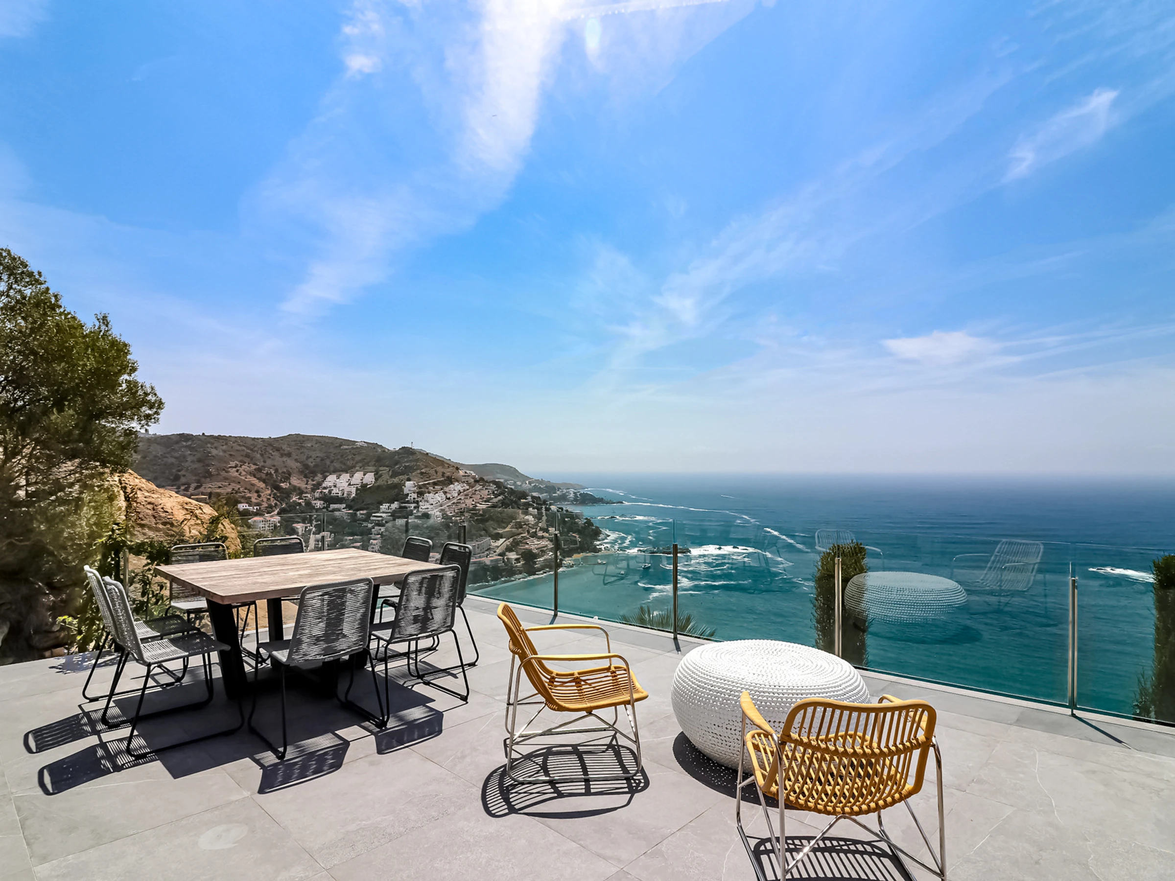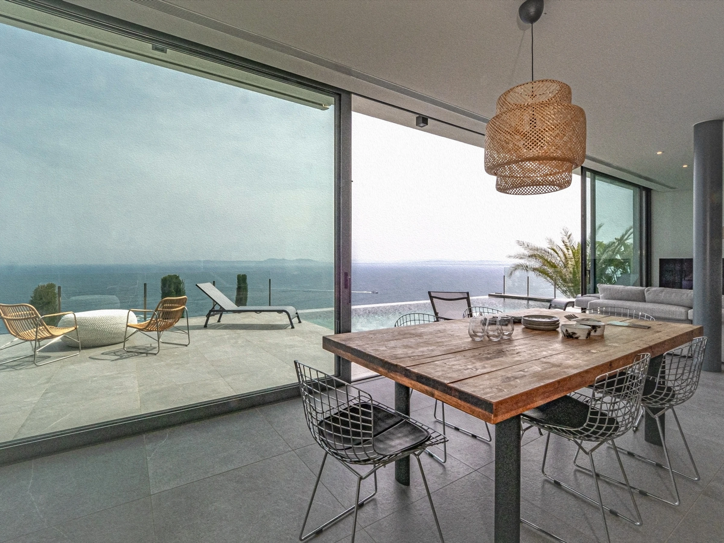 Au rez-de-chaussée, il y a une chambre double, une salle de bain complète, une cuisine américaine avec des finitions de haute qualité, où vous pourrez cuisiner une paella avec vue sur la mer et vous reposer dans le spacieux salon-salle à manger avec un grand écran végétal. Au même étage, on retrouve la terrasse impeccable avec plusieurs transats pour bronzer, une magnifique piscine à débordement et un espace pour les amateurs de braises, avec un barbecue à gaz Weber dernier cri.