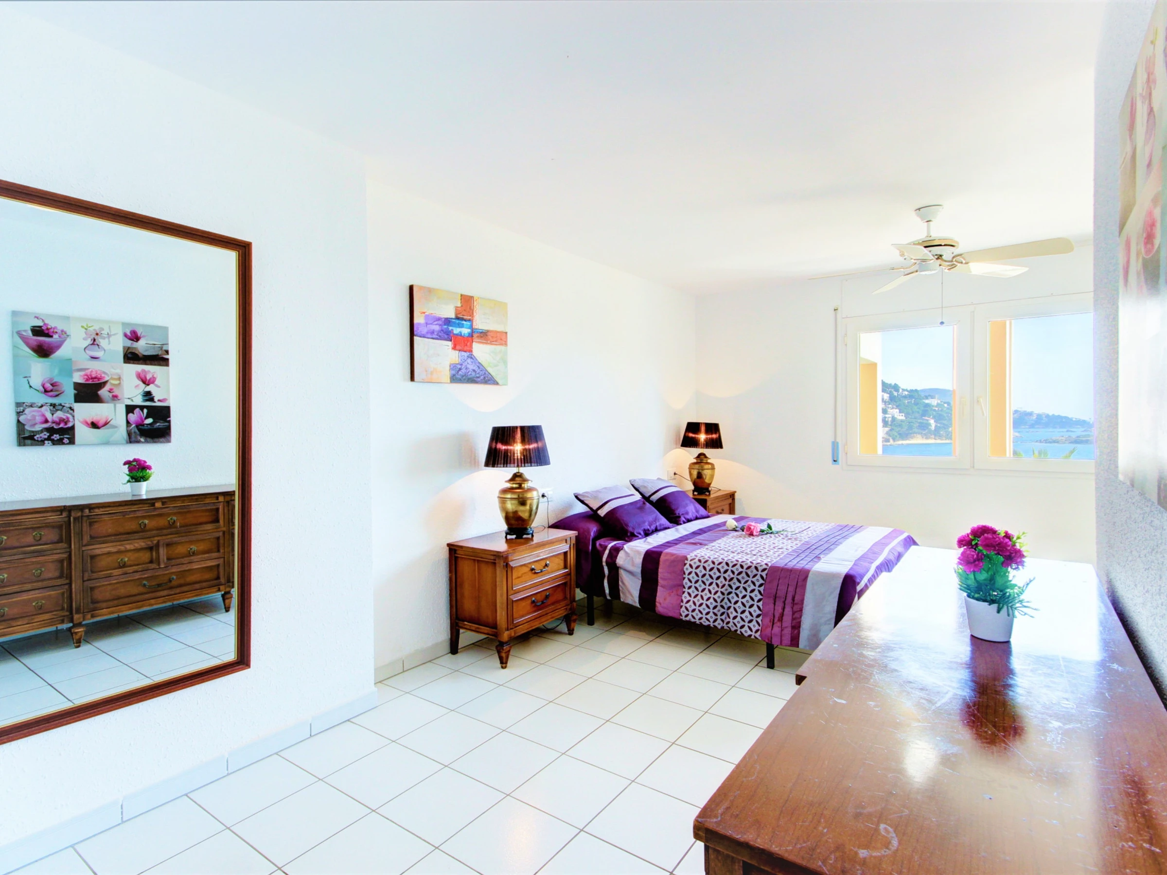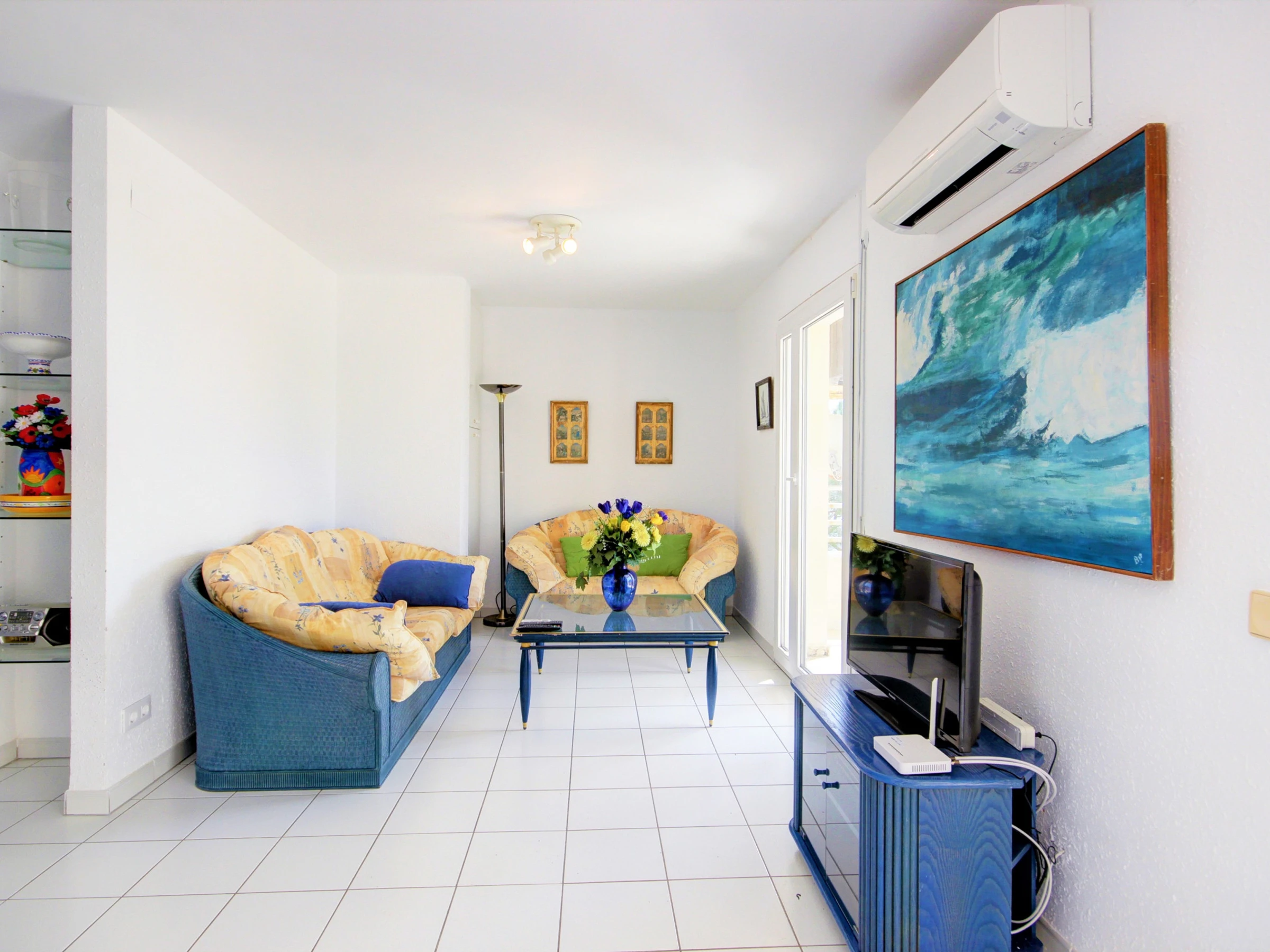- Salon/salle-à-manger avec grande baie vitrée qui donne sur la terrasse avec vue splendide sur la mer. Un canapé-lit, deux sofas, table, 6 chaises, buffet et tables d’appoint. TV satellite (chaînes gratuites dans toutes les langues).